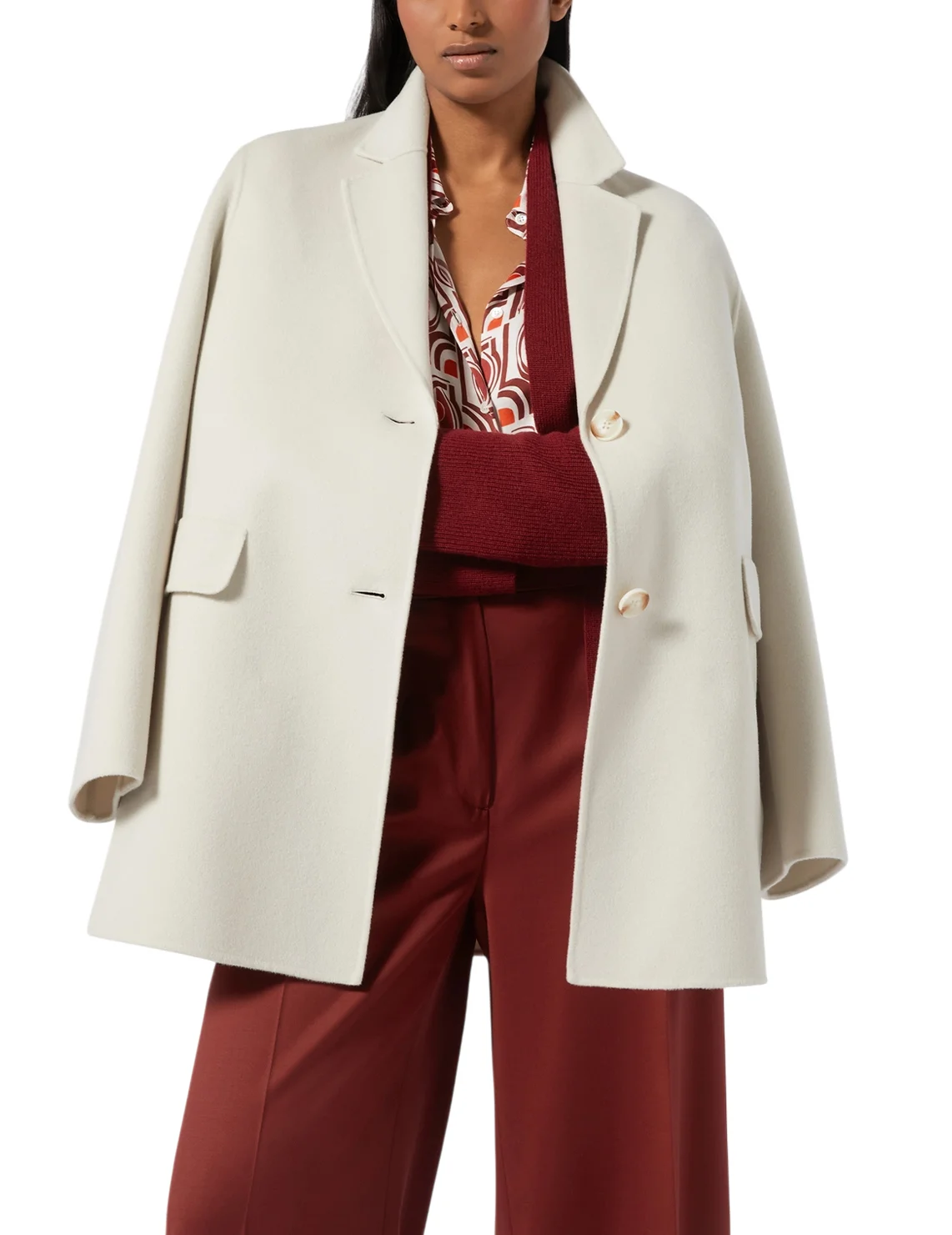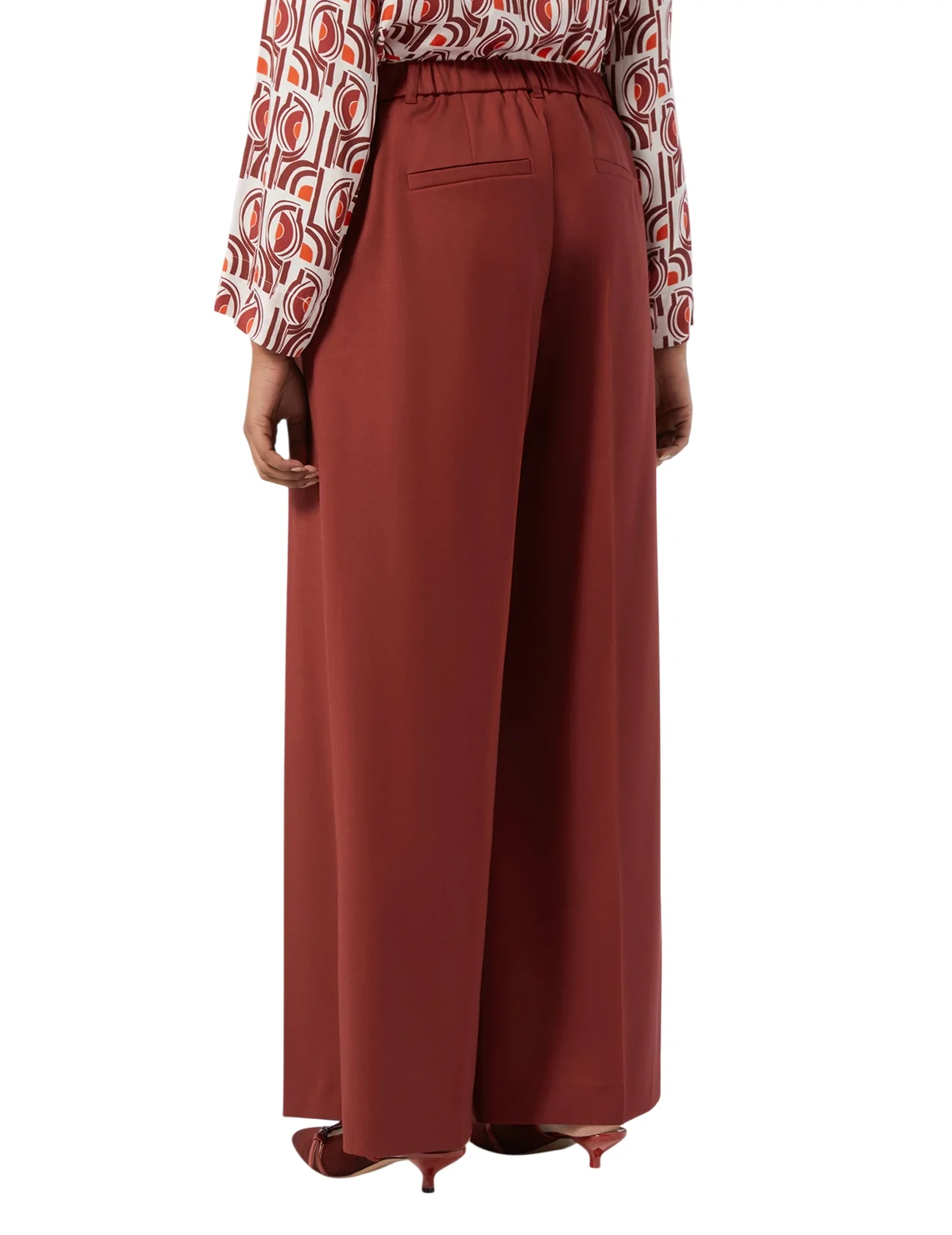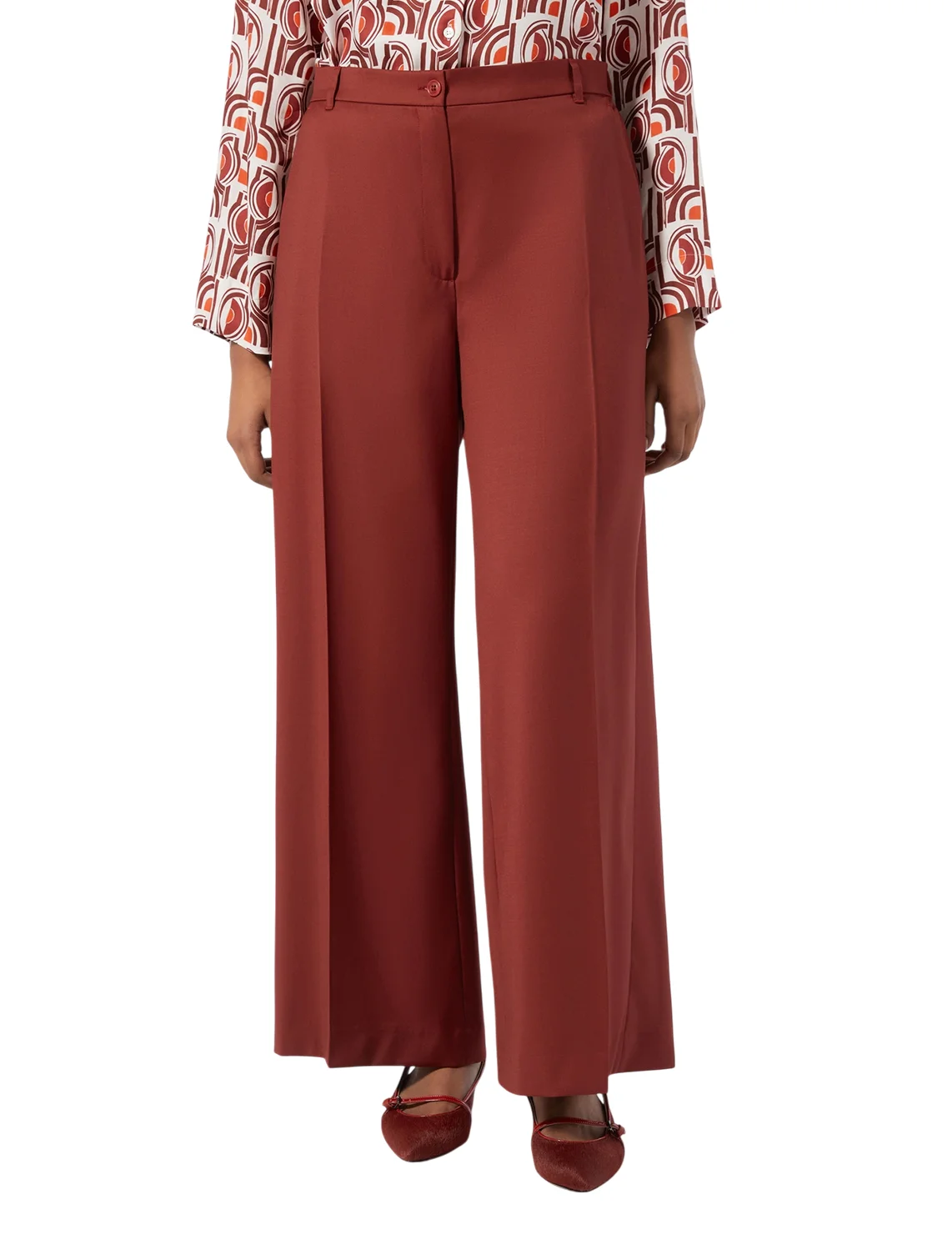Штани виготовлені з вовни, поліестеру та еластану. Модель виконана у вільному крої. Має еластичну вставку ззаду на поясі, приховану застібку-блискавку з ґудзиком, шлевки для ременя, пресовані стрілки, прорізні кишені з боків та ззаду.