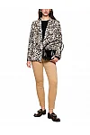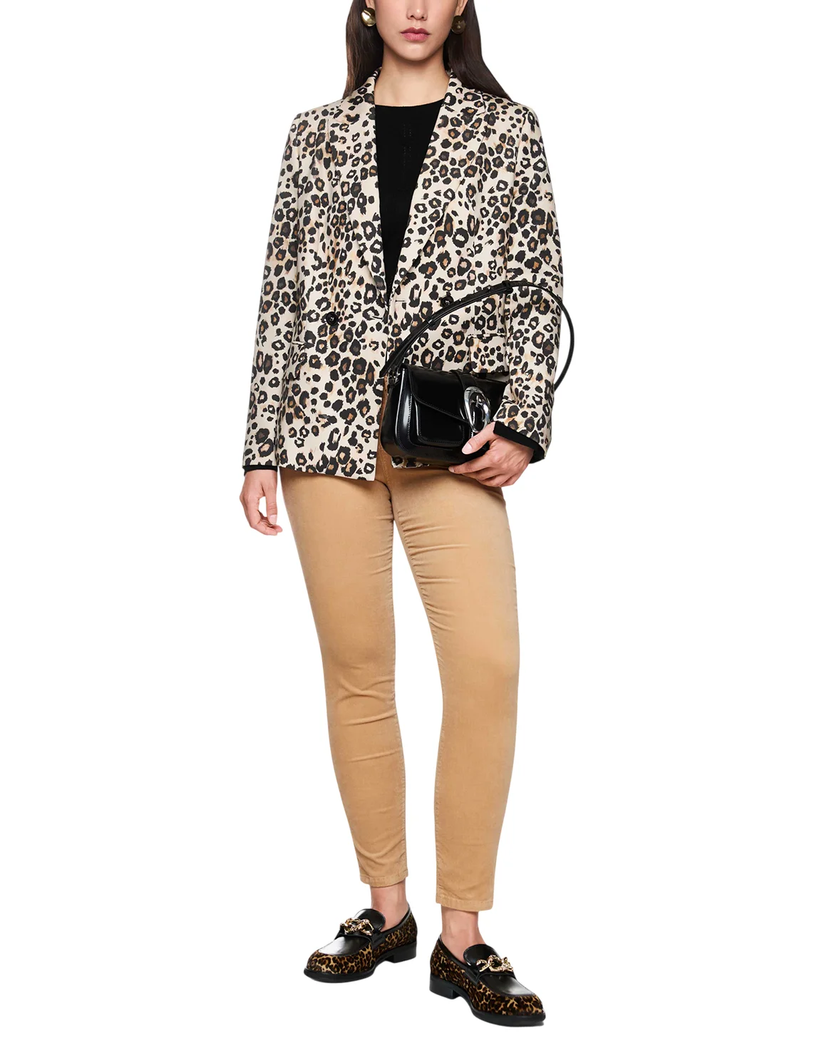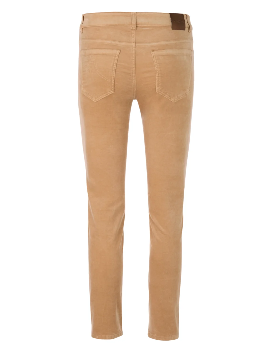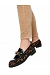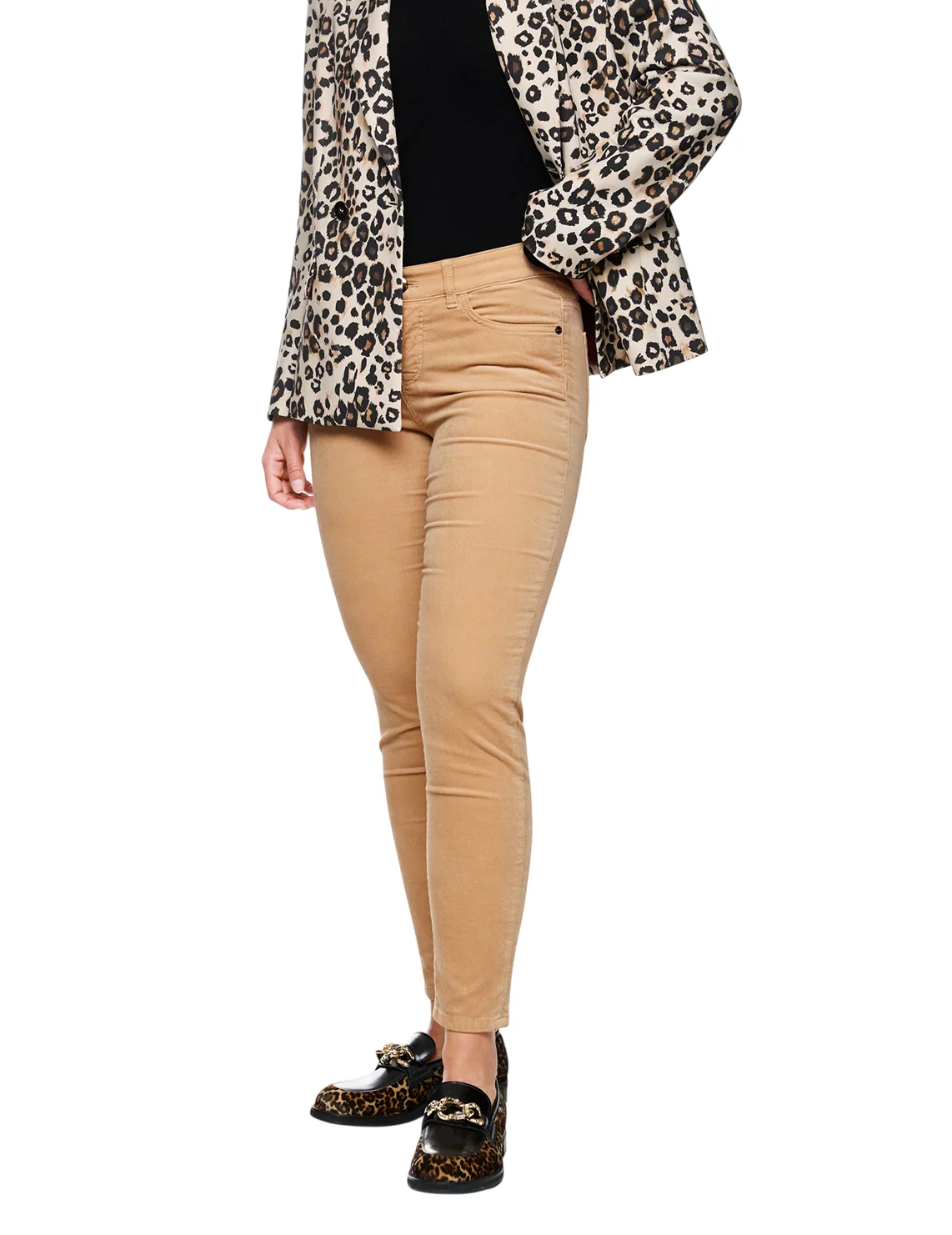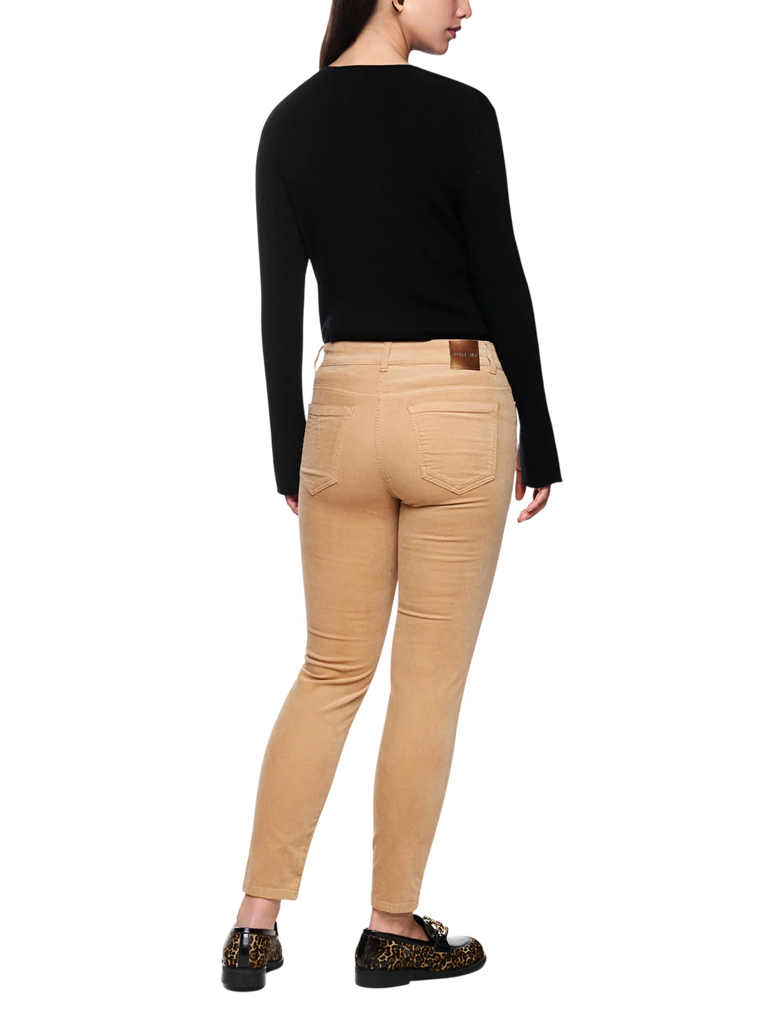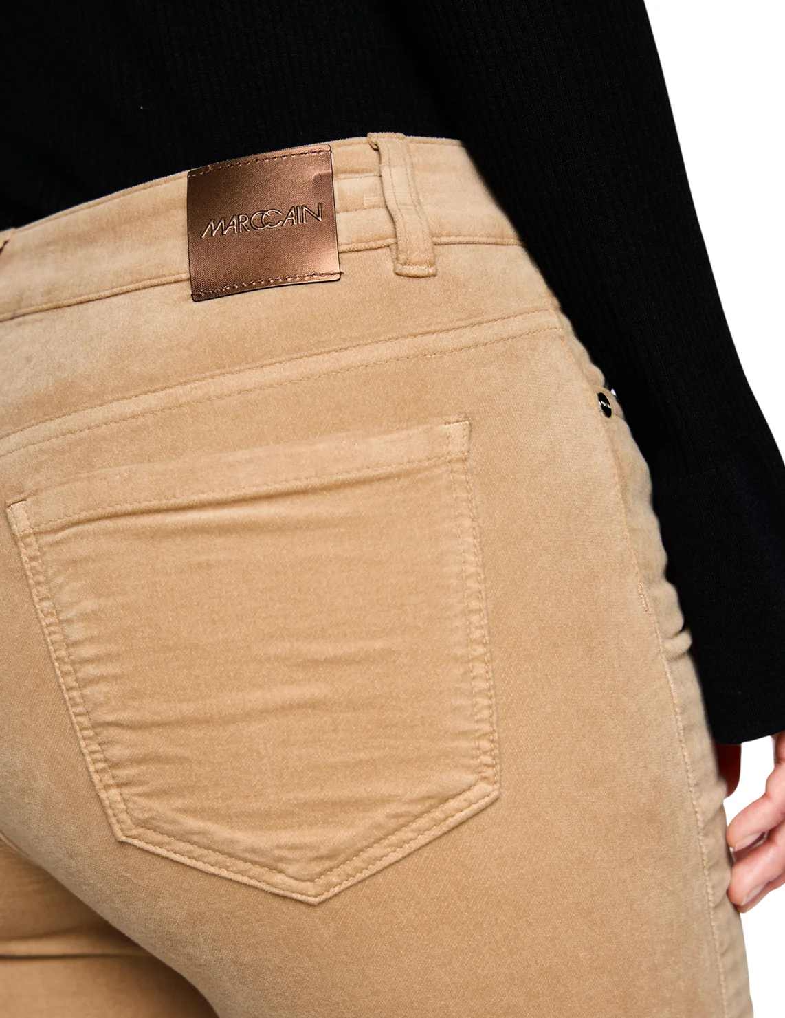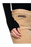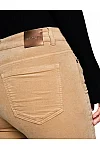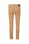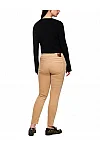 Штани виготовлені з бавовни, модалу, поліестеру та лайкри. Модель виконана в звуженому крої. Має петлі для ременя, приховану застібку-блискавку з ґудзиком, а також пару передніх прорізних і пару задніх накладних кишень. Декоровані стразами та бісером.