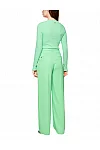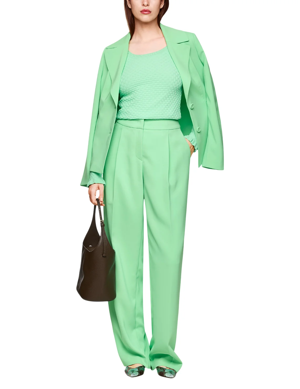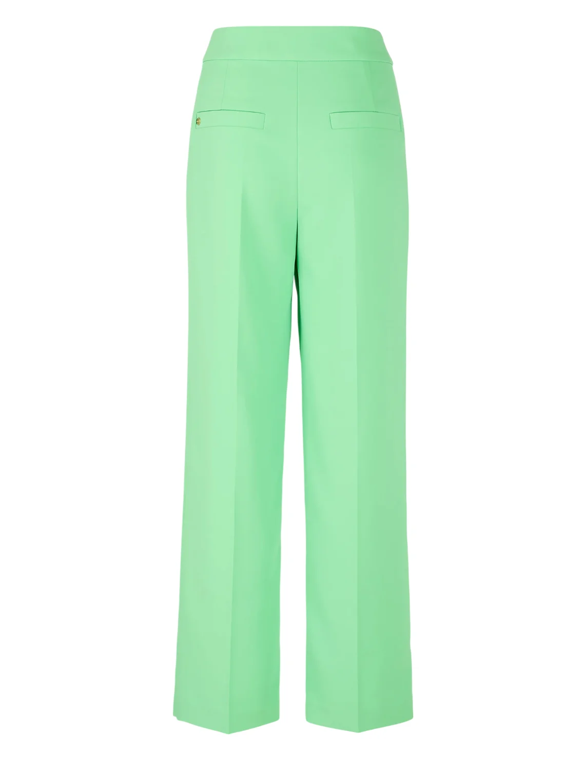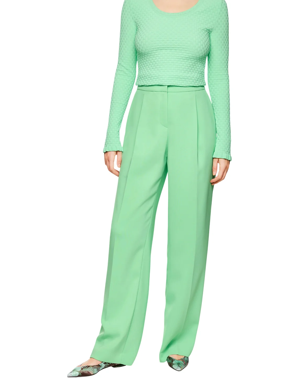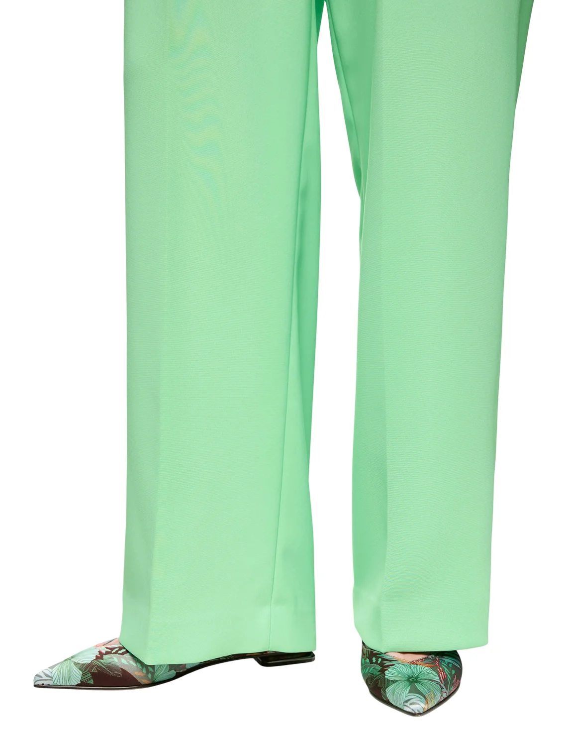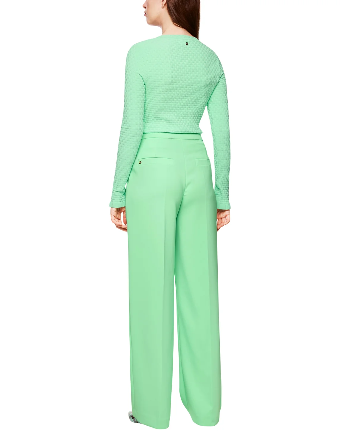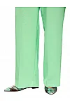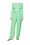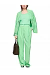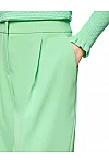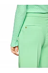Штани виготовлені з поліестеру й еластану. Модель виконана у вільному крої. Має пресовані стрілки, потаємну застібку-блискавку з гачком і ґудзиком, декоративні складки, дві бічні та дві задні прорізні кишені.