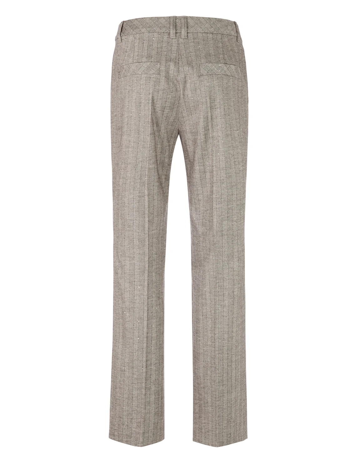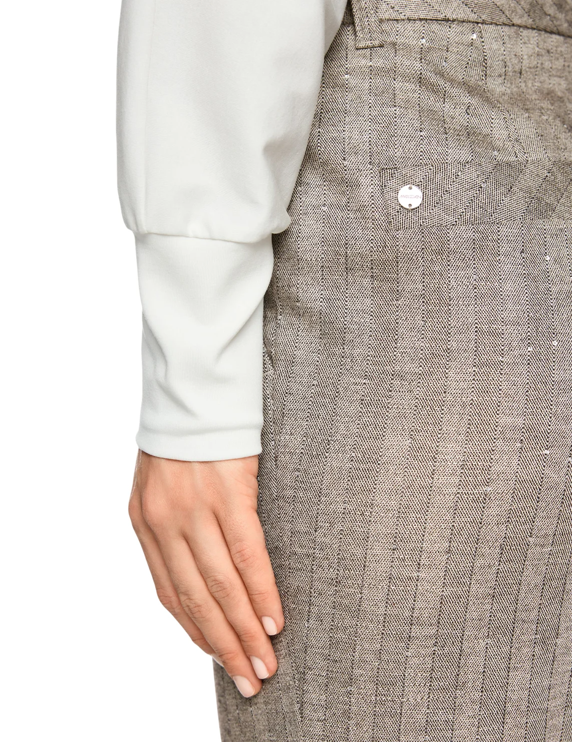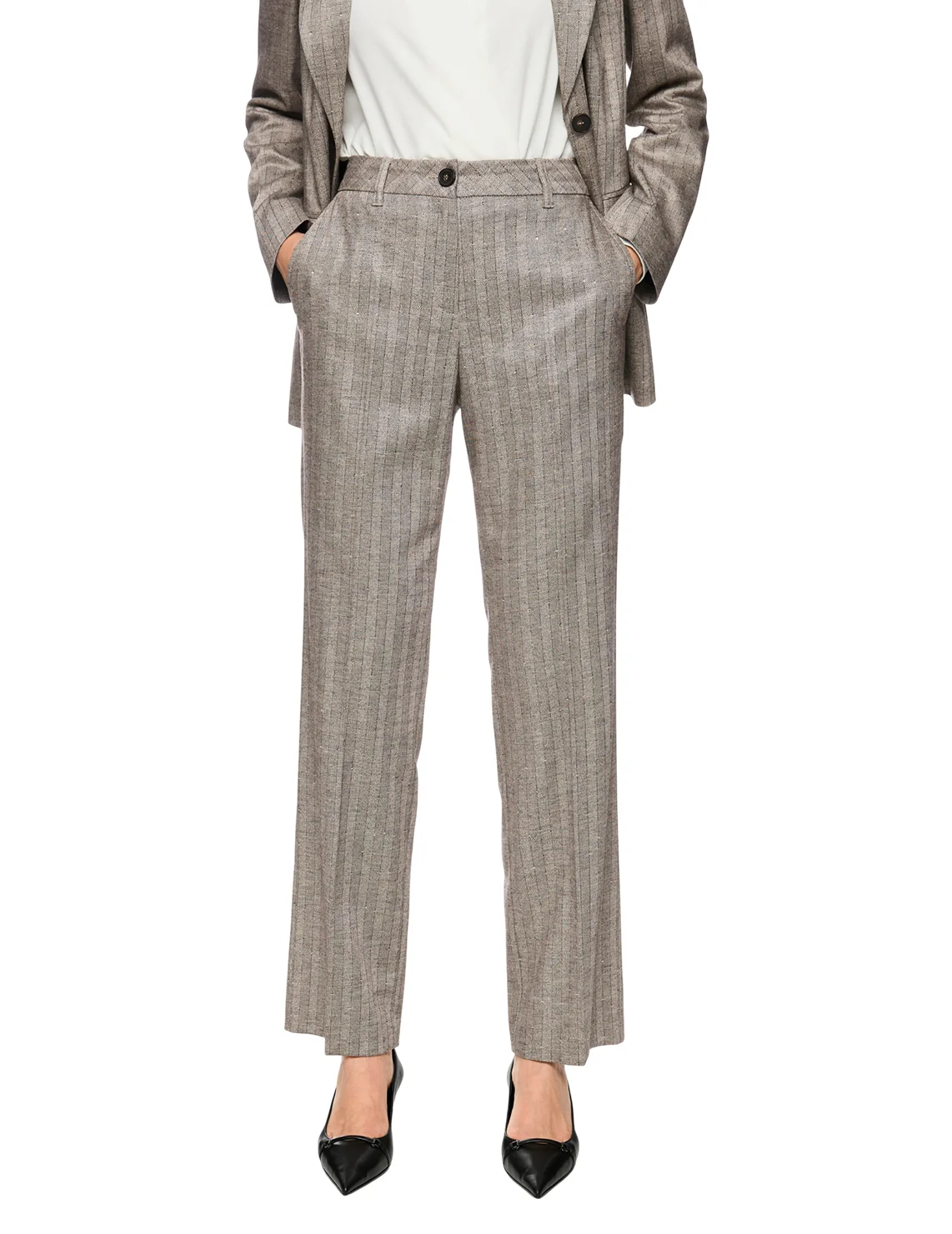 Штани виготовлені з віскози, поліестеру, вовни та еластану. Модель виконана в прямому крої. Має петлі для ременя, приховану застібку-блискавку з ґудзиком, пресовані стрілки та прорізні кишені. Декоровані принтом у смужку.