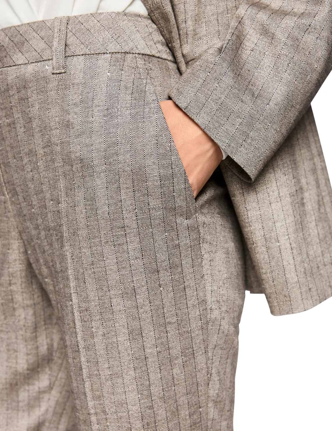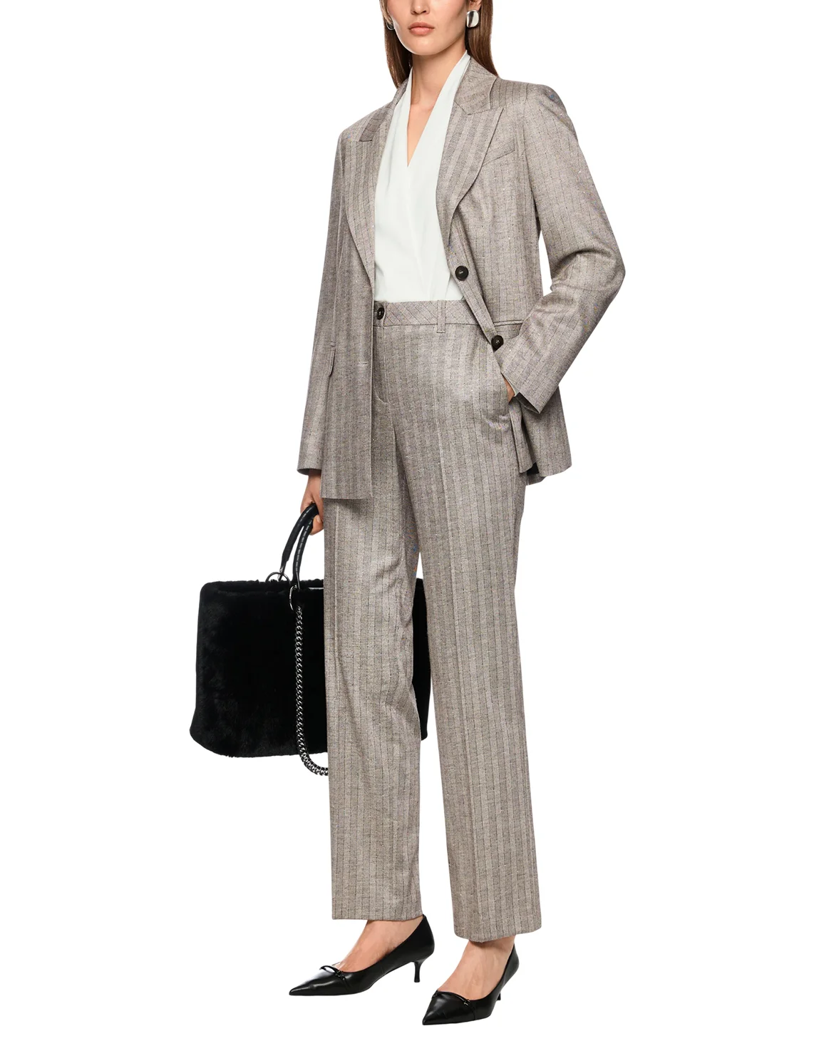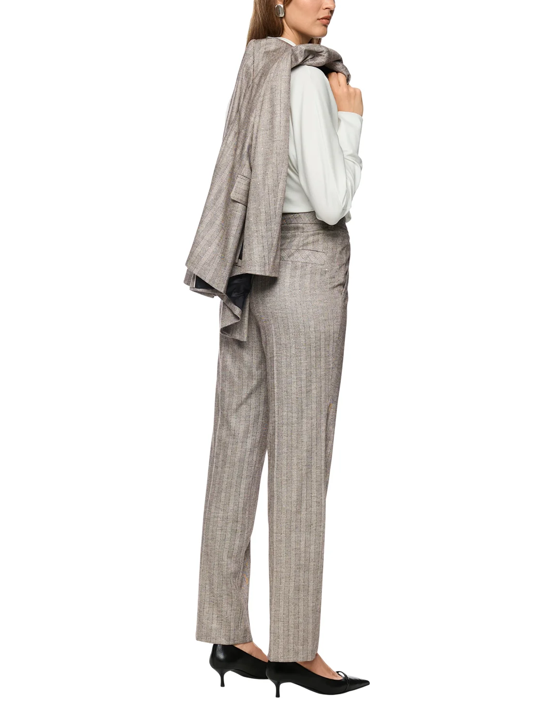 Штани виготовлені з віскози, поліестеру, вовни та еластану. Модель виконана в прямому крої. Має петлі для ременя, приховану застібку-блискавку з ґудзиком, пресовані стрілки та прорізні кишені. Декоровані принтом у смужку.