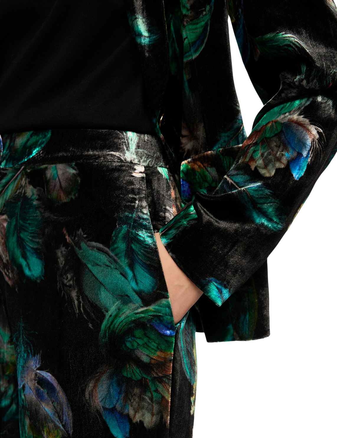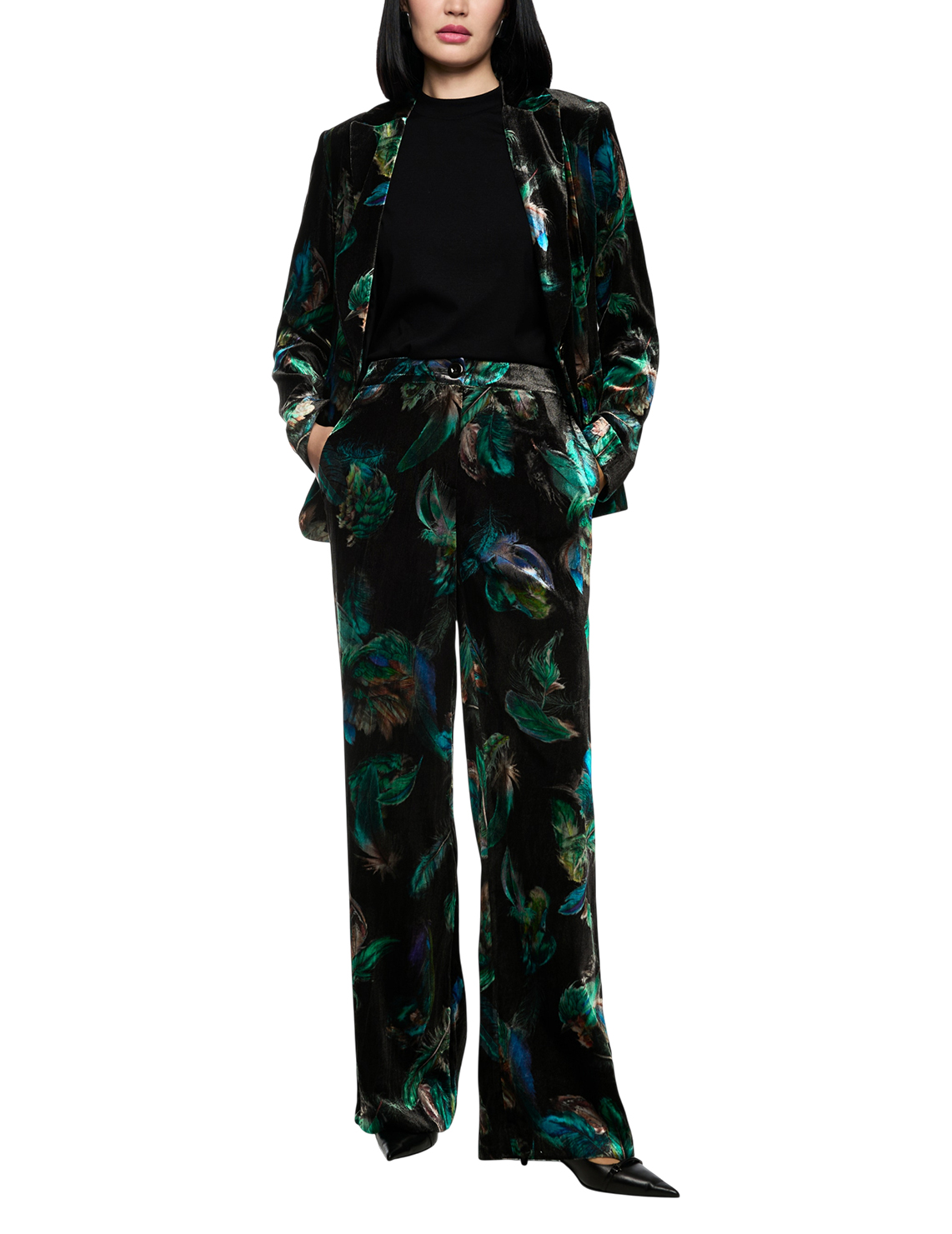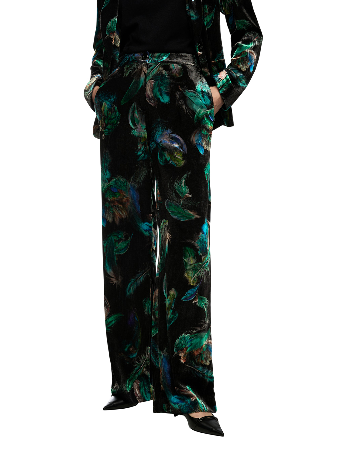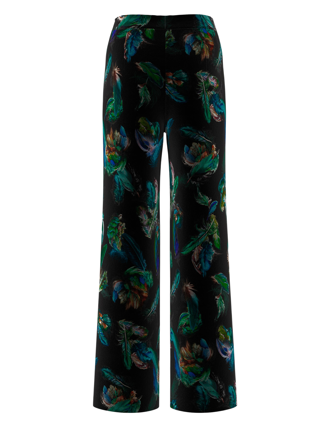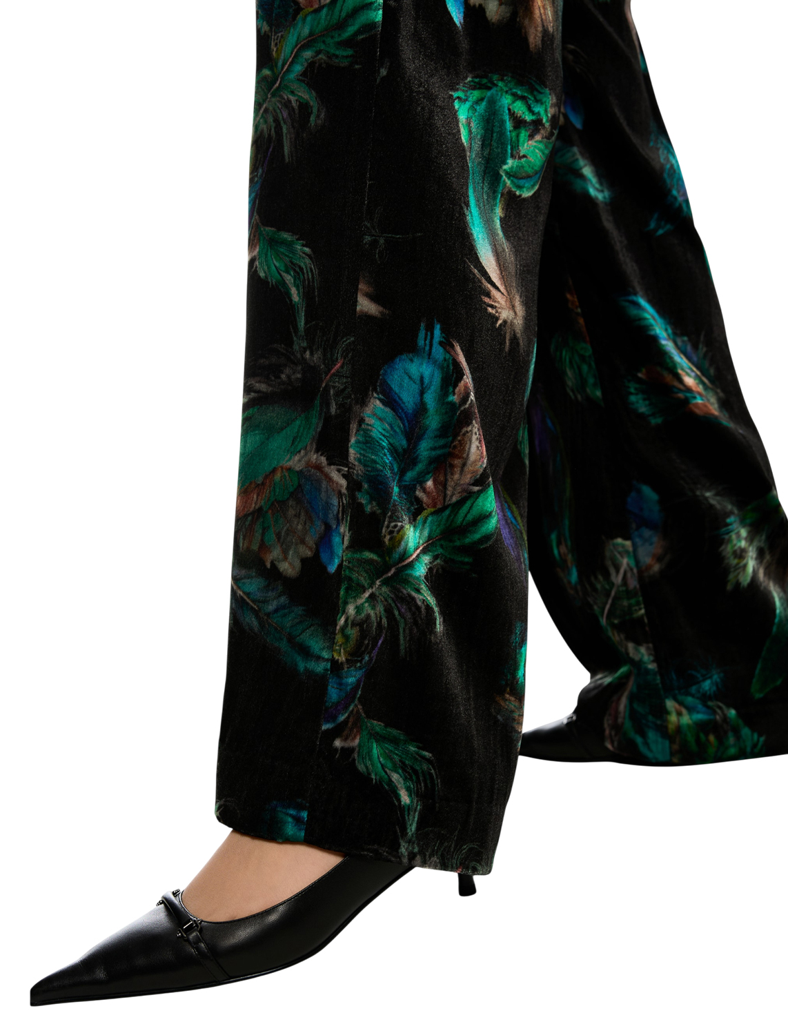 Штани виготовлені з віскози та поліаміду. Модель виконана у вільному крої. Має приховану застібку-блискавку з ґудзиком, прорізні бічні кишені та оригінальний принт.