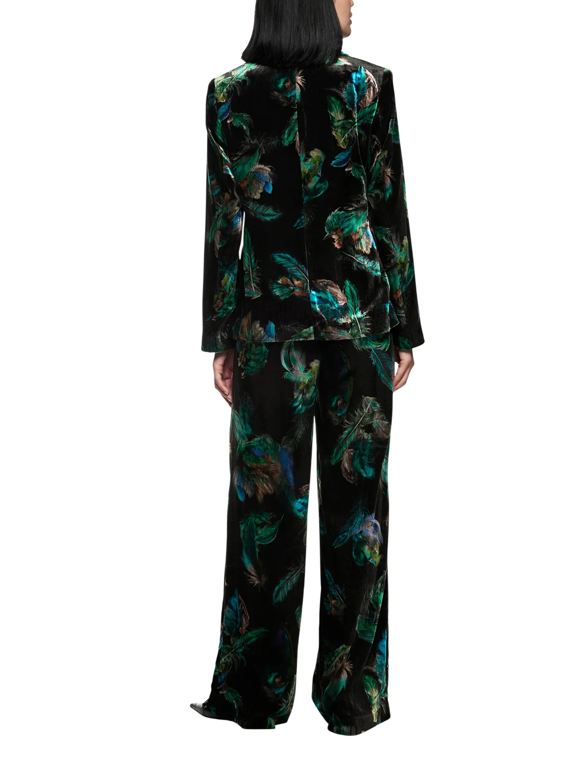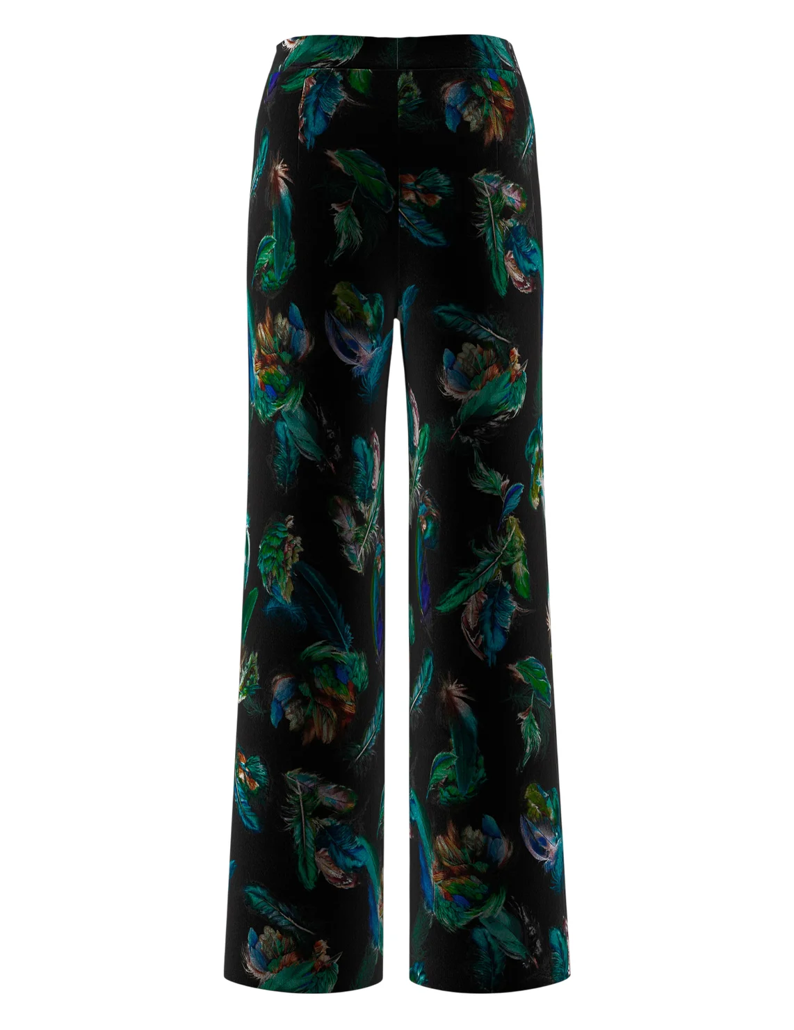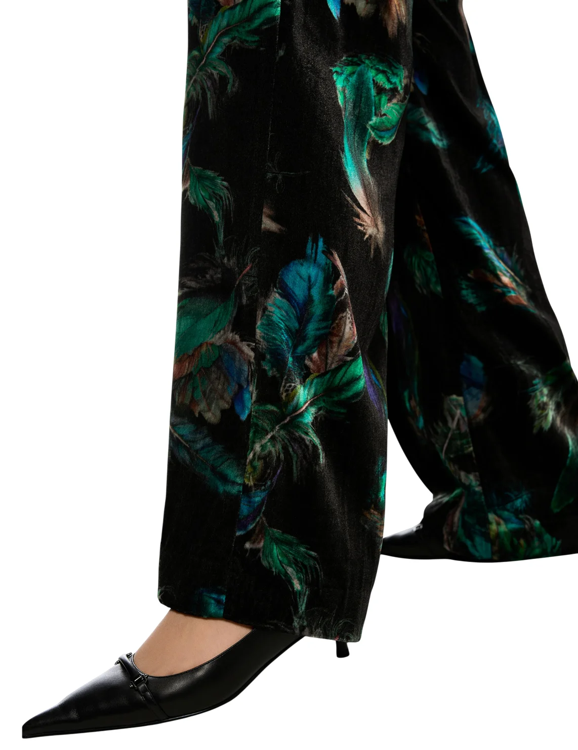 Штани виготовлені з віскози та поліаміду. Модель виконана у вільному крої. Має приховану застібку-блискавку з ґудзиком, прорізні бічні кишені та оригінальний принт.
