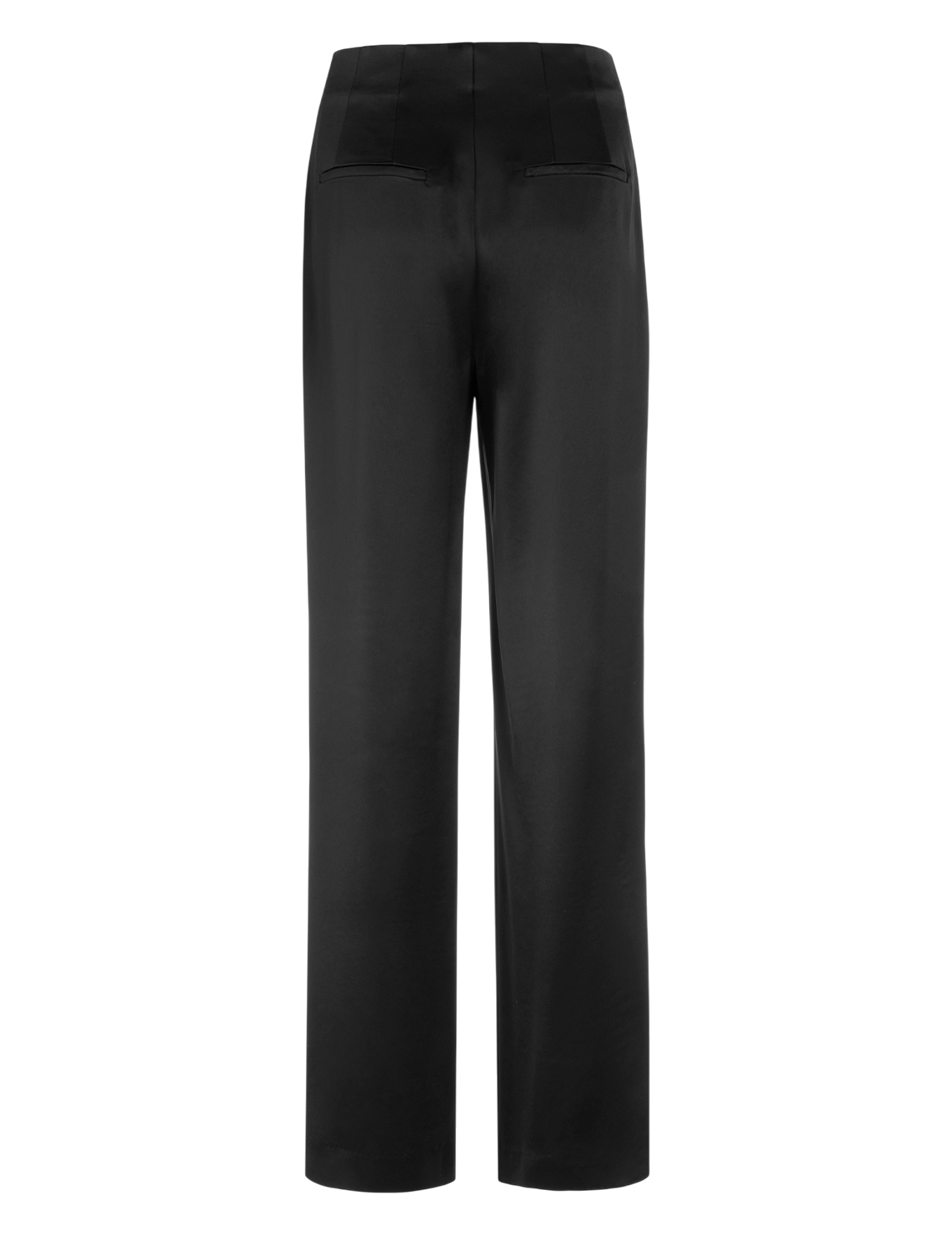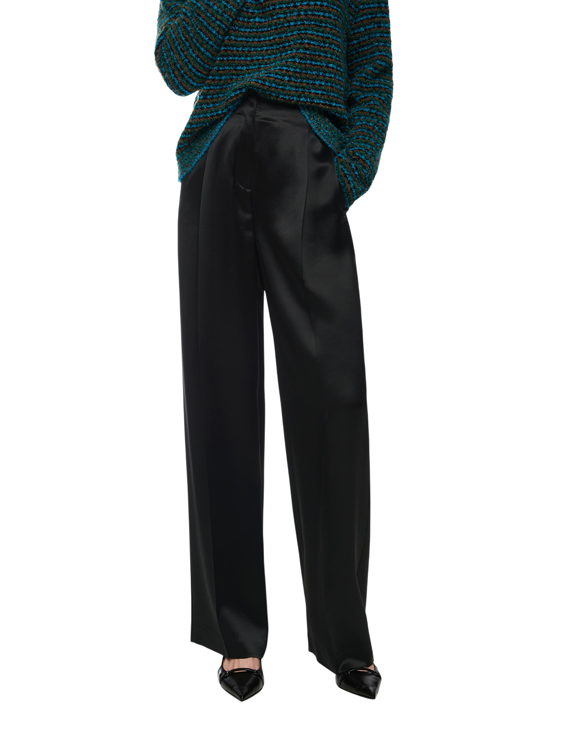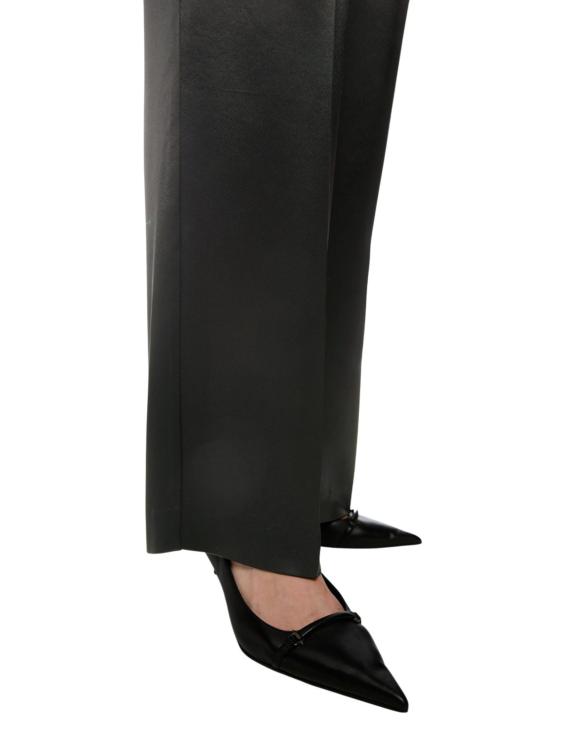 Штани виготовлені з ацетату та поліестеру. Модель виконана у вільному крої. Має складки, приховану застібку-блискавку з гачком, прорізні кишені та пресовані стрілки.