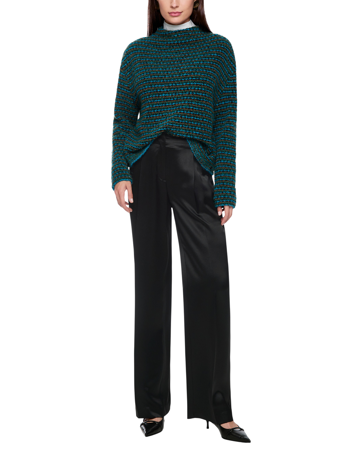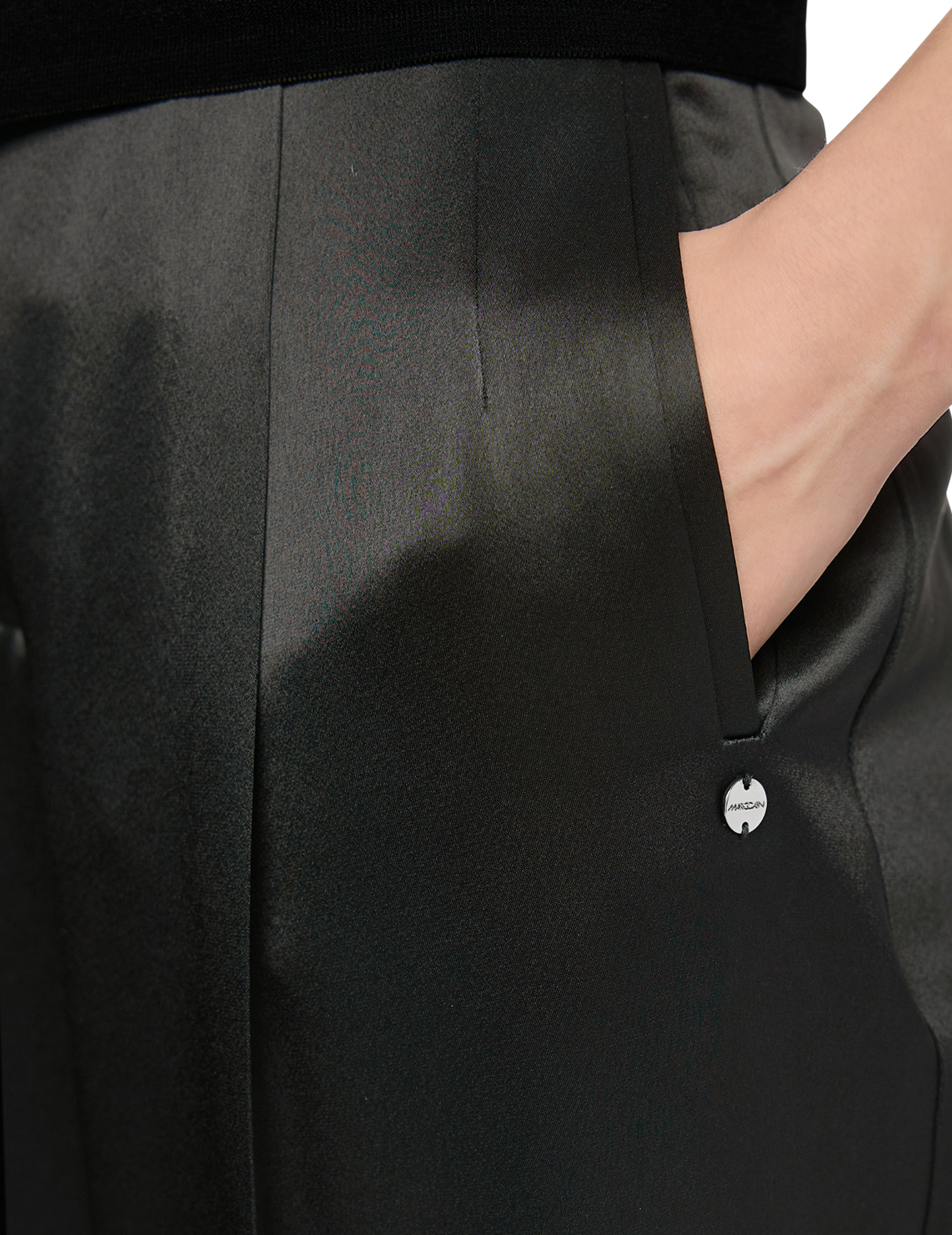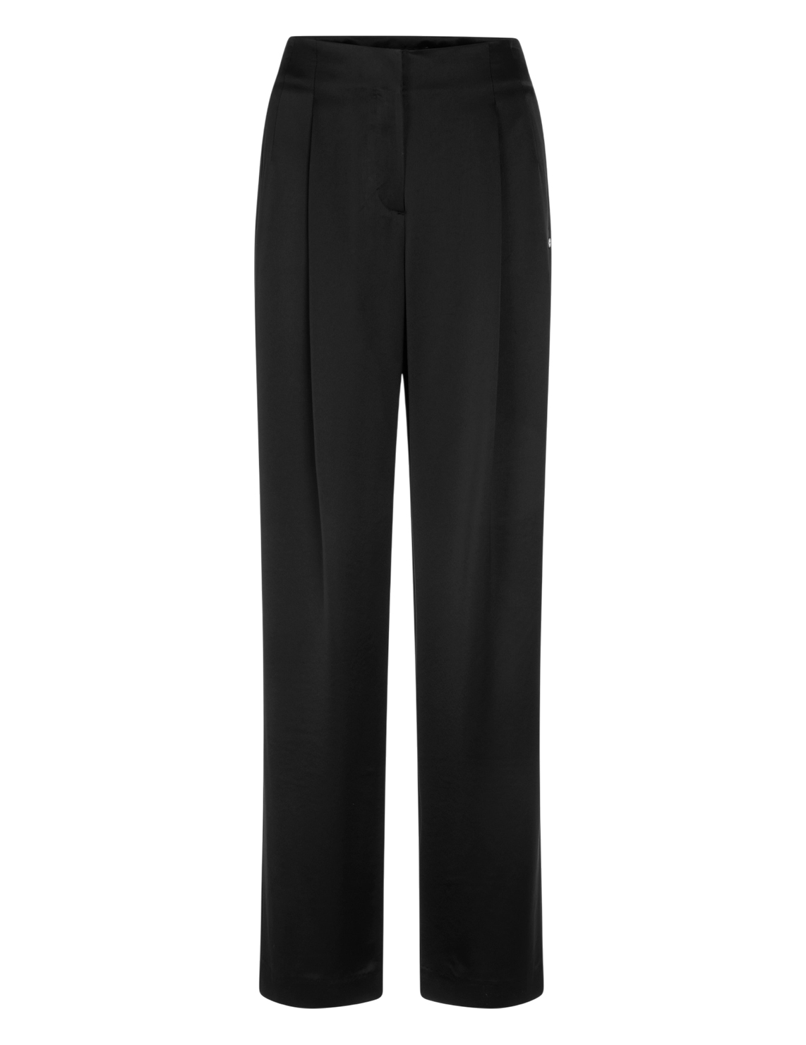Штани виготовлені з ацетату та поліестеру. Модель виконана у вільному крої. Має складки, приховану застібку-блискавку з гачком, прорізні кишені та пресовані стрілки.