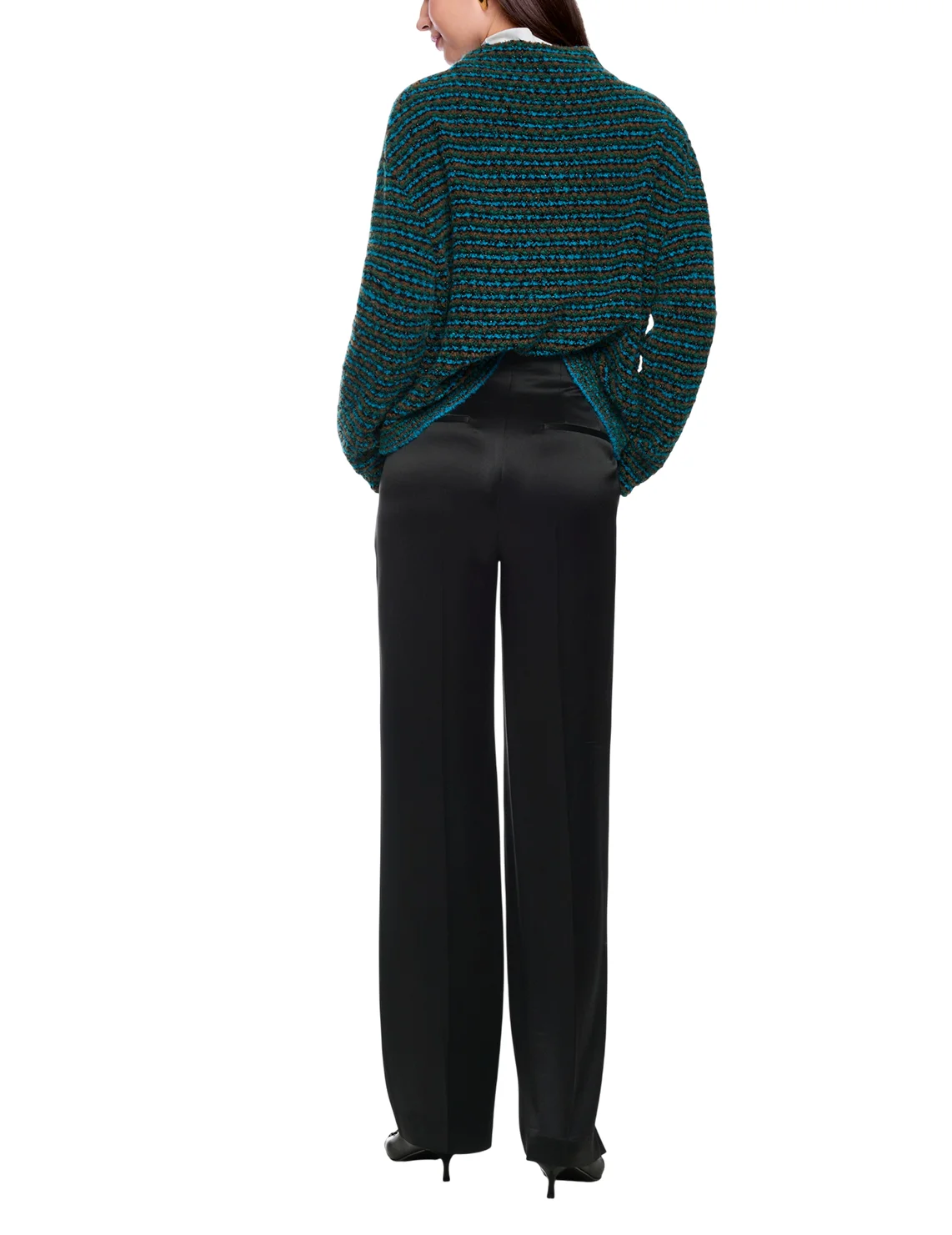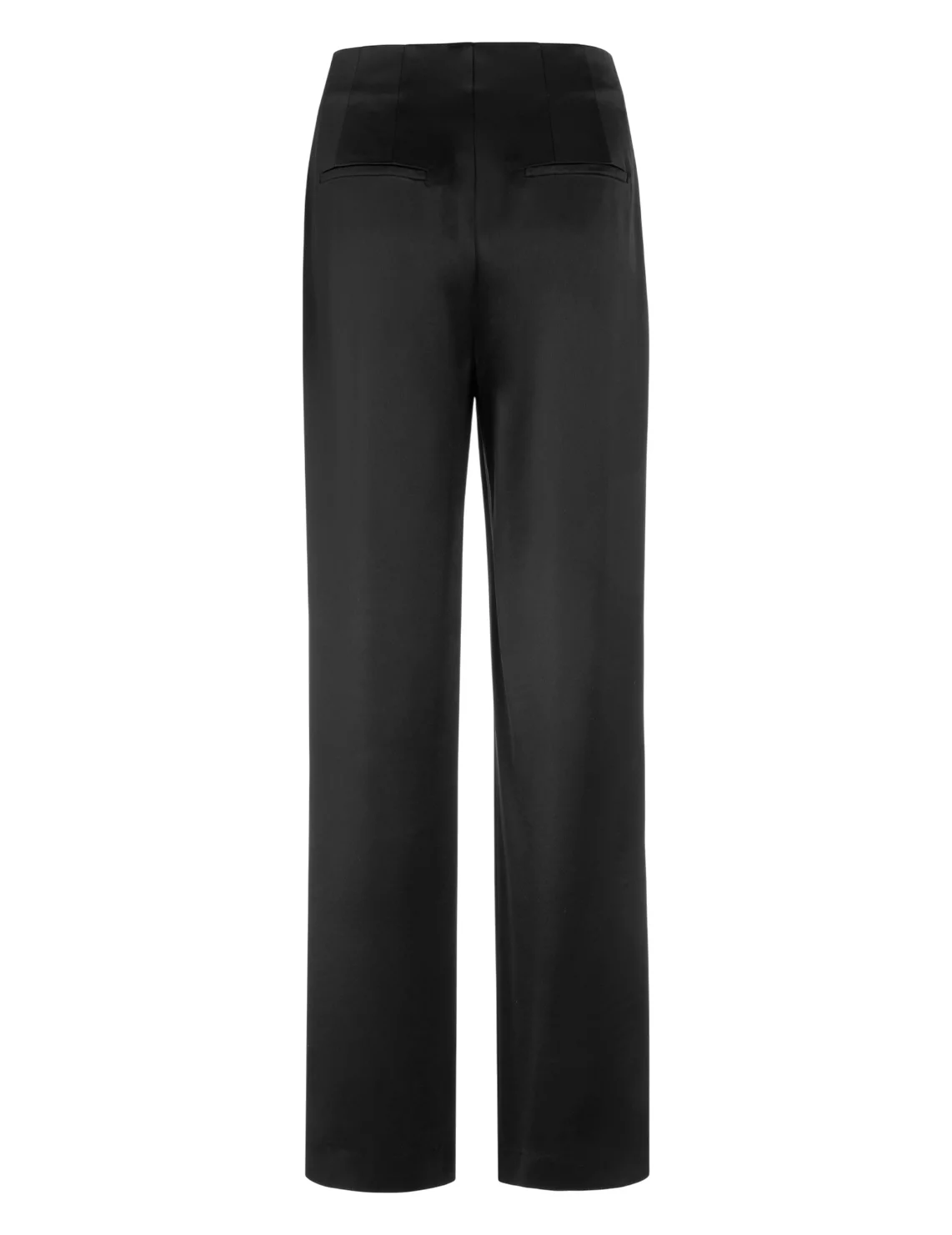 Штани виготовлені з ацетату та поліестеру. Модель виконана у вільному крої. Має складки, приховану застібку-блискавку з гачком, прорізні кишені та пресовані стрілки.
