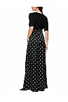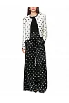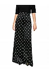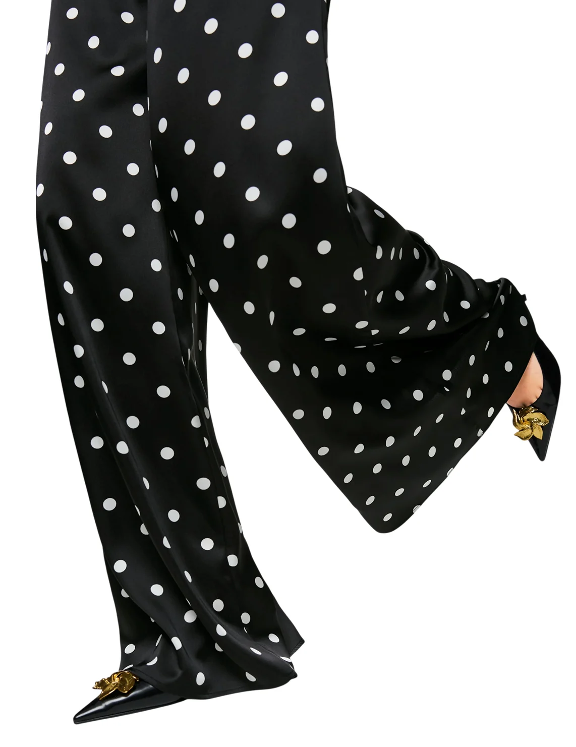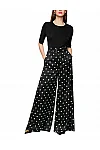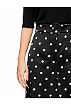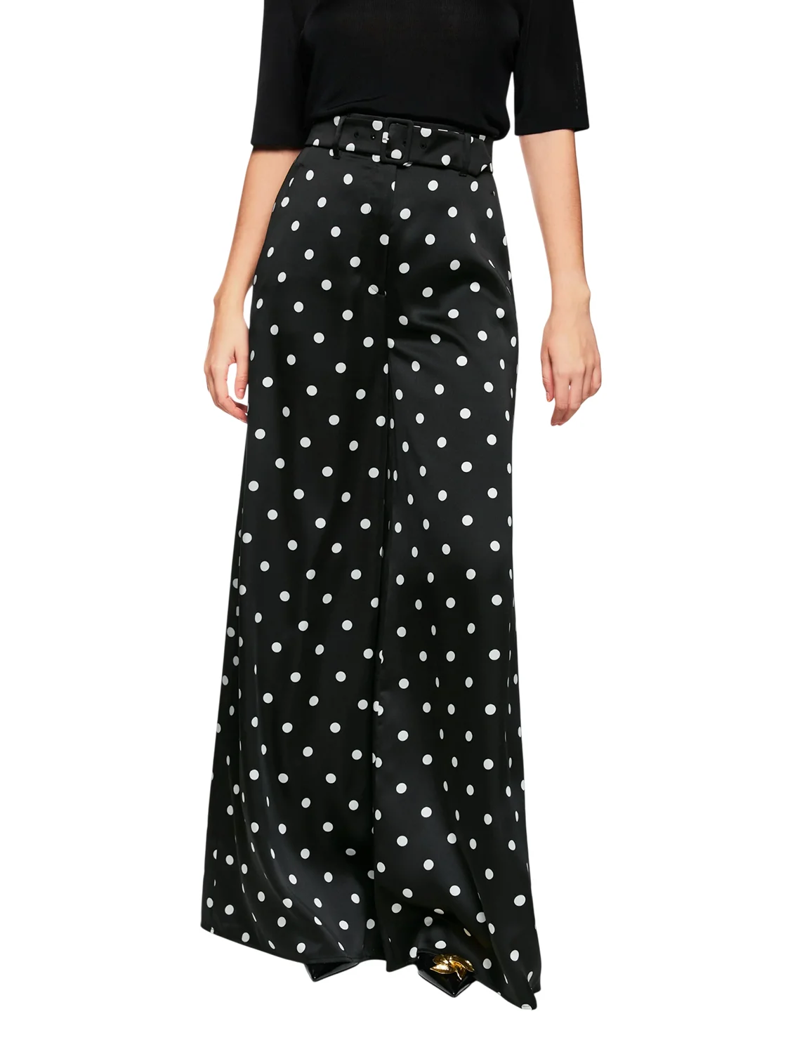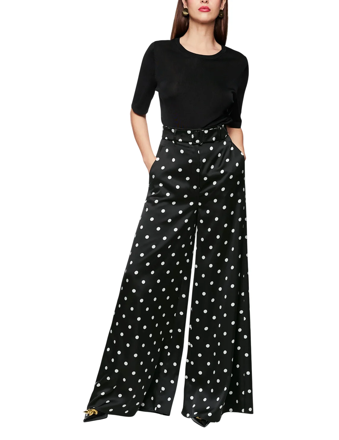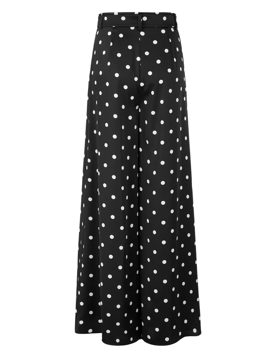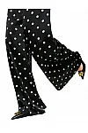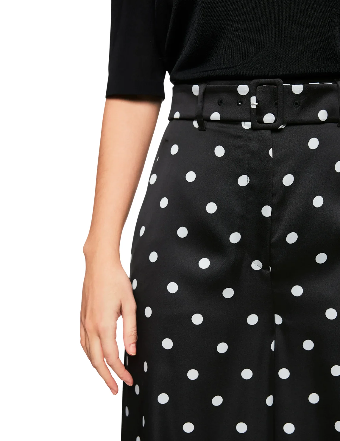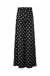 Штани виготовлені зі 100% поліестеру. Модель виконана у вільному крої. Має приховану застібку-блискавку з ґудзиком, шльовки для ременя, пояс у тон і прорізні кишені. Декоровані принтом у горошок.
