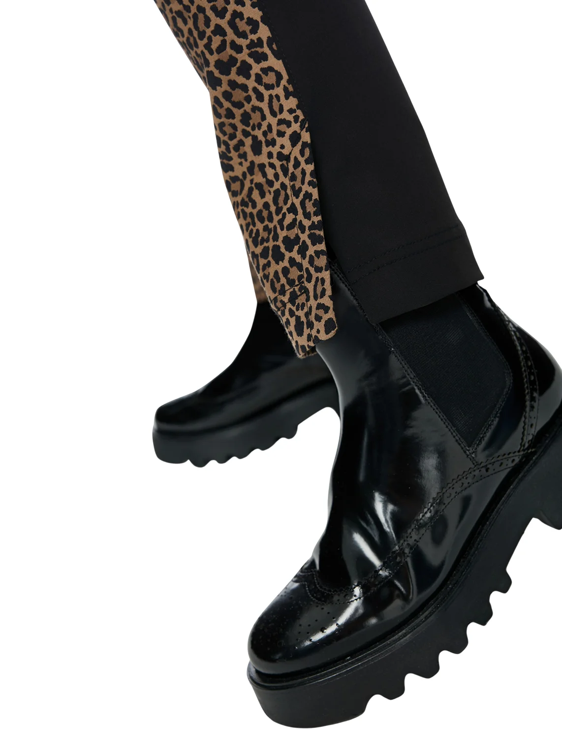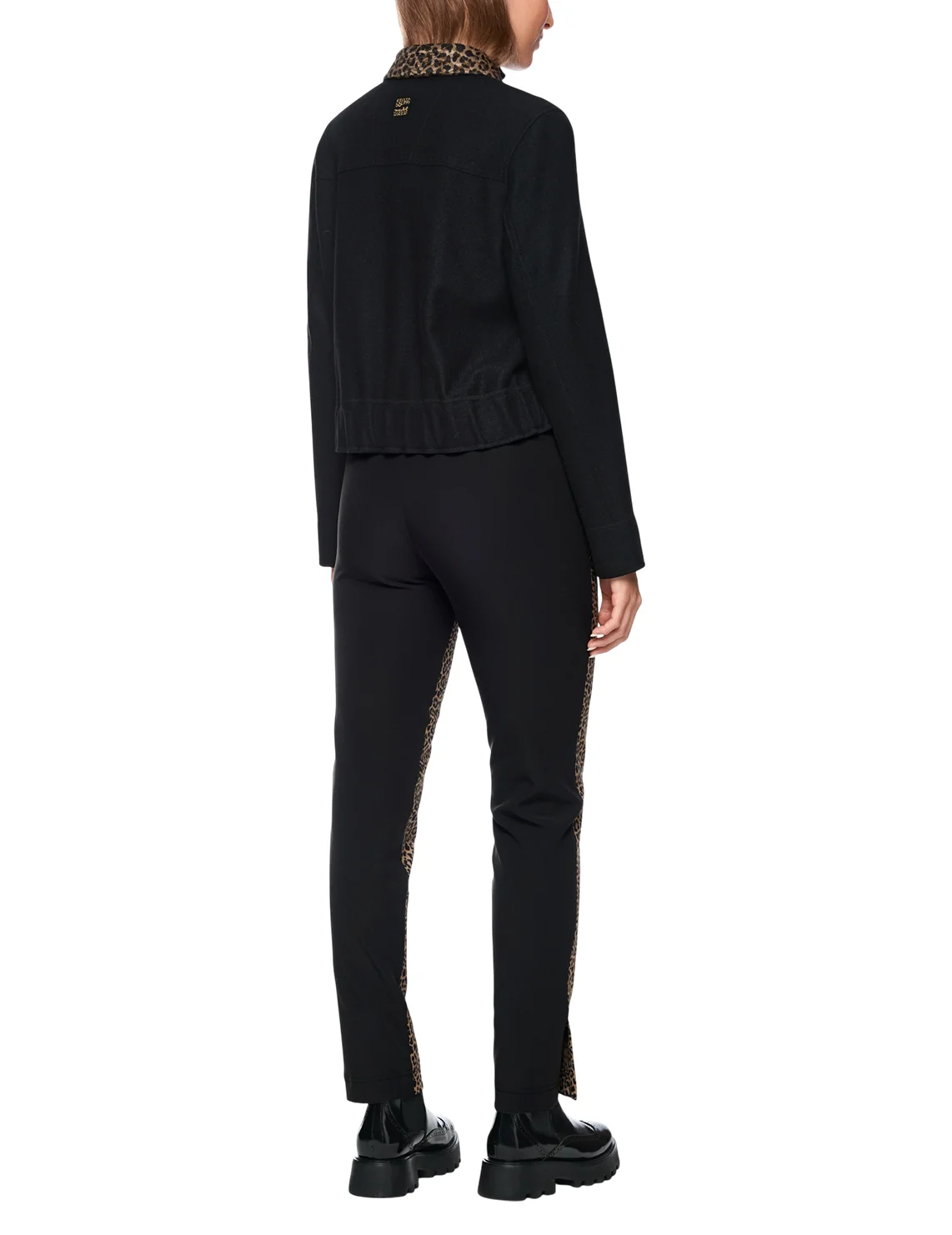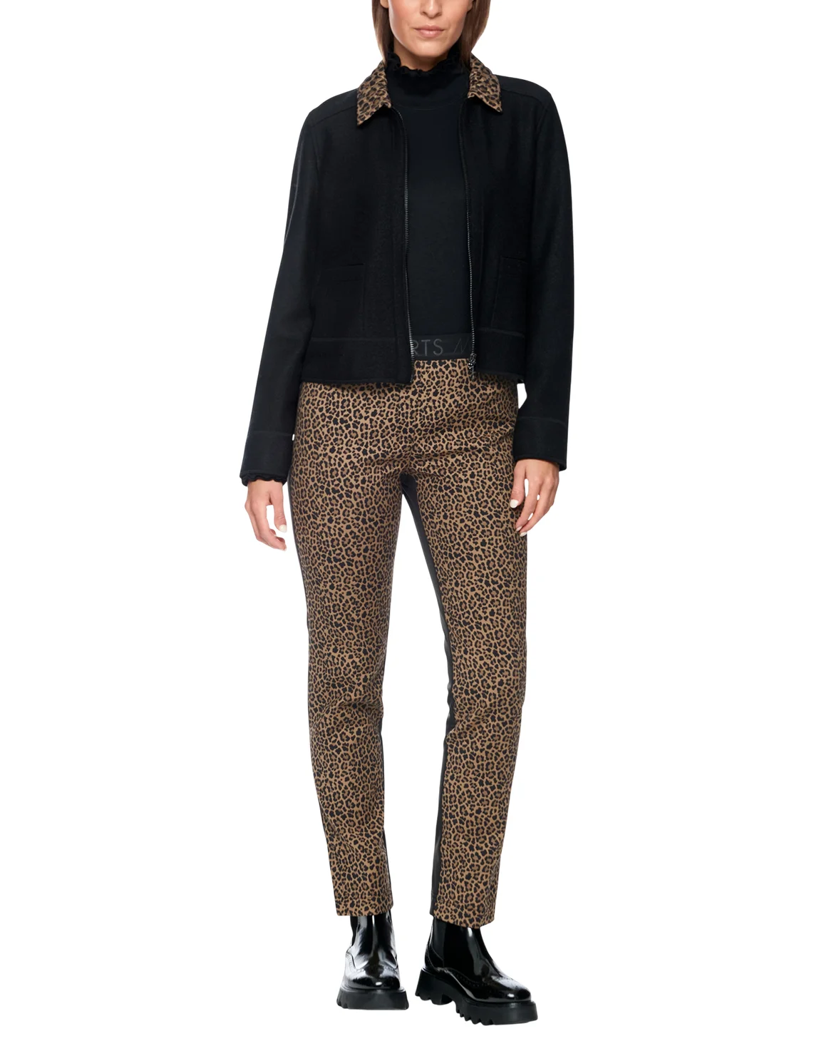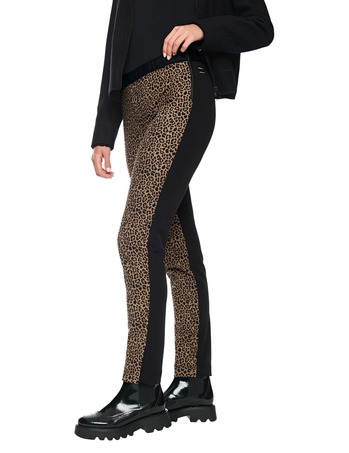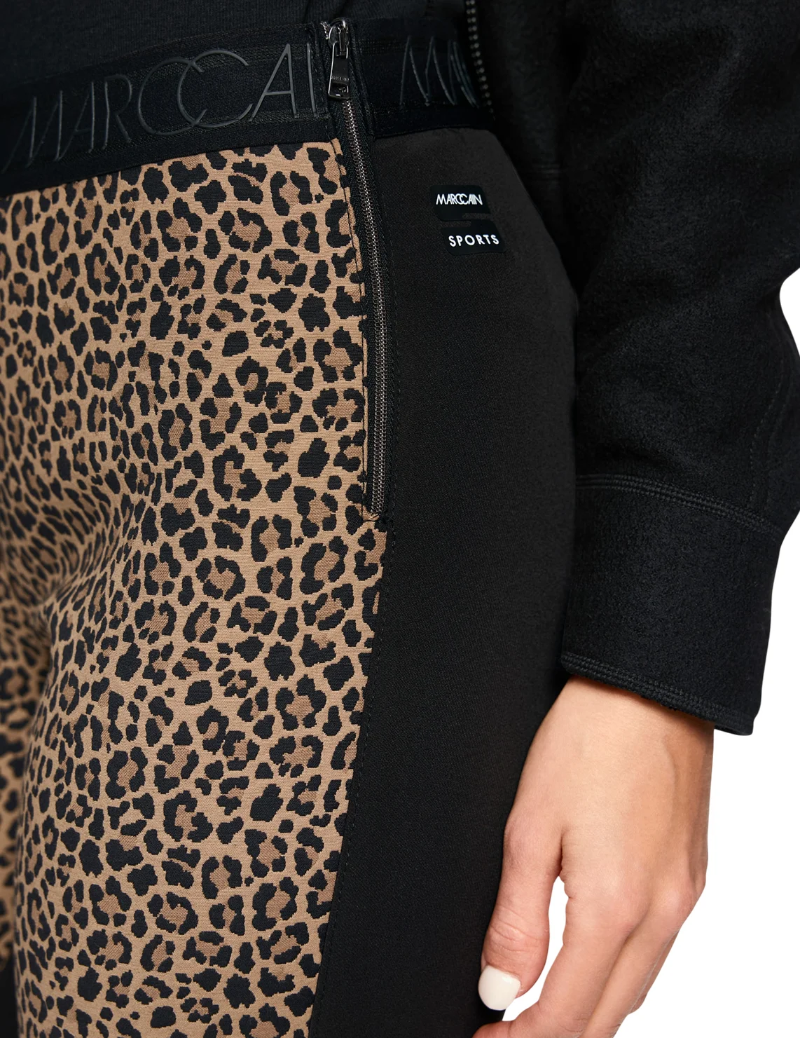 Штани виготовлені з бавовни, поліестеру й еластану. Модель виконана в звуженому крої. Має еластичний пояс із логотипом бренду, прорізні кишені на блискавках та розрізи по низу штанин. Декоровані анімалістичним принтом.