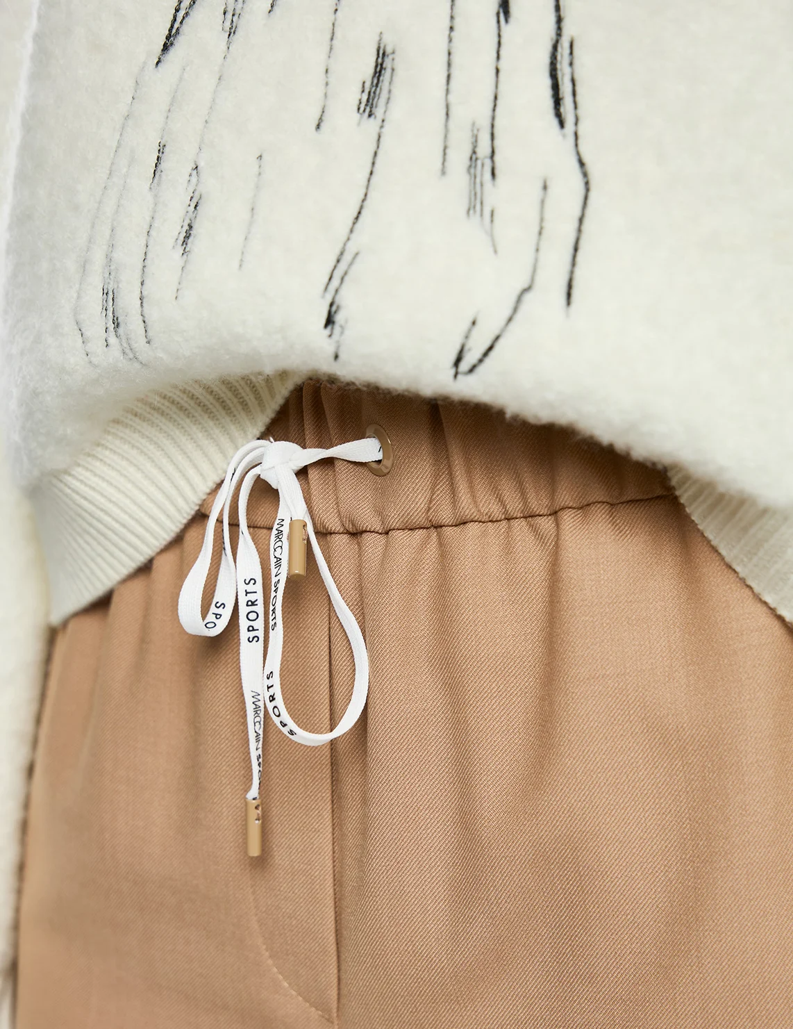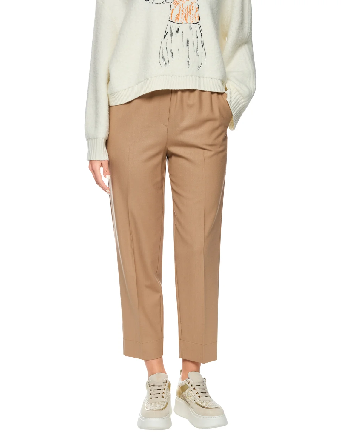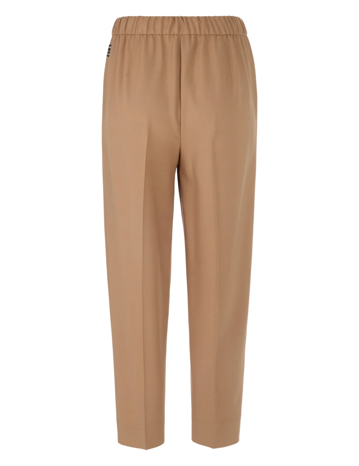 Штани виготовлені з поліестеру, вовни та еластану. Модель виконана у вільному крої. Має еластичний пояс із куліскою, прорізні кишені та пресовані стрілки.