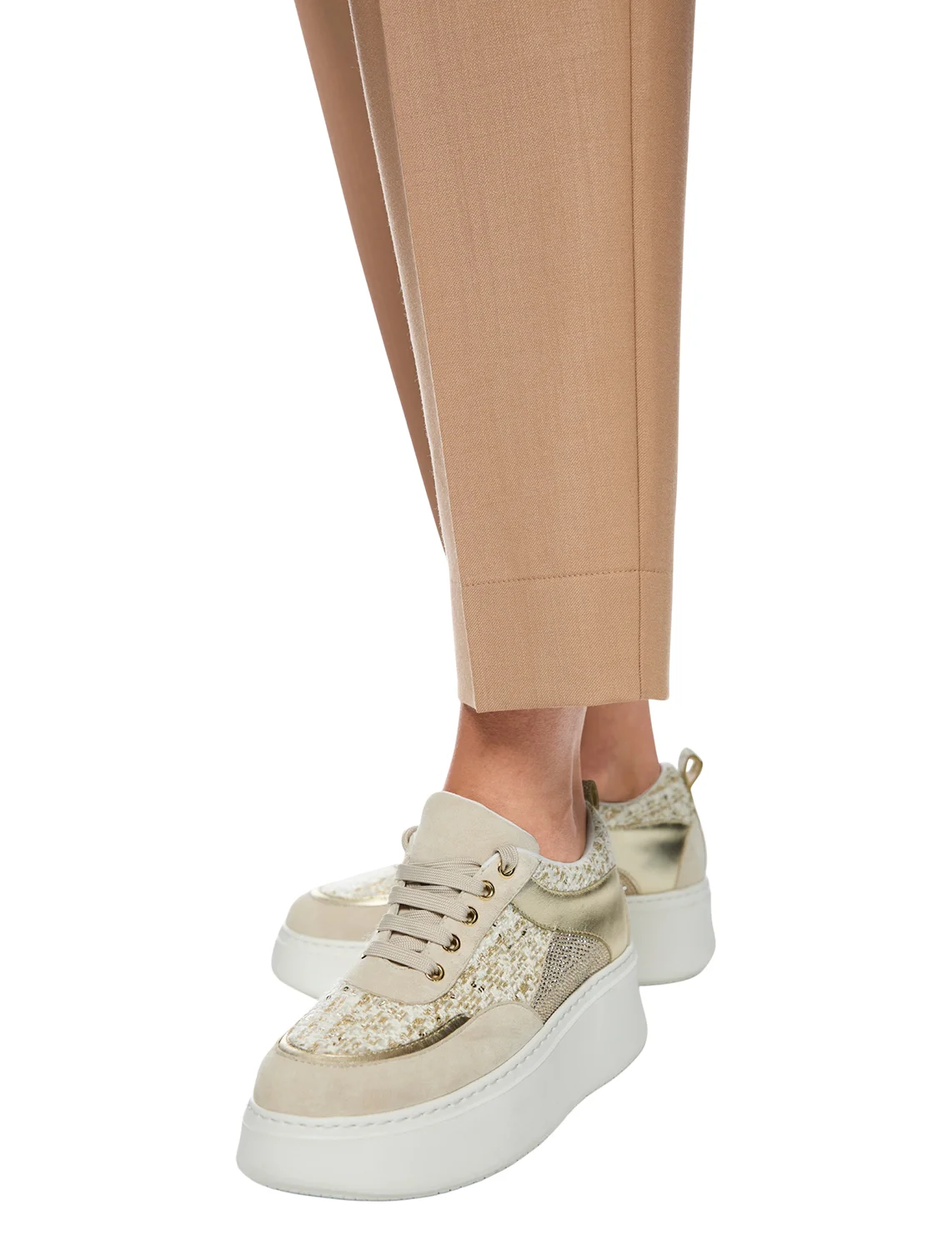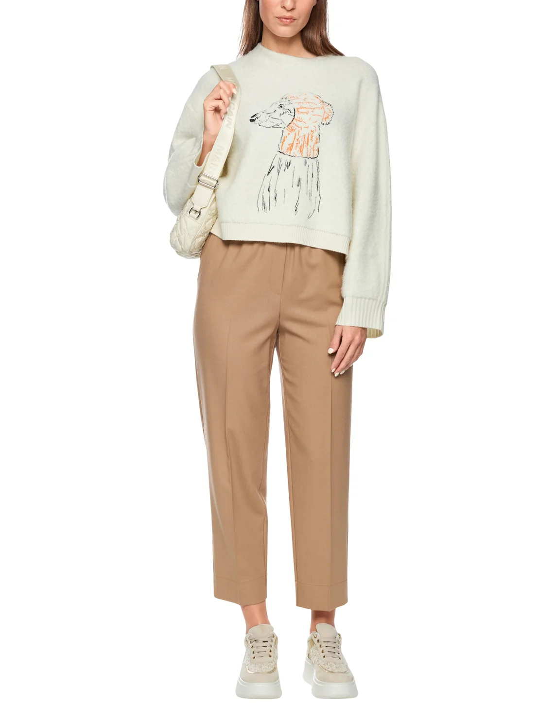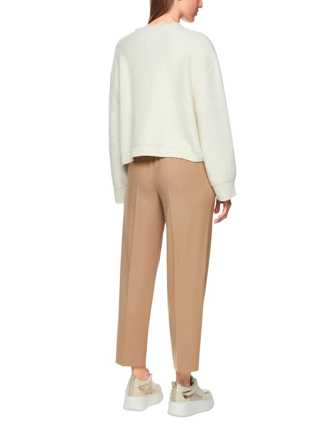 Штани виготовлені з поліестеру, вовни та еластану. Модель виконана у вільному крої. Має еластичний пояс із куліскою, прорізні кишені та пресовані стрілки.