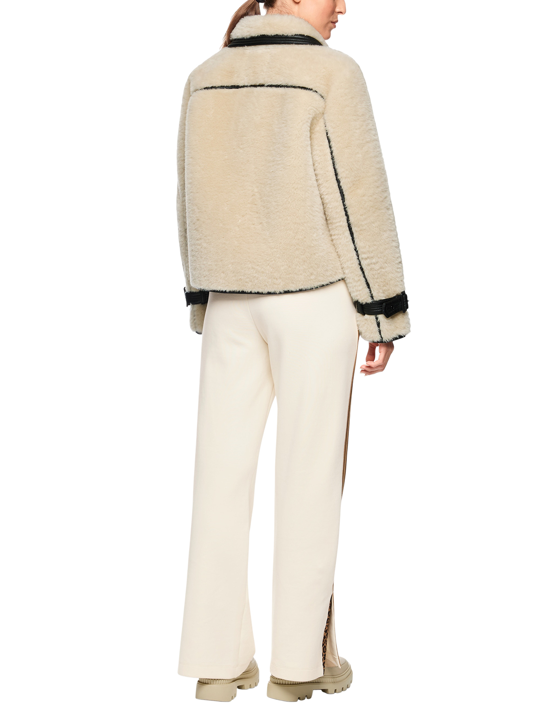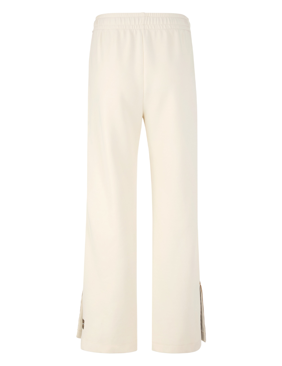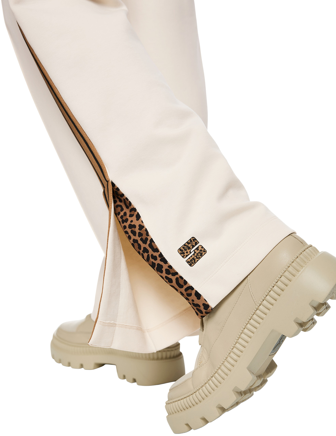 Штани виготовлені з бавовни, поліестеру та еластану. Модель виконана у вільному крої. Має еластичний пояс із куліскою, прорізні кишені, прострочені стрілки та розрізи по низу штанин. Декоровані лампасами та анімалістичним принтом.