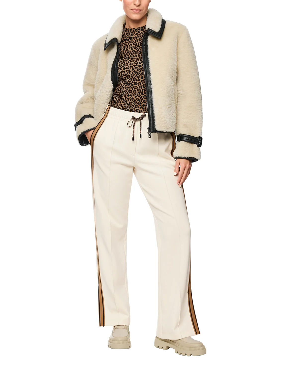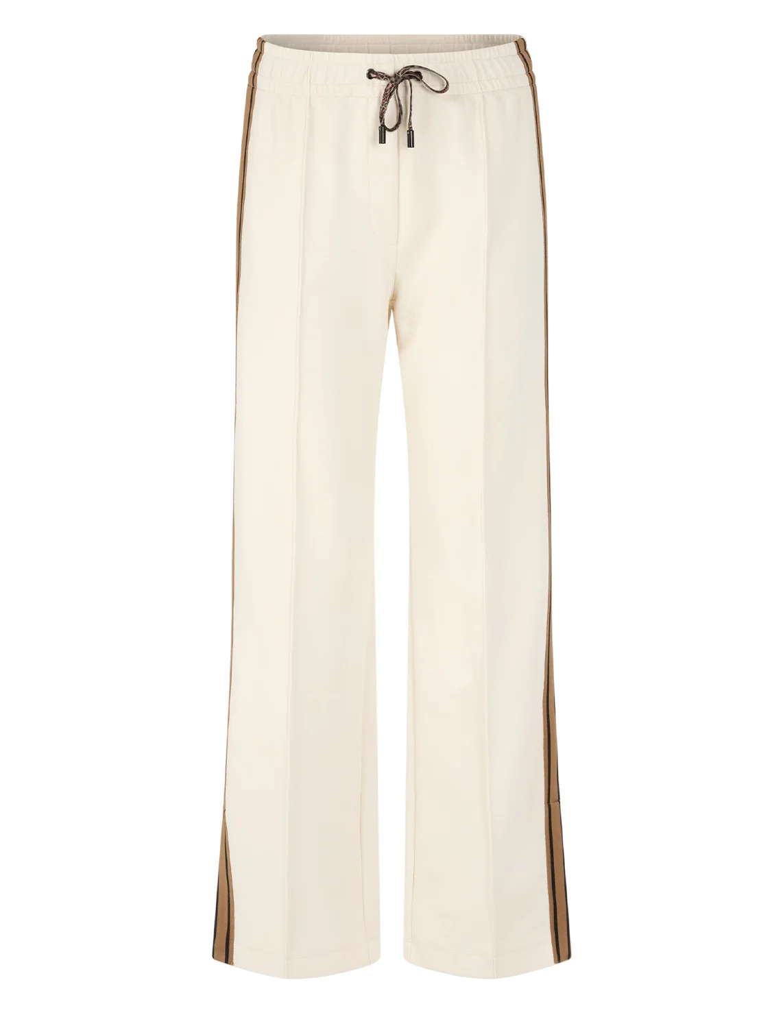 Штани виготовлені з бавовни, поліестеру та еластану. Модель виконана у вільному крої. Має еластичний пояс із куліскою, прорізні кишені, прострочені стрілки та розрізи по низу штанин. Декоровані лампасами та анімалістичним принтом.