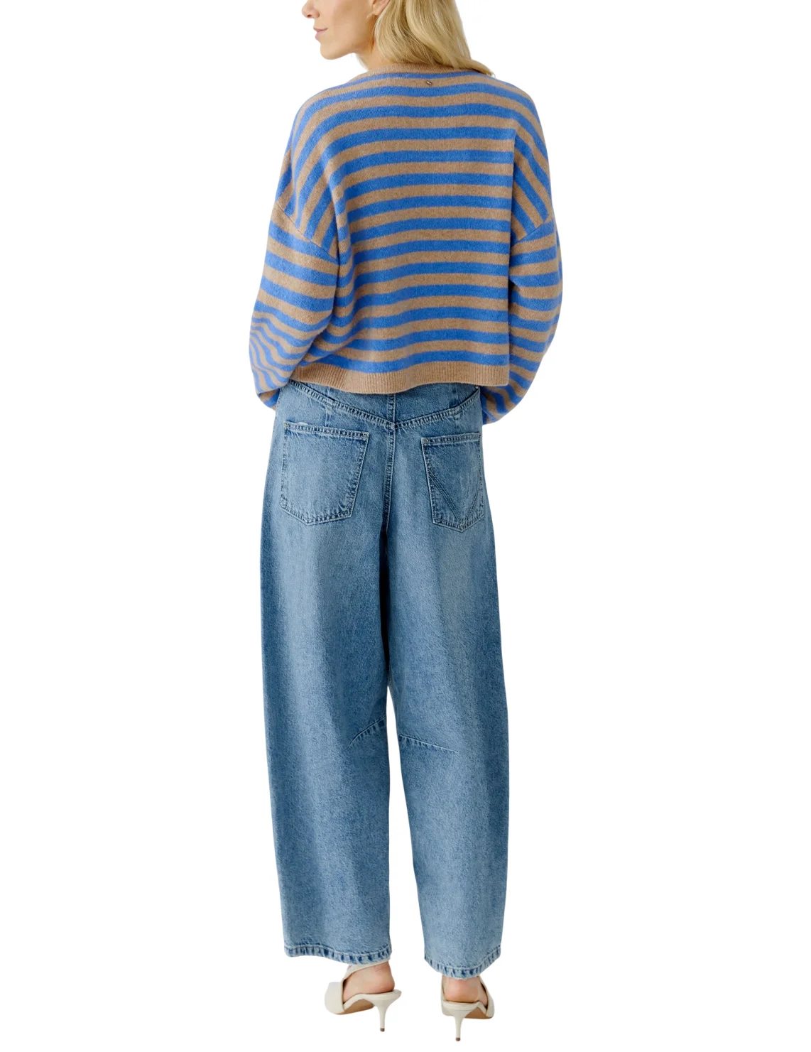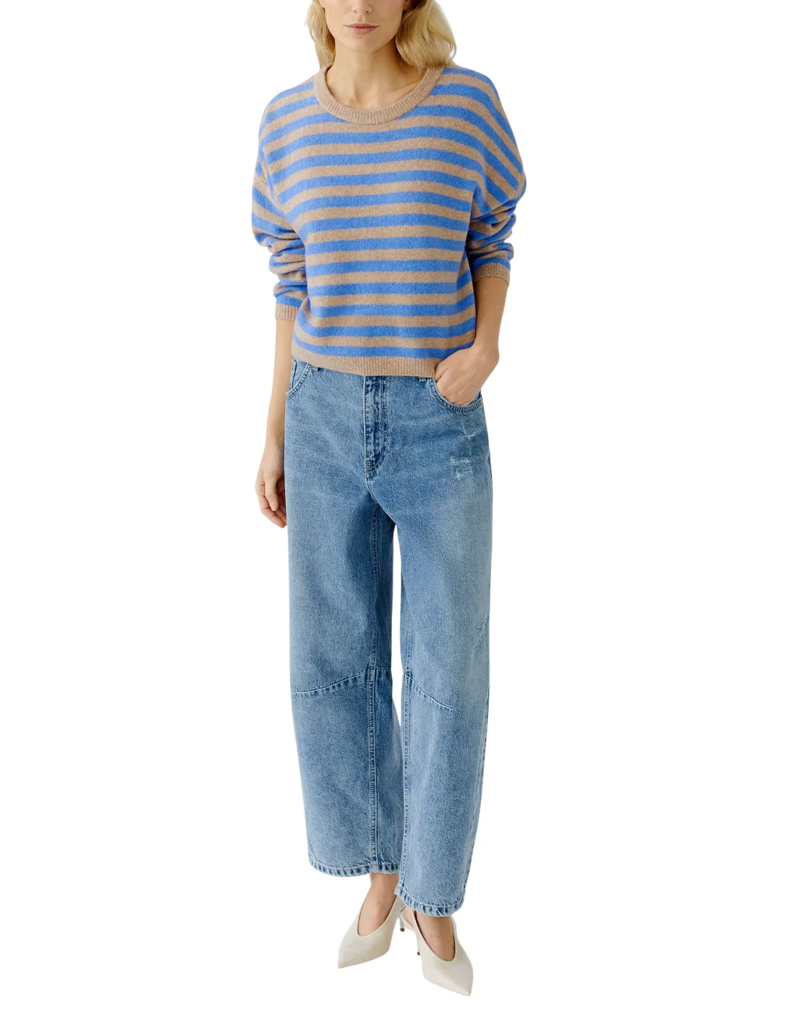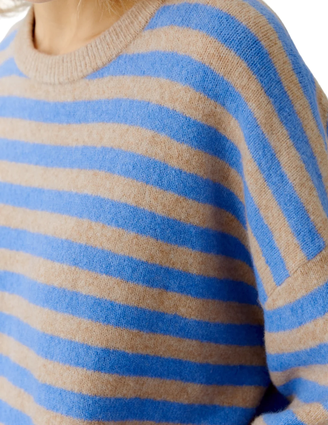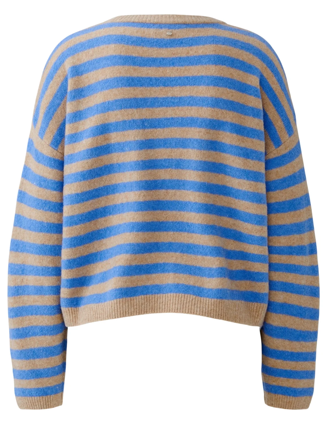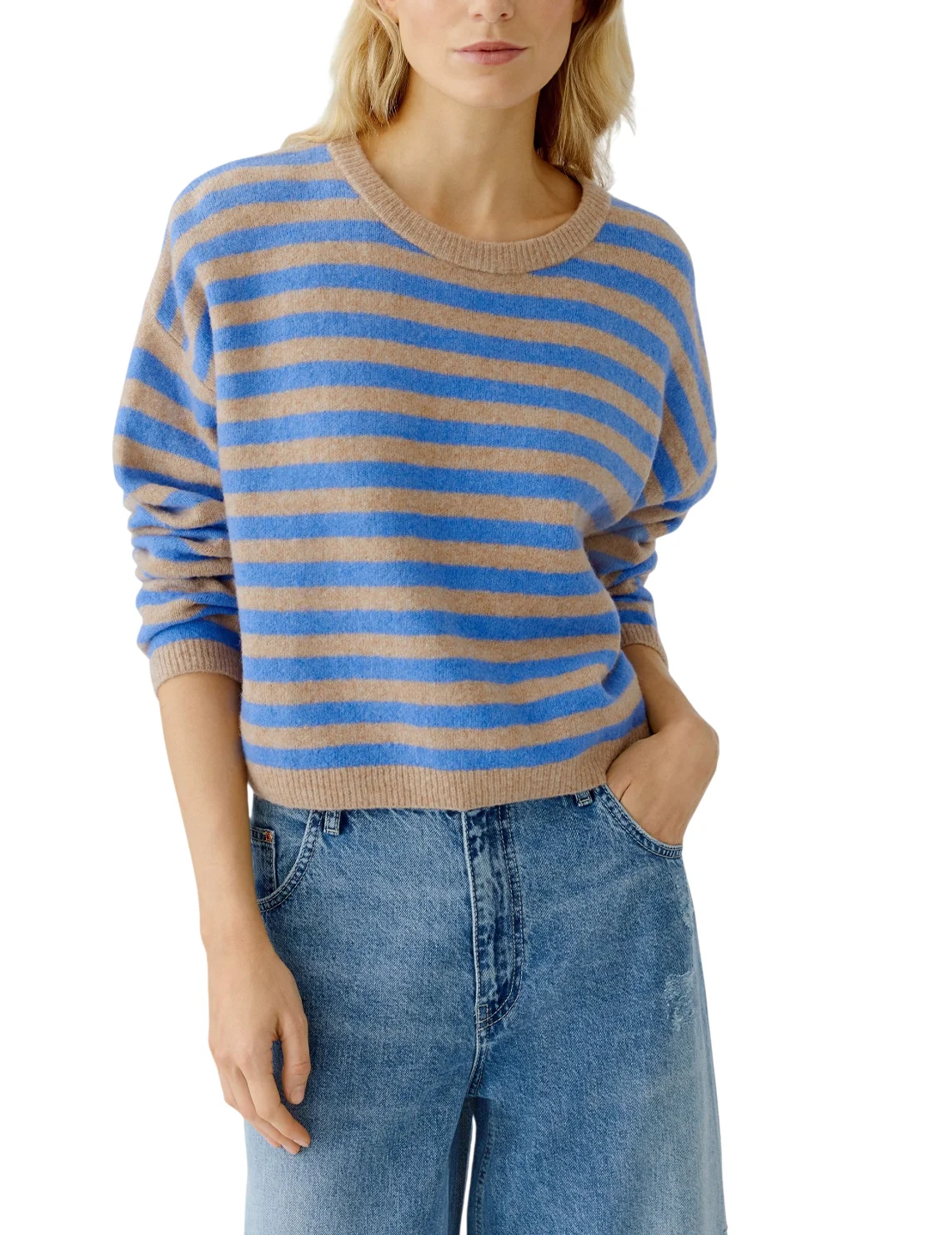 Джемпер виготовлений з поліаміду, вовни, поліестеру та еластану. Модель виконана у вільному крої. Має круглий виріз горловини, занижену плечову лінію та довгі рукави з манжетами. Декорований принтом у смужку.