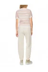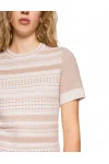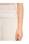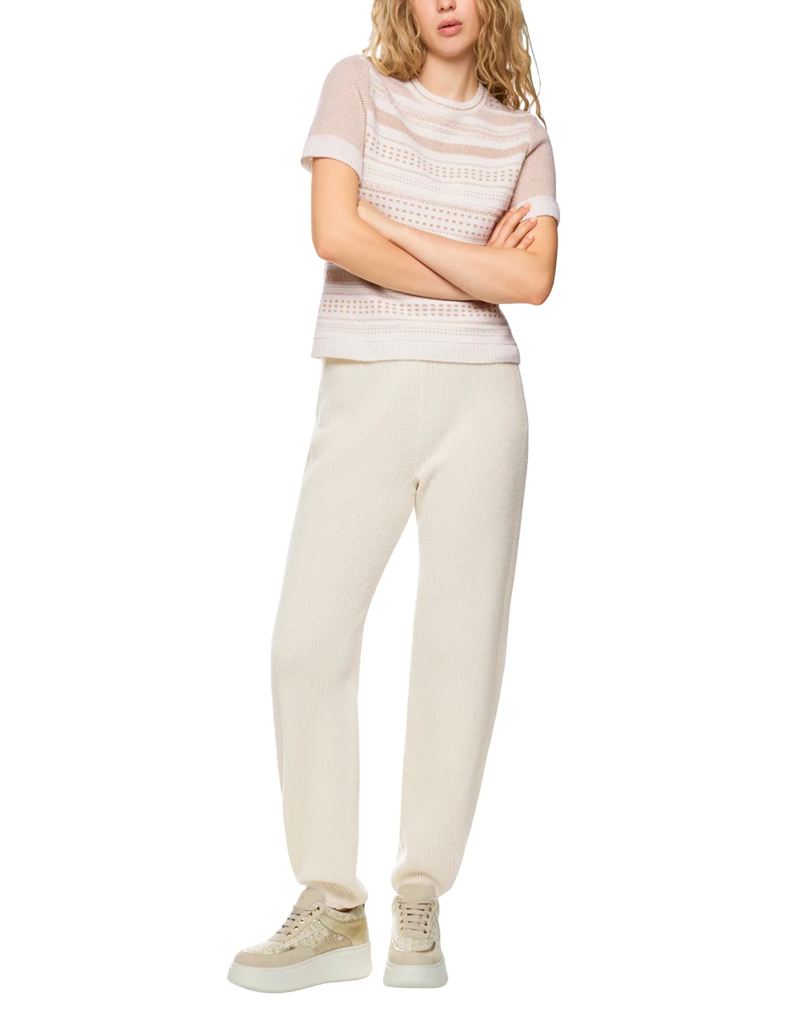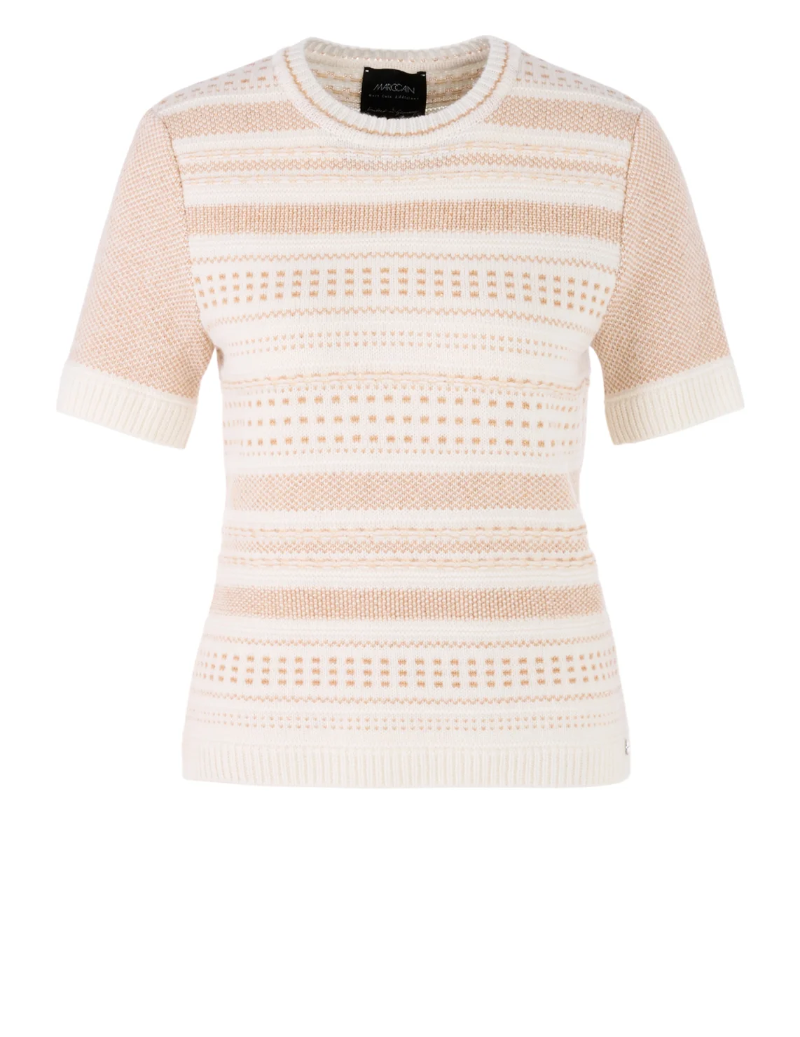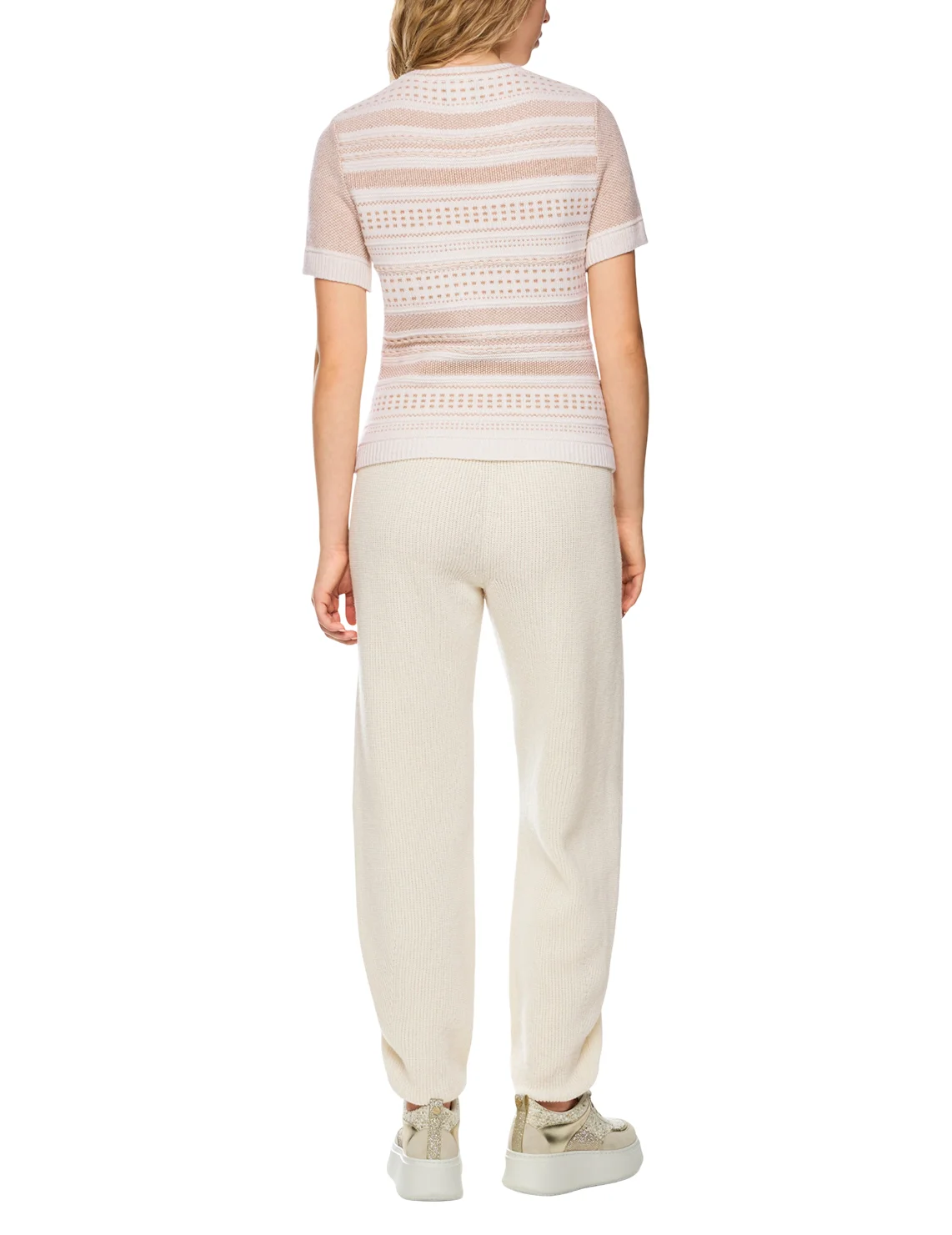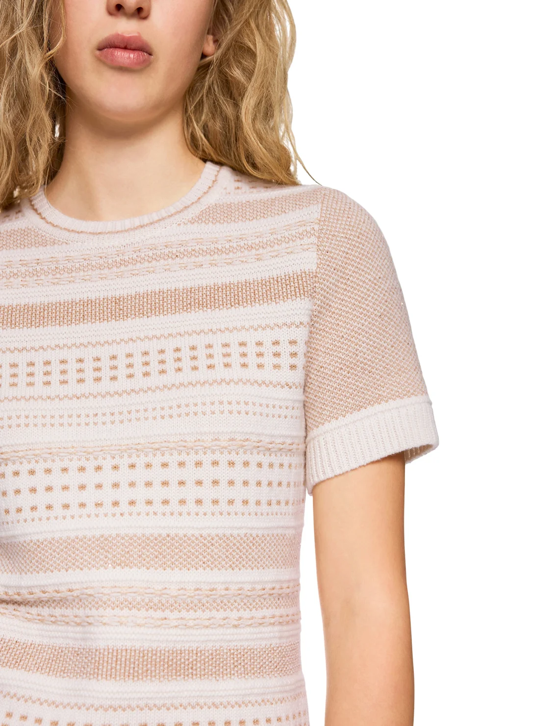 Джемпер виготовлений із вовни, кашеміру, поліаміду та шовку. Модель виконана в прямому крої. Має круглий виріз горловини та короткі рукави з манжетами. Декорований принтом у смужку.