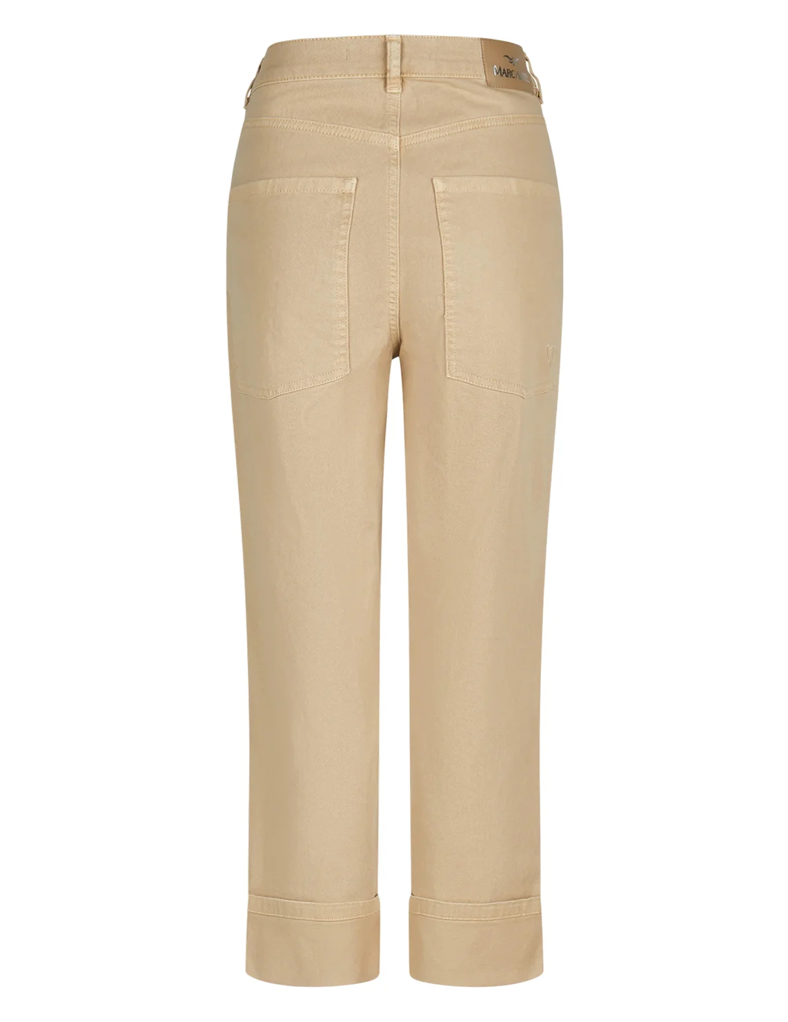 Джинси виготовлені з бавовни та еластану. Модель виконана у вільному крої. Має шльовки для ременя, приховану застібку-блискавку з ґудзиком, відвороти, а також пару передніх прорізних і пару задніх накладних кишень.