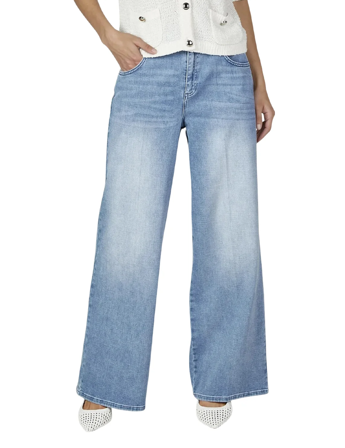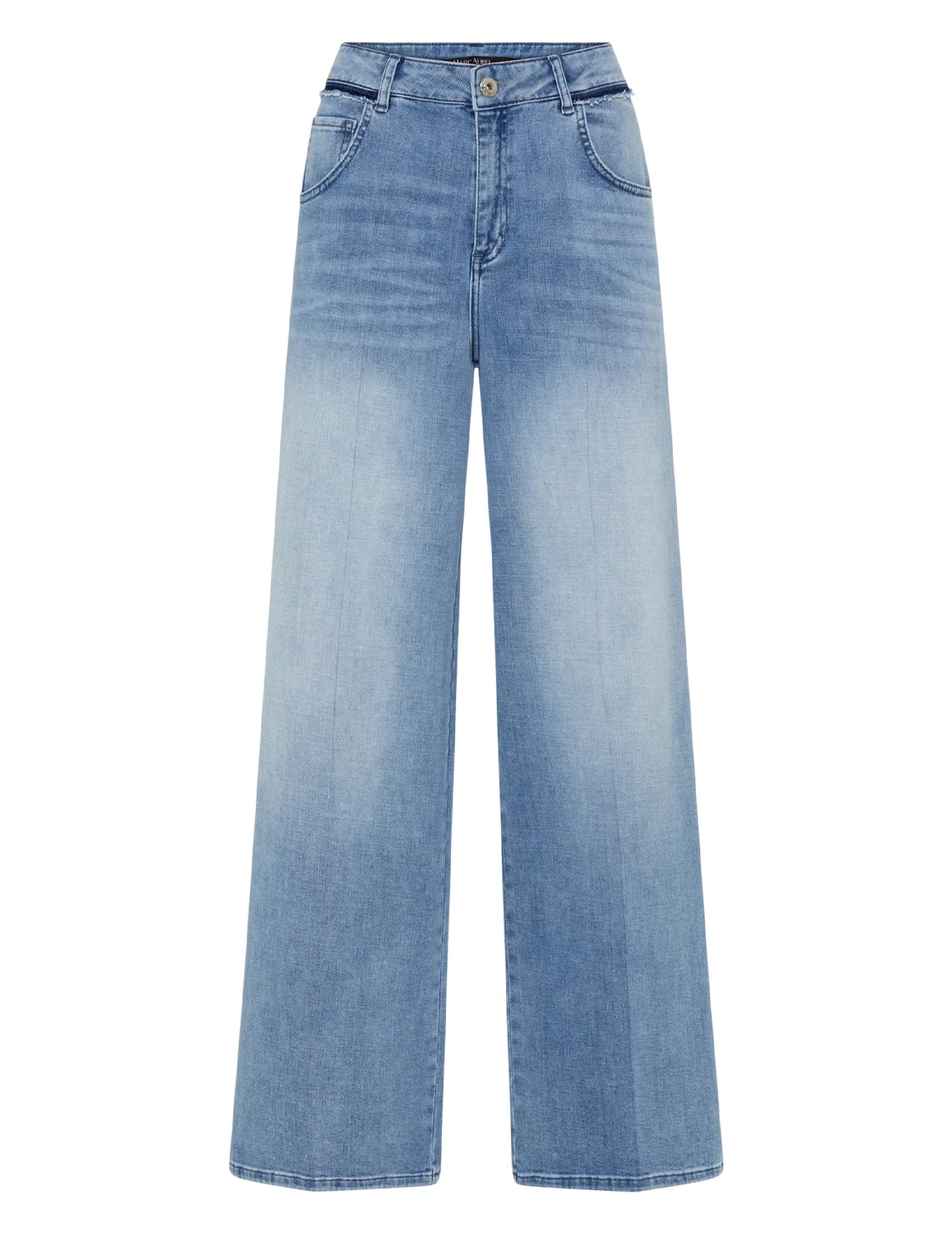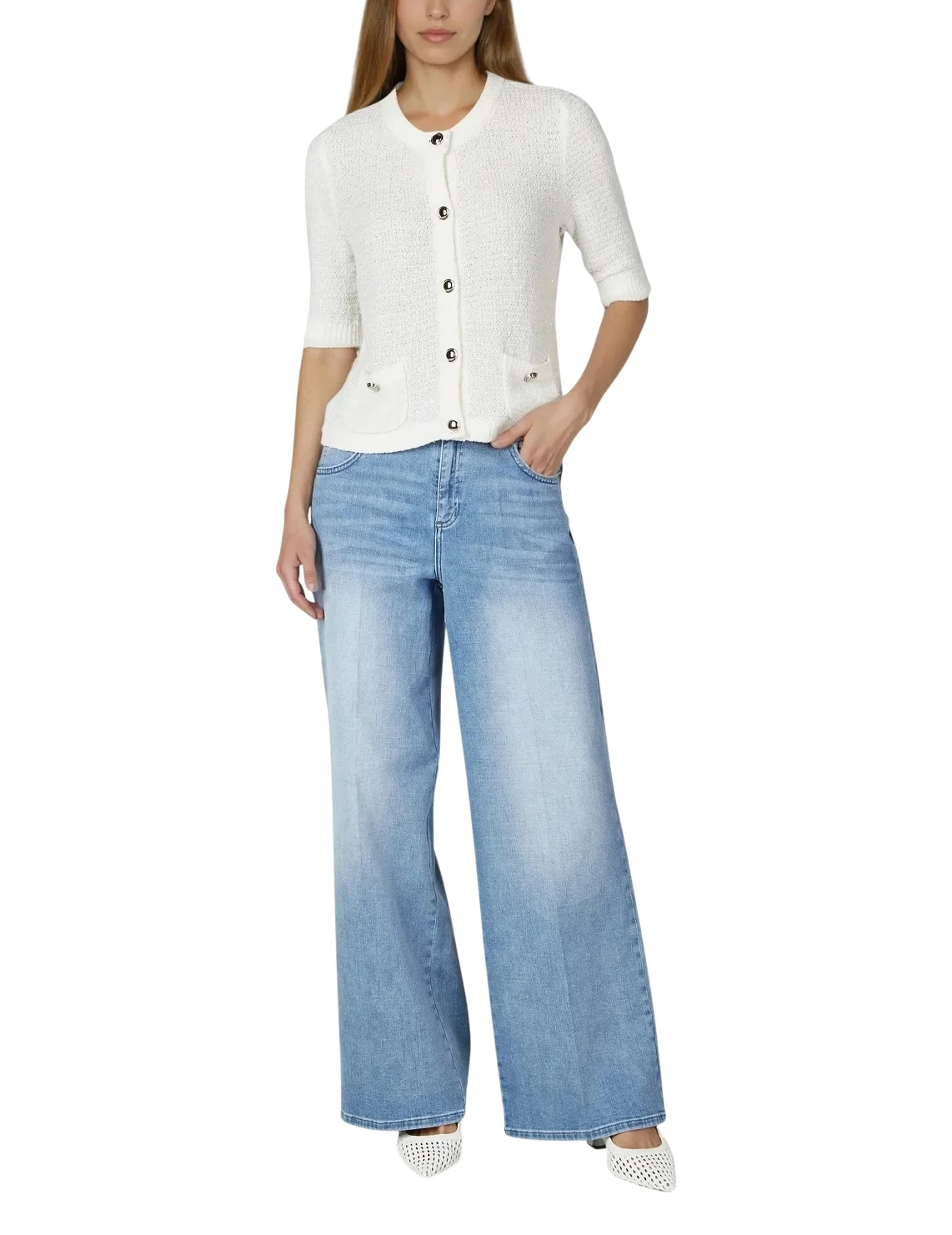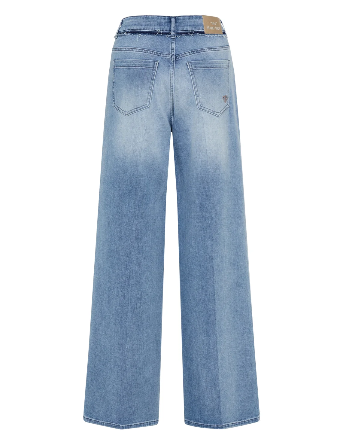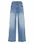 Джинси виготовлені із бавовни, еластомультіестеру та еластану. Модель виконано у розкльошеному крої. Мають шьовки для ременя, пару прорізних передніх та задніх накладних кишень, застібаються на приховану блискавку та ґудзик.