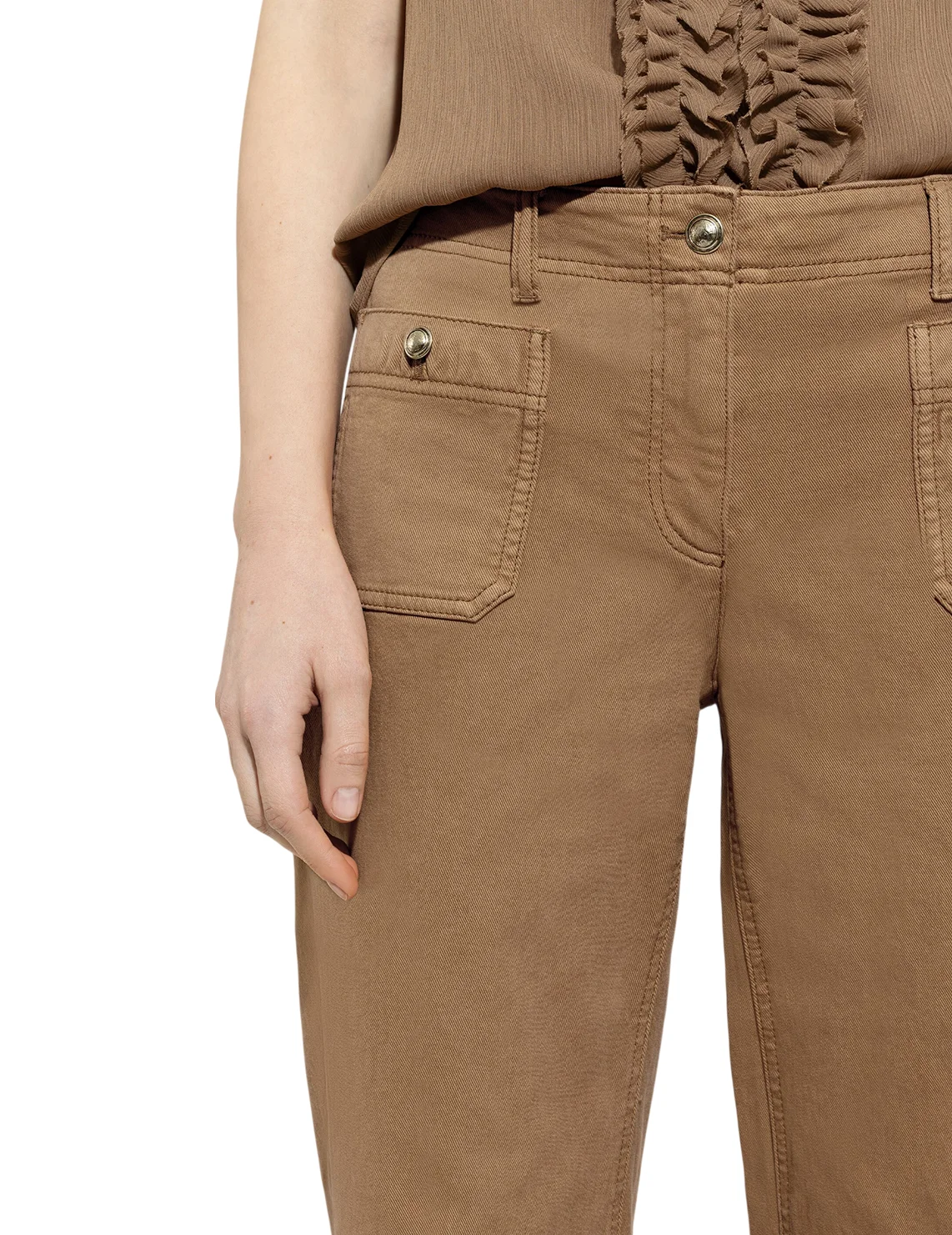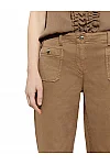 Джинси виготовлені з бавовни та еластану. Модель виконана у вільному крої. Має шльовки для ременя, приховану застібку-блискавку з ґудзиком, а також пару передніх і пару задніх накладних кишень.