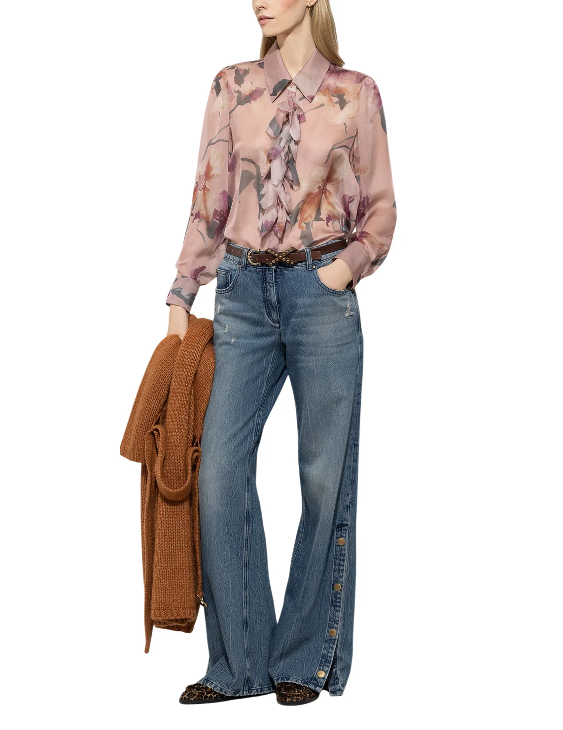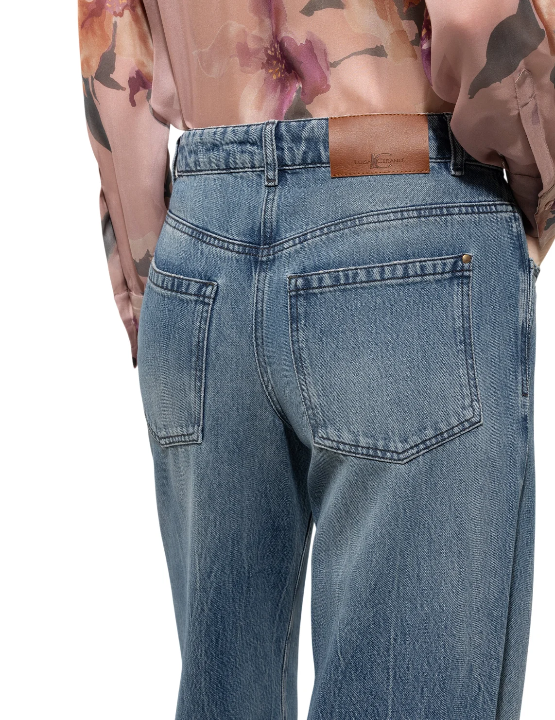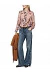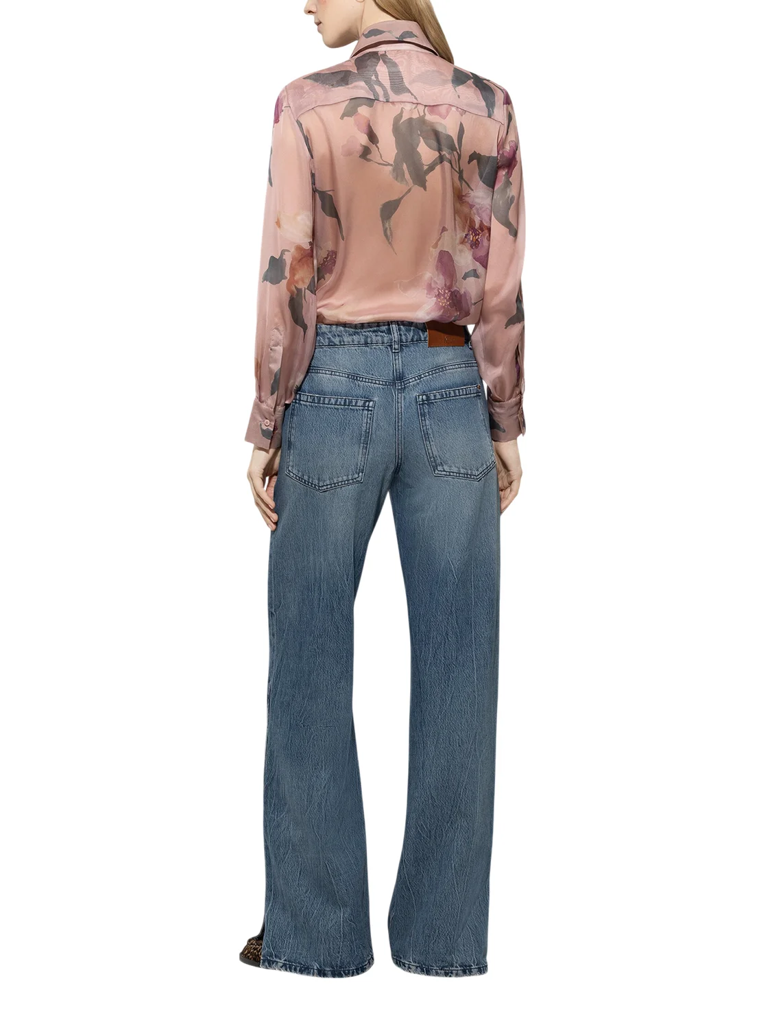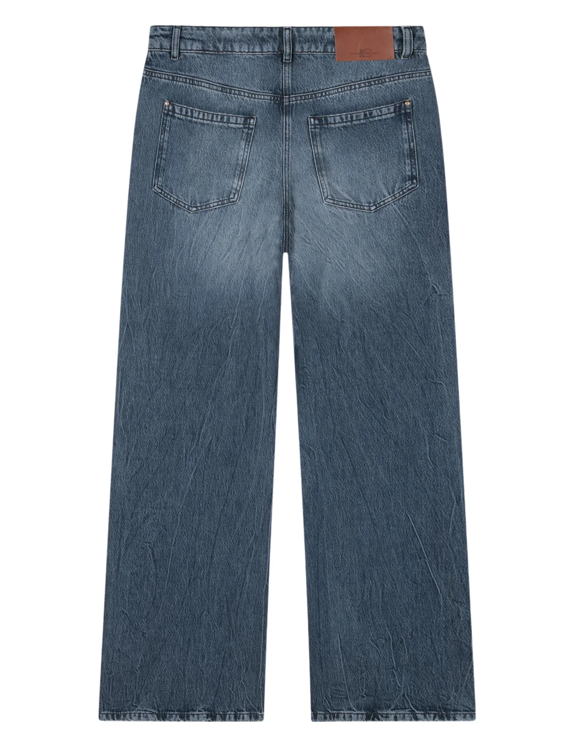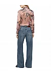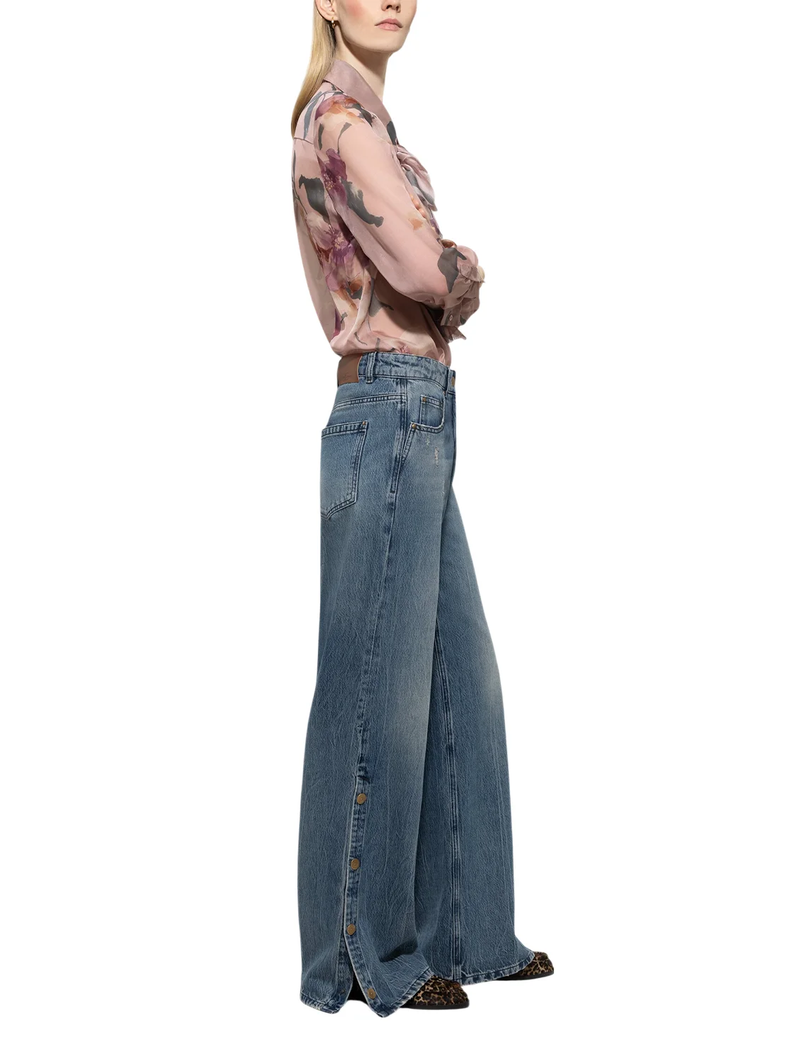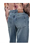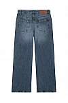 Джинси виготовлені з бавовни та ліоцелу. Модель виконана у вільному крої. Має шльовки для ременя, приховану застібку-блискавку з ґудзиком, бічні розрізи на кнопках, а також пару передніх і пару задніх накладних кишень.