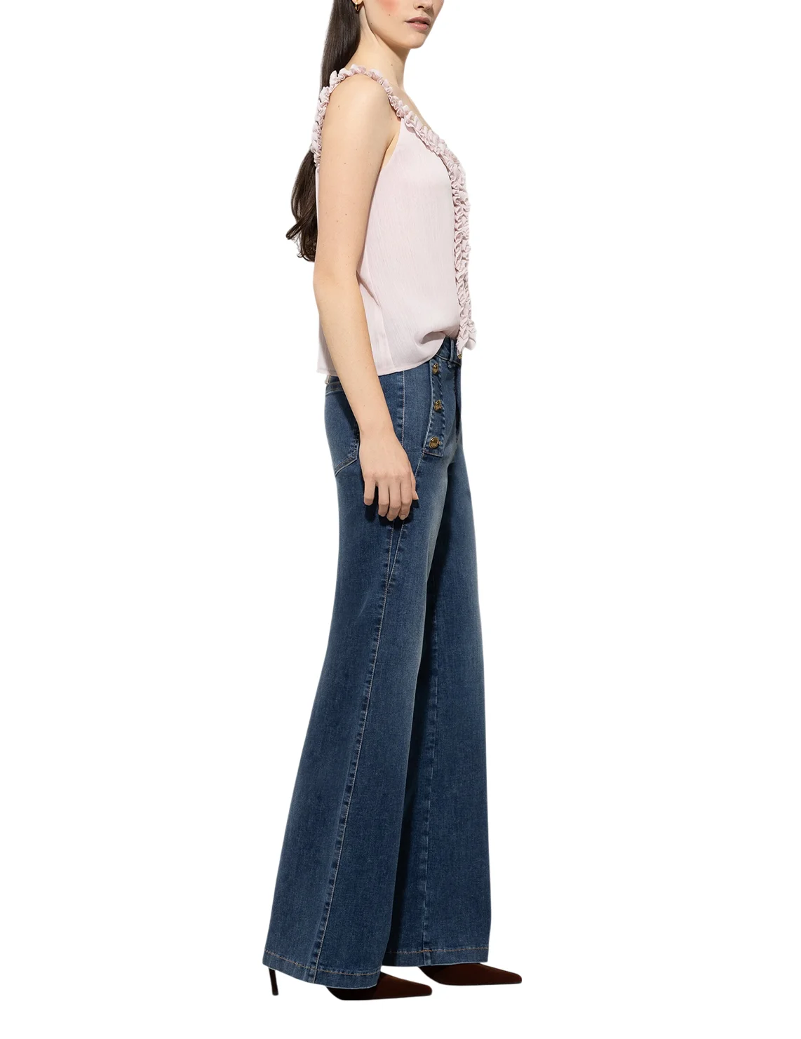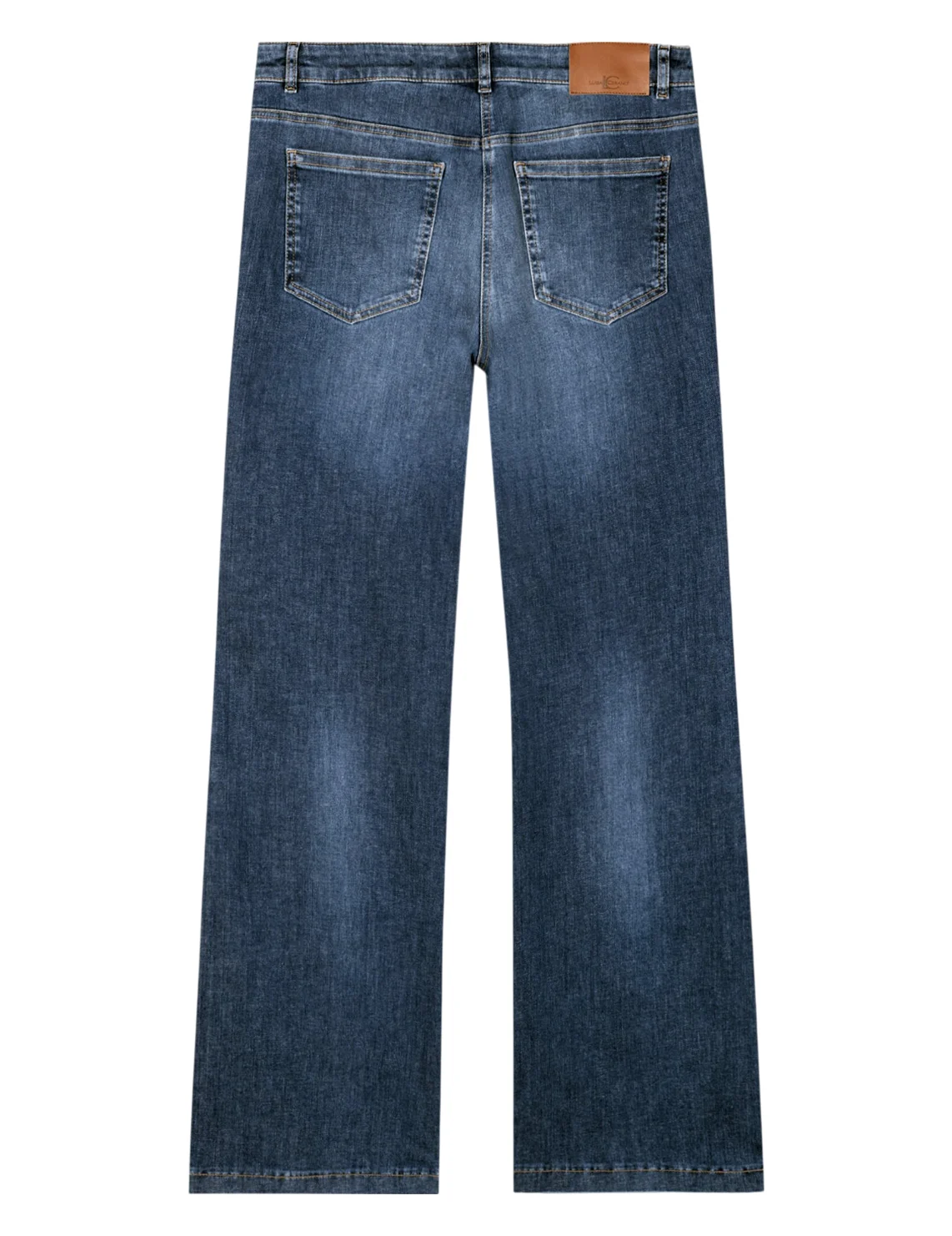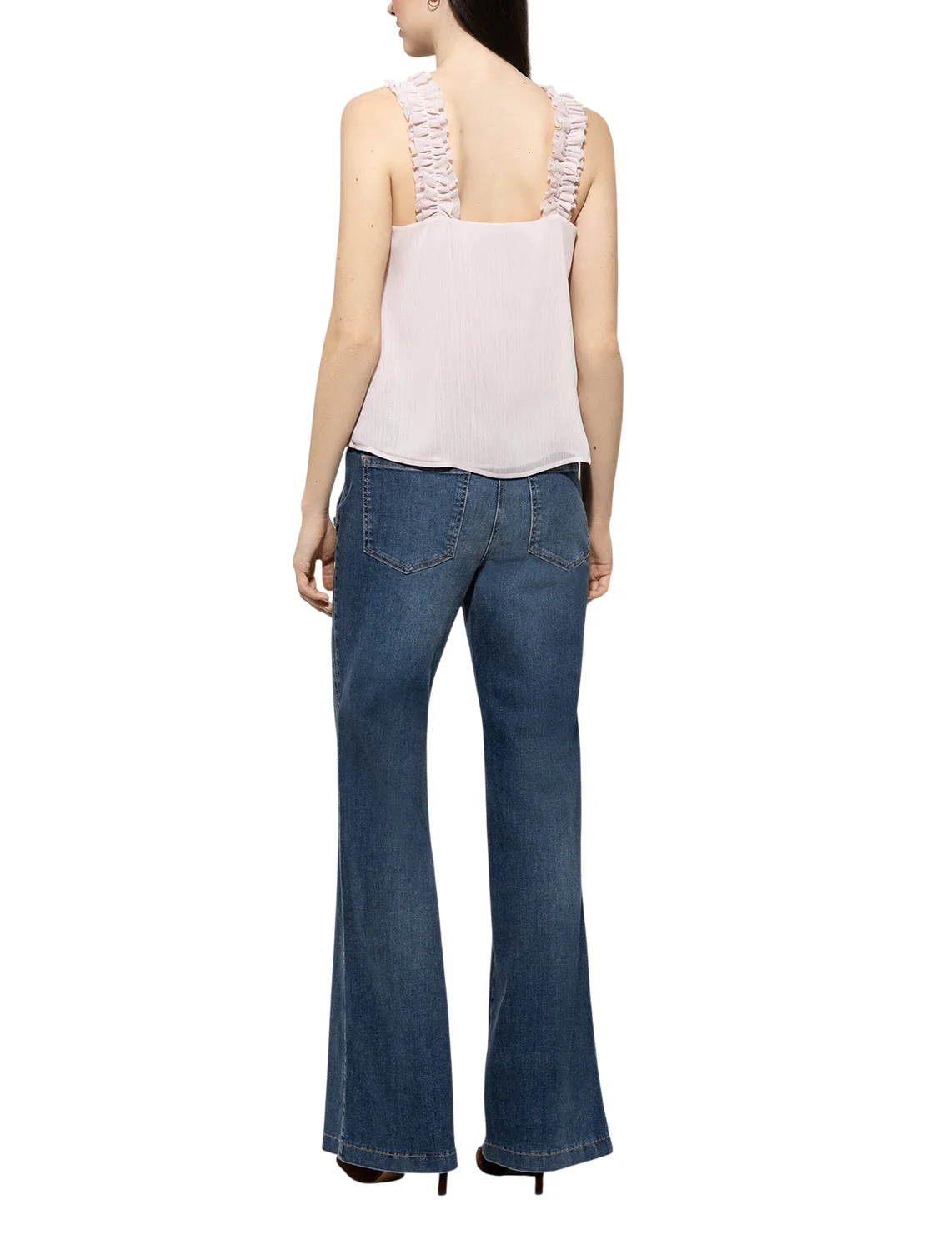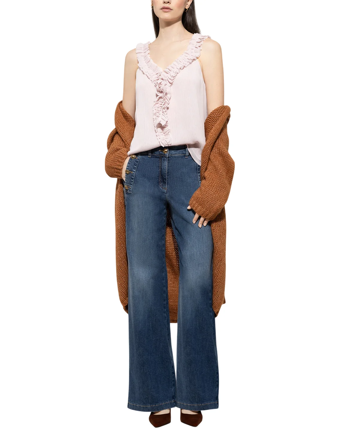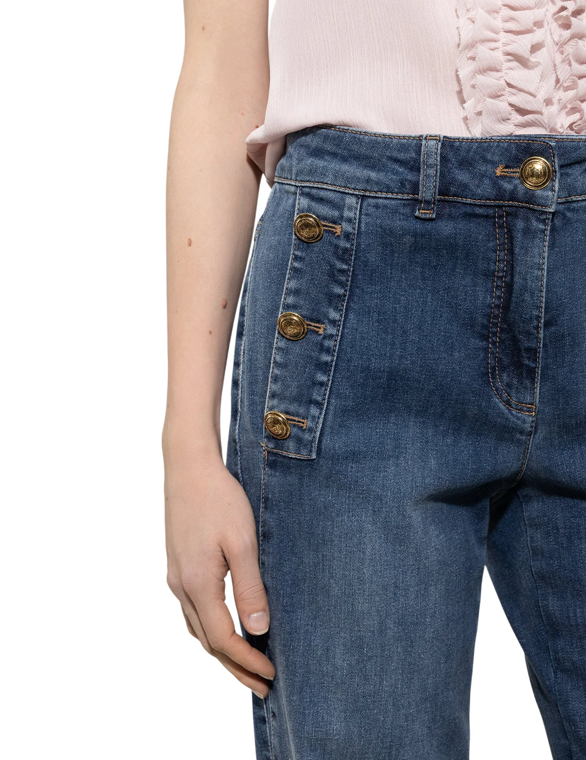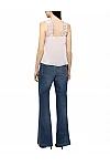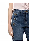 Джинси виготовлені з бавовни та еластану. Модель виконана в розкльошеному крої. Має шльовки для ременя, приховану застібку-блискавку з ґудзиком, а також пару передніх і пару задніх накладних кишень.