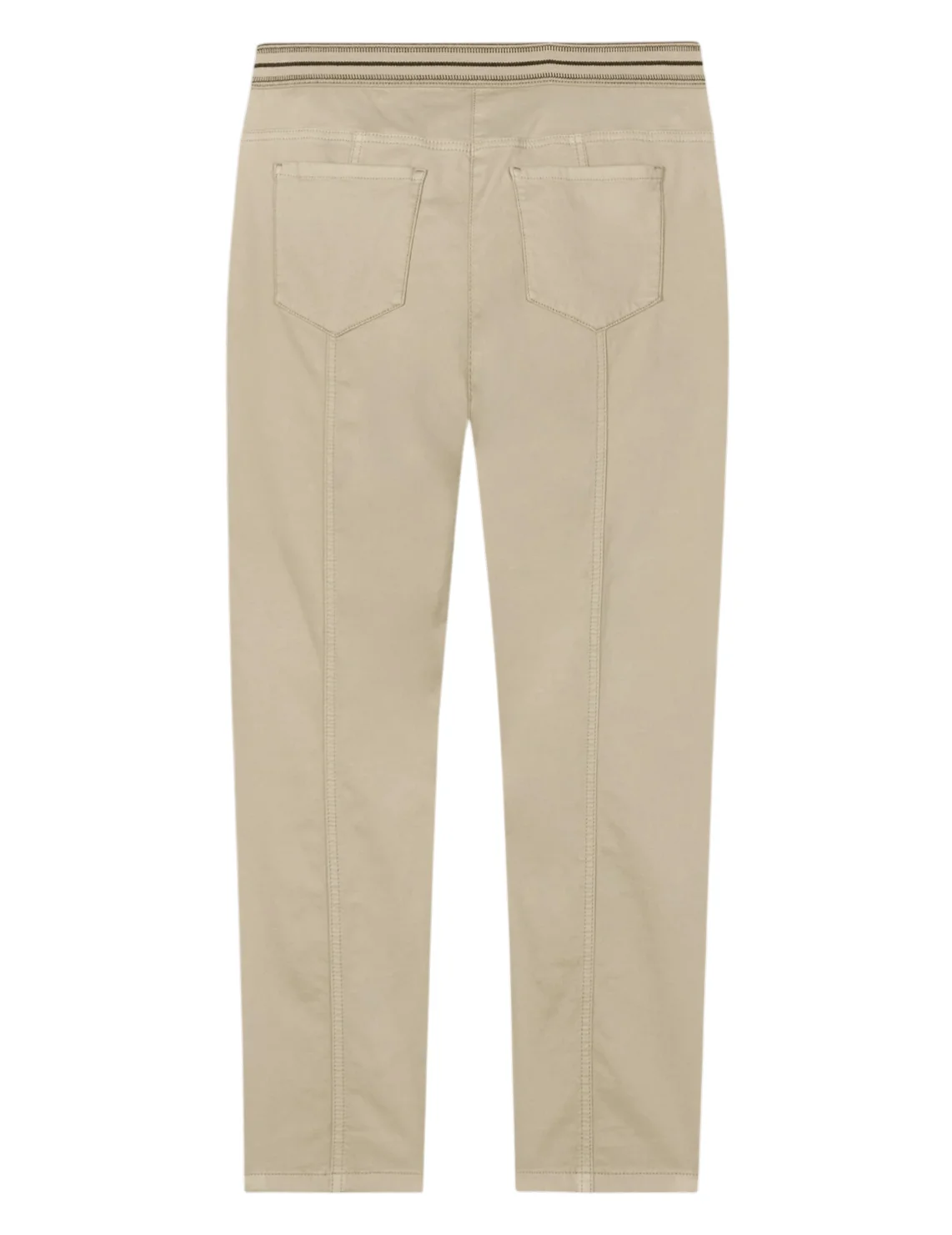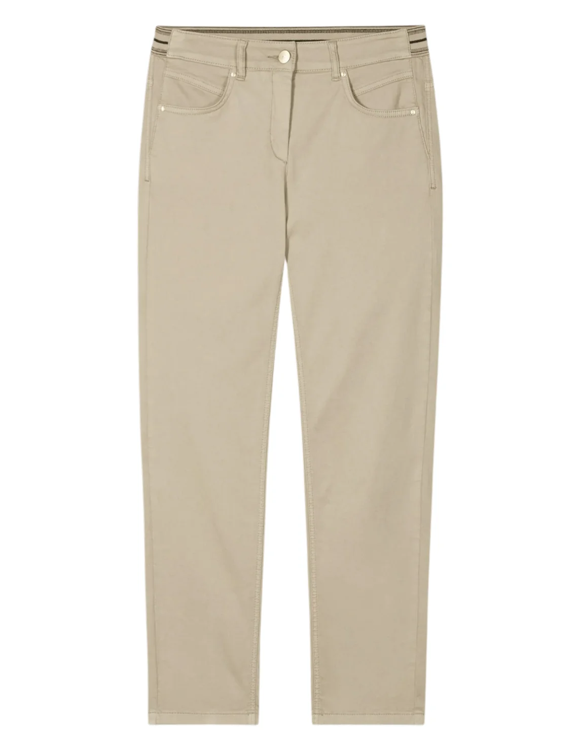 Джинси виготовлені з бавовни та еластану. Модель виконана в завуженому крої. Має петлі для ременя, приховану застібку-блискавку з ґудзиком, еластичний пояс, прорізні бічні та накладні задні кишені.