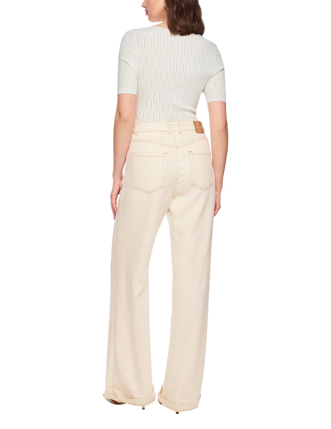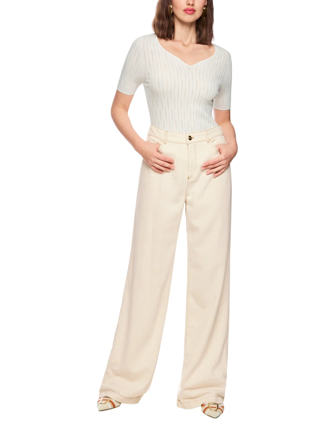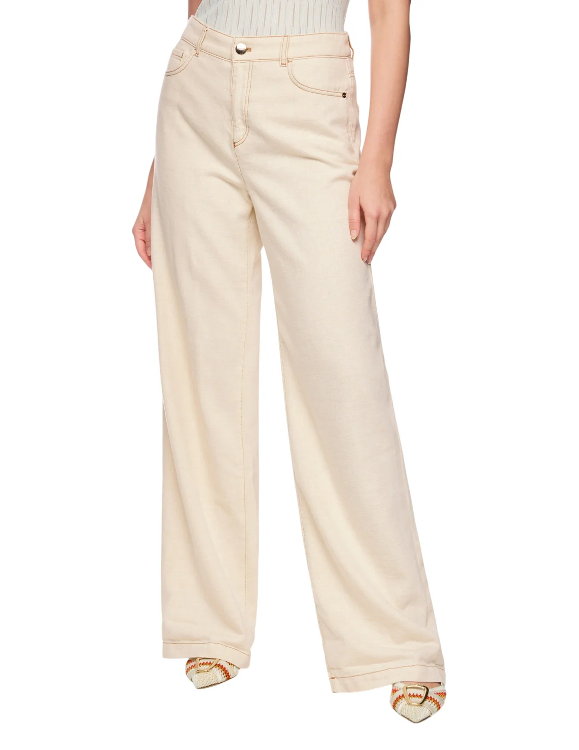 Джинси виготовлені з бавовни, віскози, поліестеру та поліаміду. Модель виконана у вільному крої. Має петлі для ременя, приховану застібку-блискавку з ґудзиком, а також пару передніх прорізних і пару задніх накладних кишень.