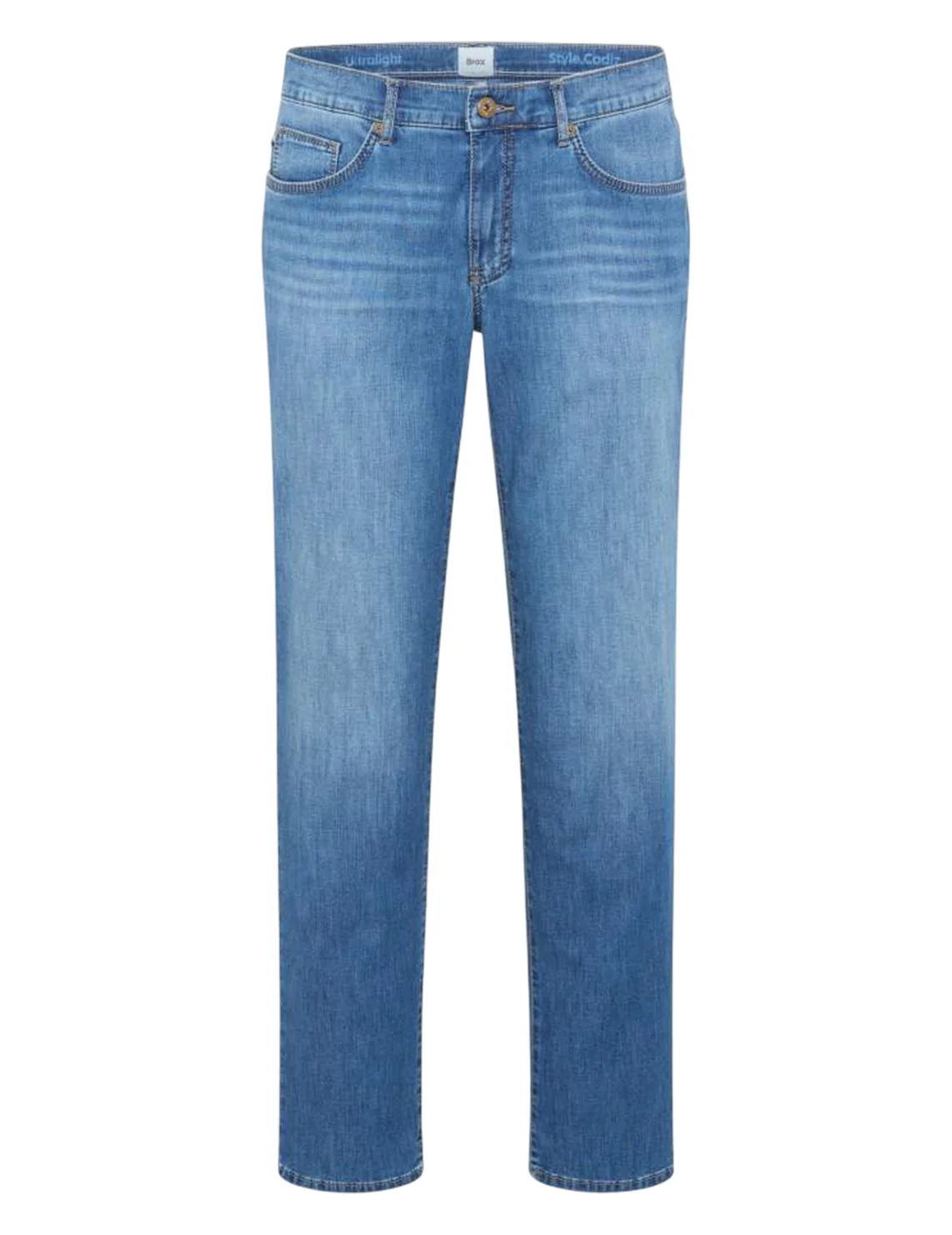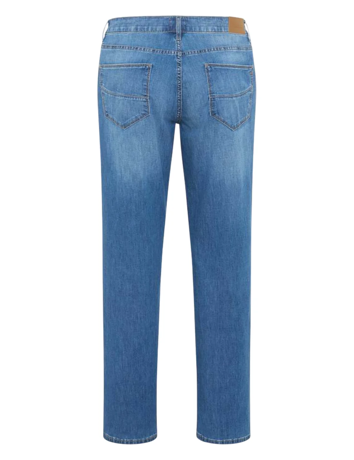 Джинси виготовлені з бавовни, поліестеру, еластомультіестеру та еластану. Модель прямого крою. Має петлі для ременя, застібку-блискавку з ґудзиком, пару передніх прорізних і пару задніх накладних кишень.