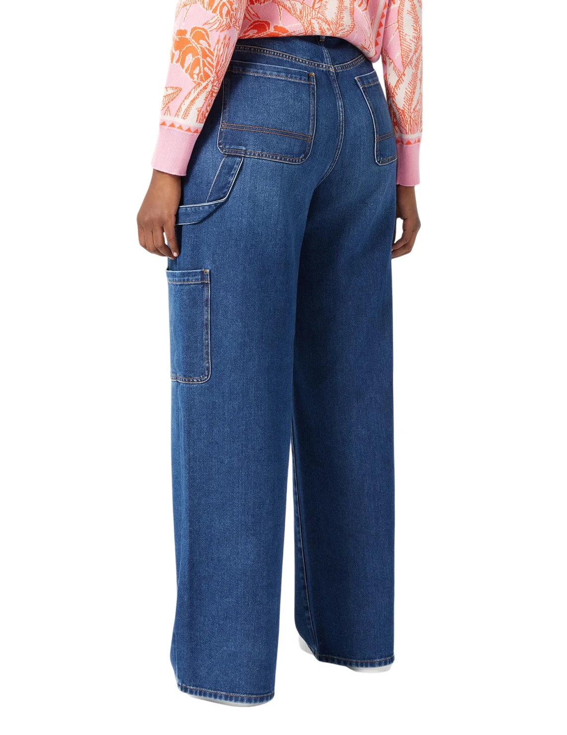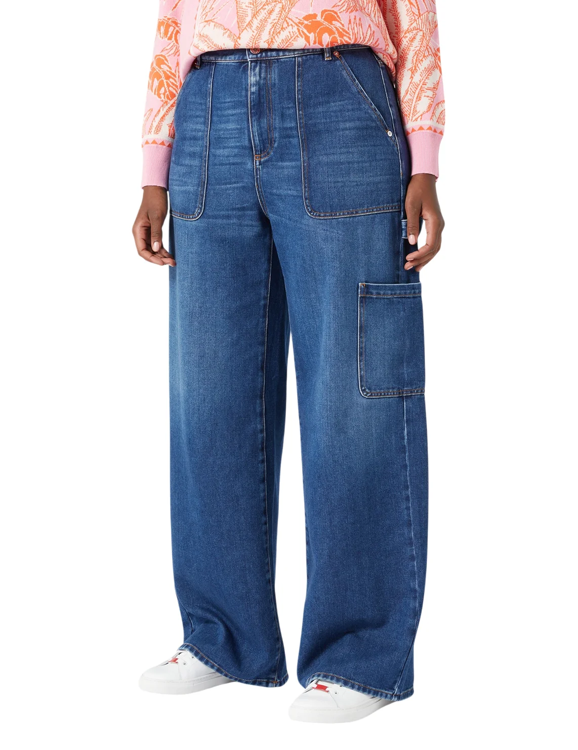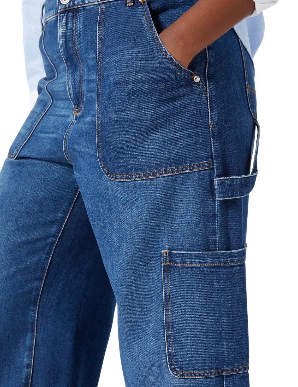 Джинси виготовлені з бавовни та ліоцелу. Модель виконана у вільному крої. Має петлі для ременя, приховану застібку-блискавку з ґудзиком, накладну кишеню на штанині, а також пару передніх і пару задніх накладних кишень.