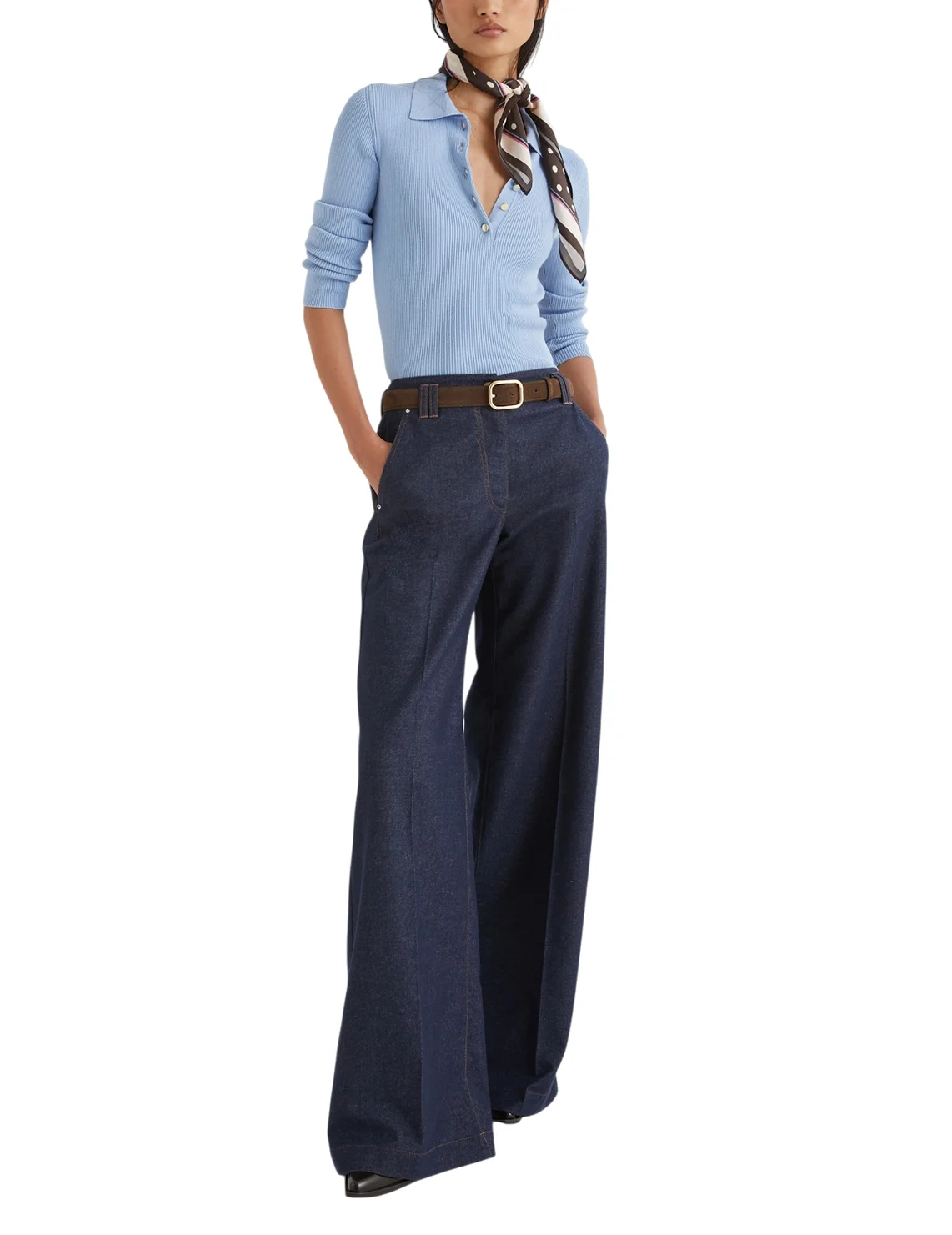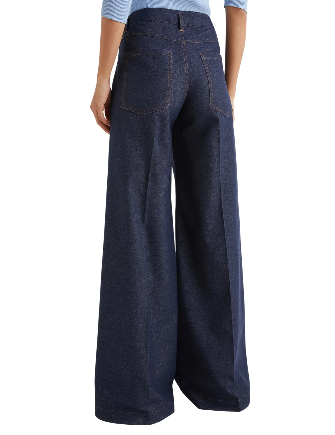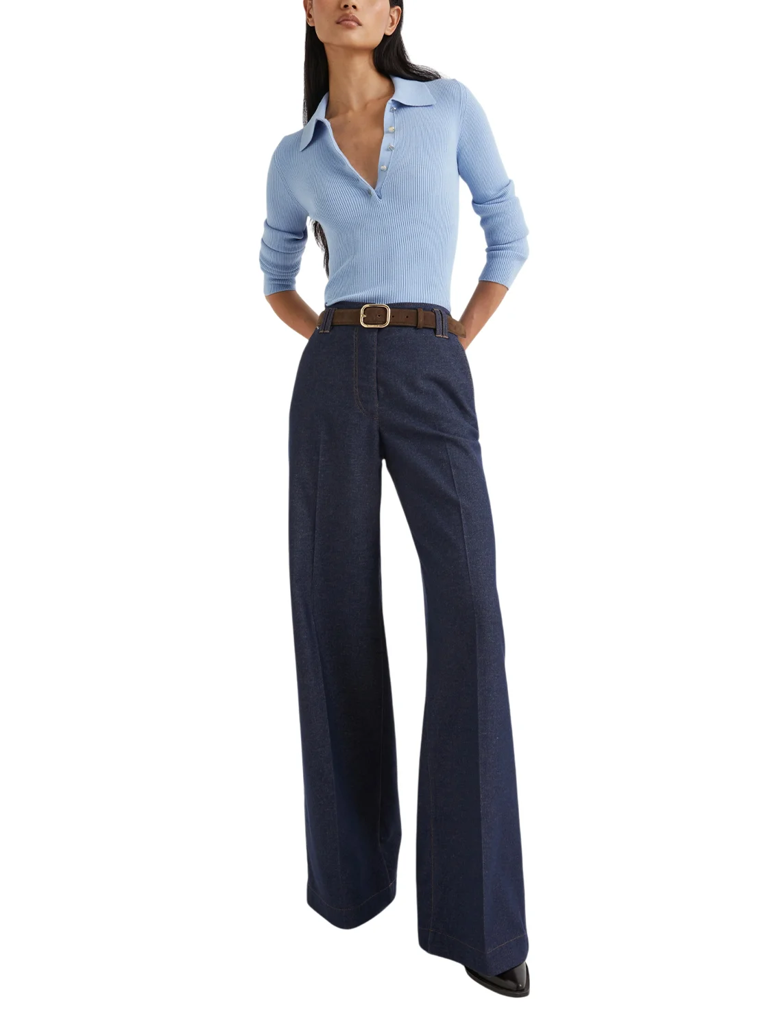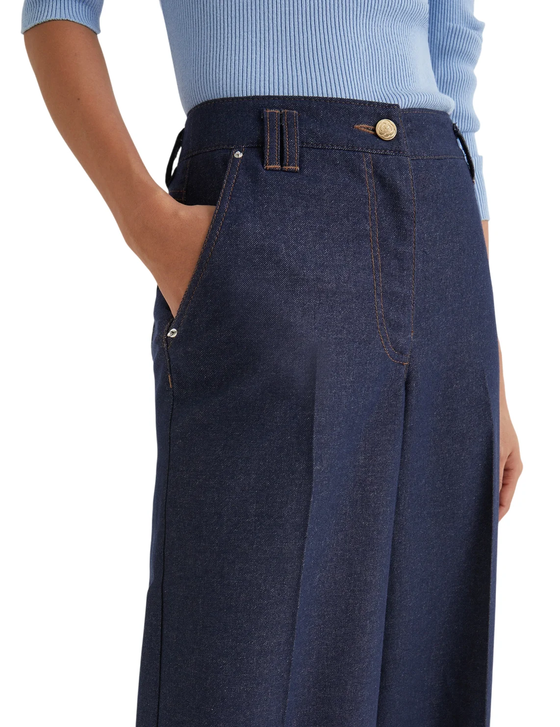 Джинси виготовлені з бавовни, поліестеру, віскози та еластану. Модель виконана в розкльошеному крої. Має петлі для ременя, приховану застібку на блискавку з ґудзиком, пресовані стрілки, прорізні бічні та накладні задні кишені.