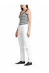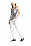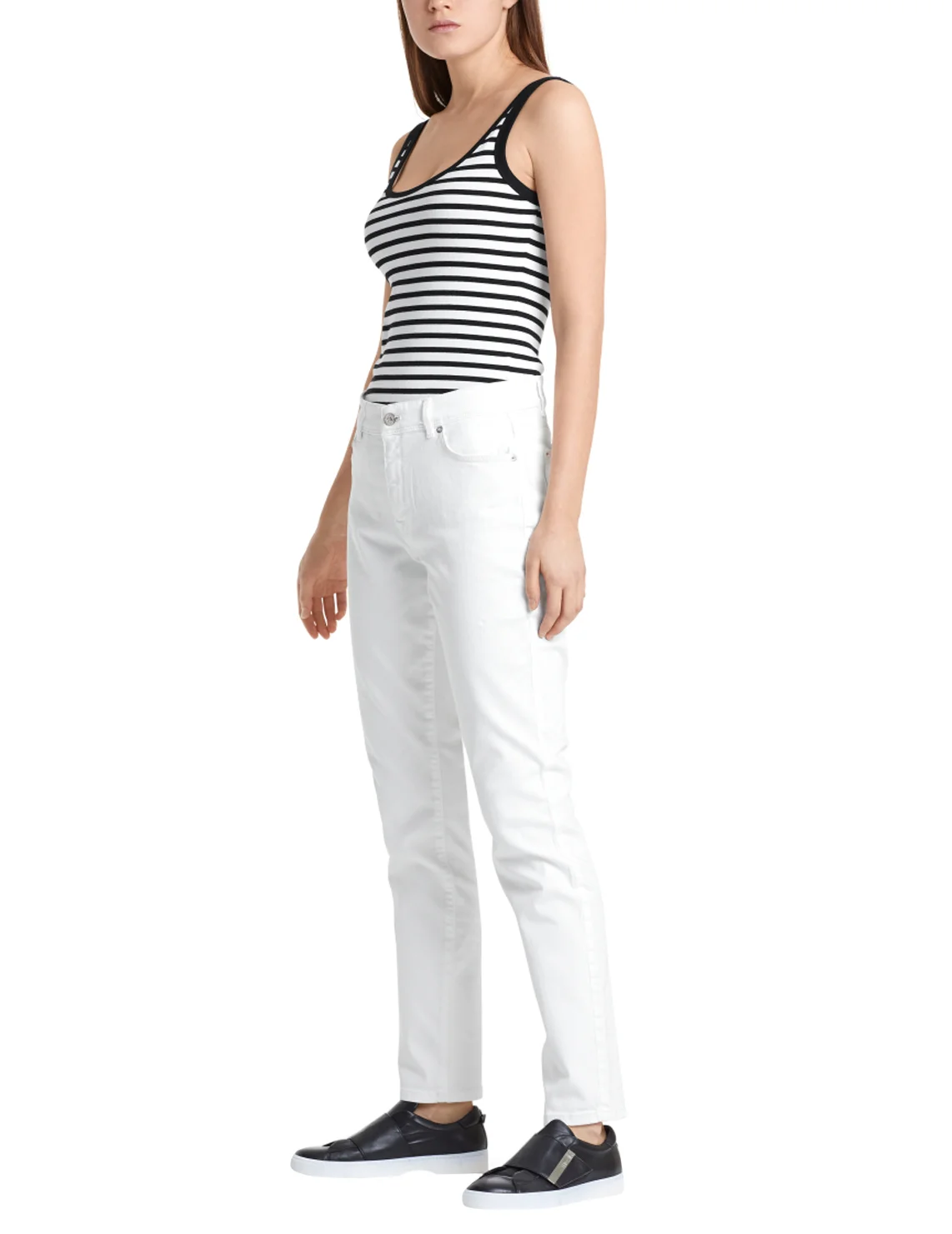 Джинси виготовлені з бавовни та еластану. Модель виконана в звуженому крої. Має петлі для ременя, приховану застібку-блискавку з ґудзиком, дві бічні та дві задні накладні кишені.