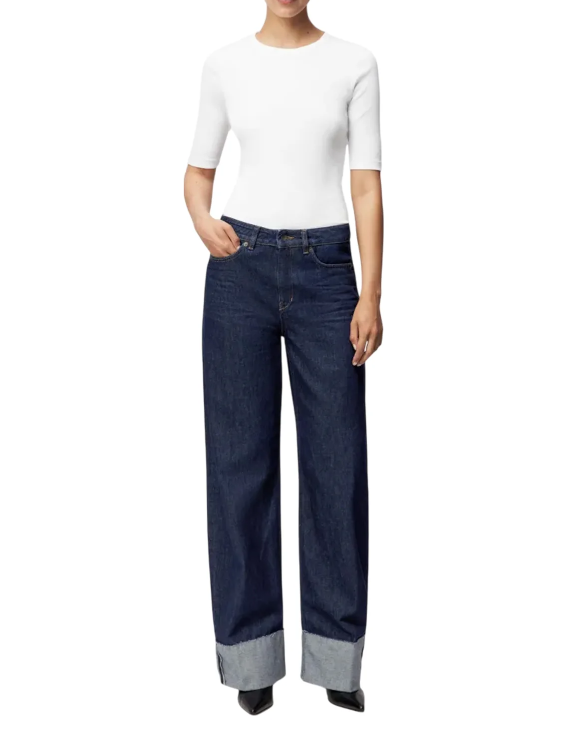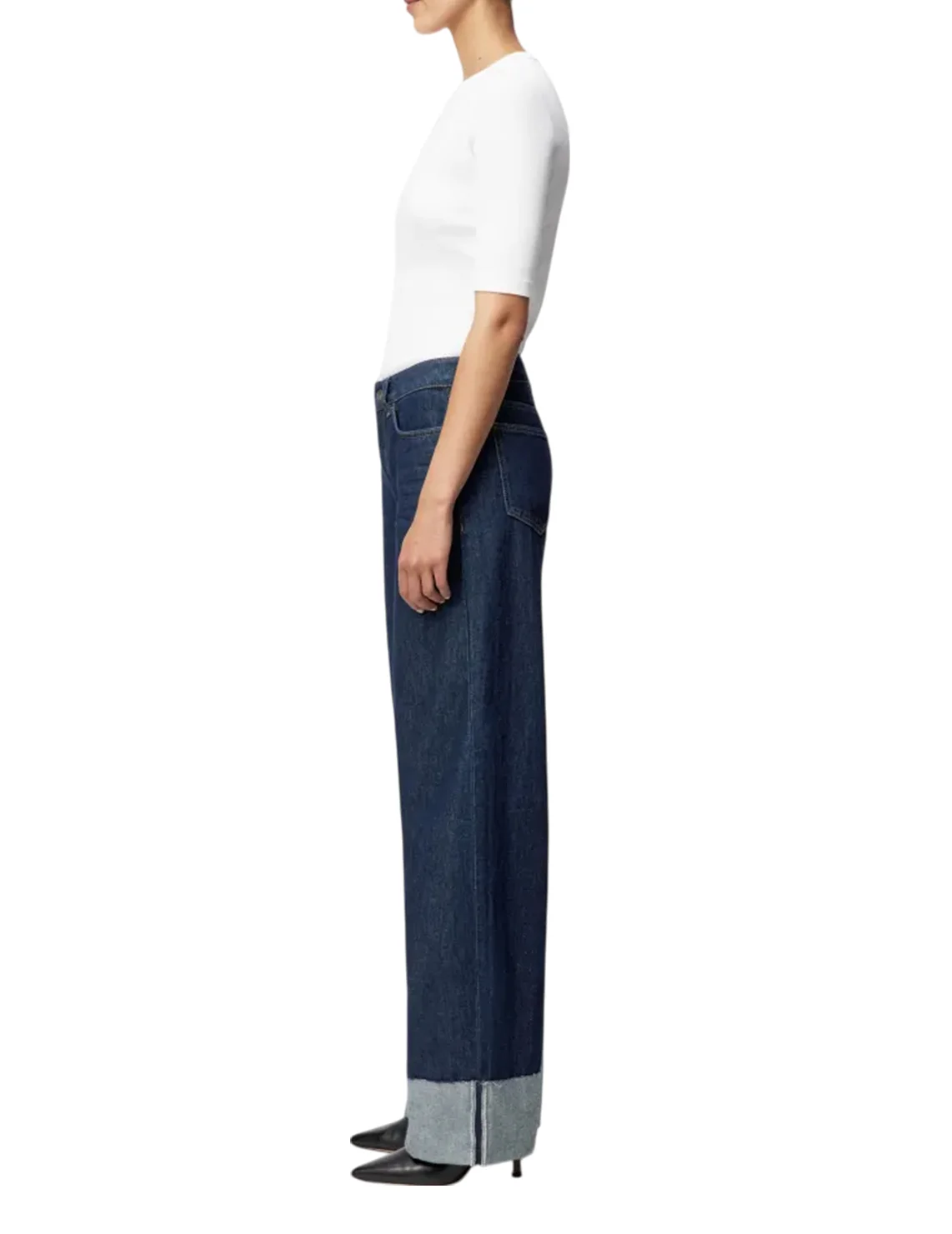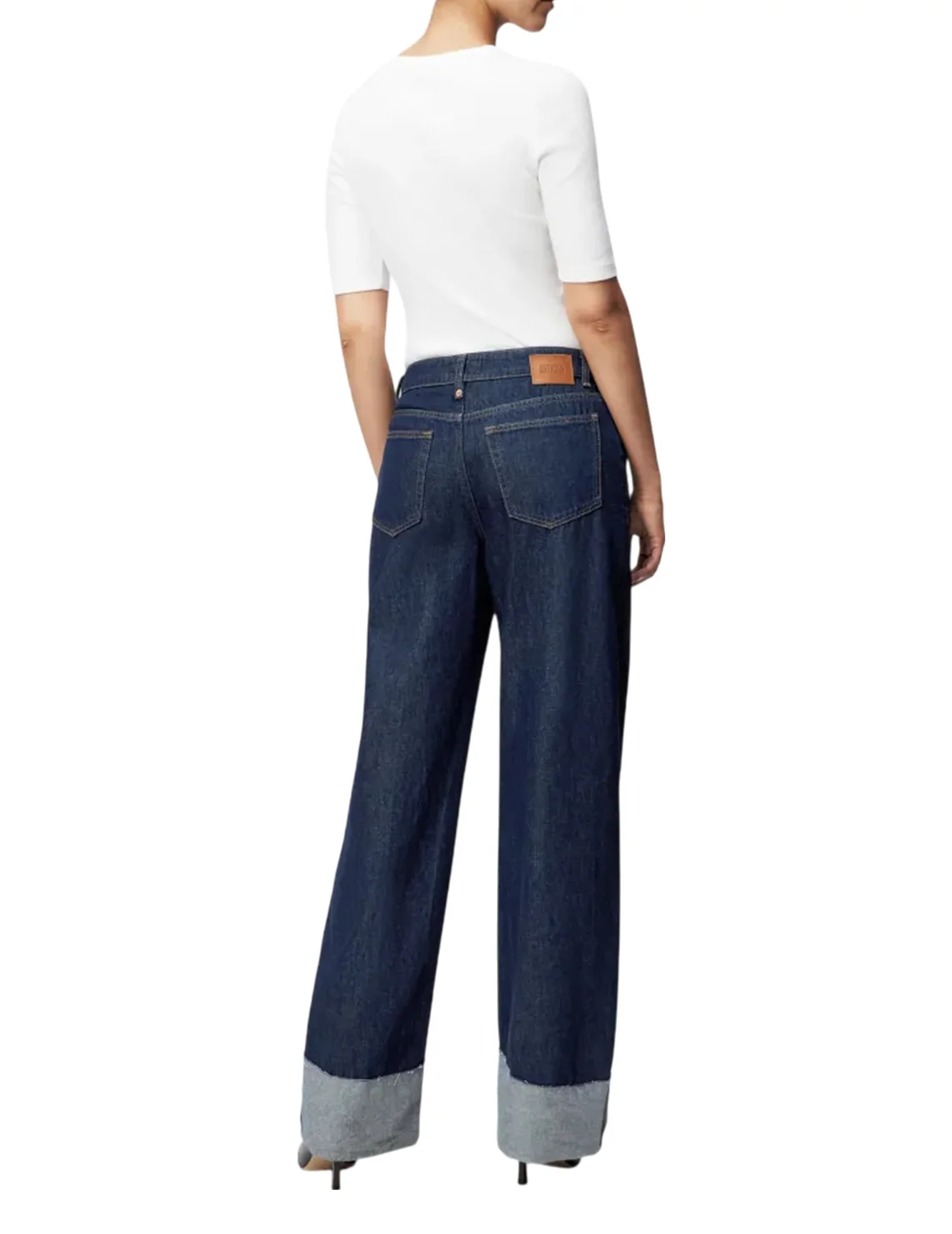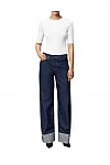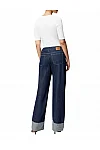 Джинси виготовлені зі 100% натуральної бавовни. Модель виконана у вільному крої. Має петлі для ременя, приховану застібку-блискавку з ґудзиком, відвороти з бахромою, а також пару передніх і пару задніх накладних кишень.