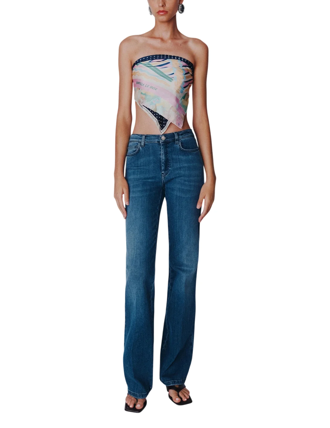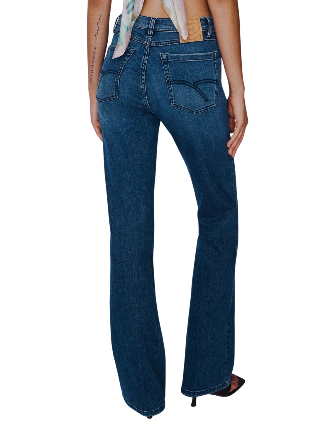 Джинси виготовлені з модалу, бавовни, еластомультіестеру й еластану. Модель виконана в звуженому крої, розкльошені знизу. Має шльовки для ременя, приховану застібку-блискавку з ґудзиком, пару передніх прорізних і пару задніх накладних кишень.