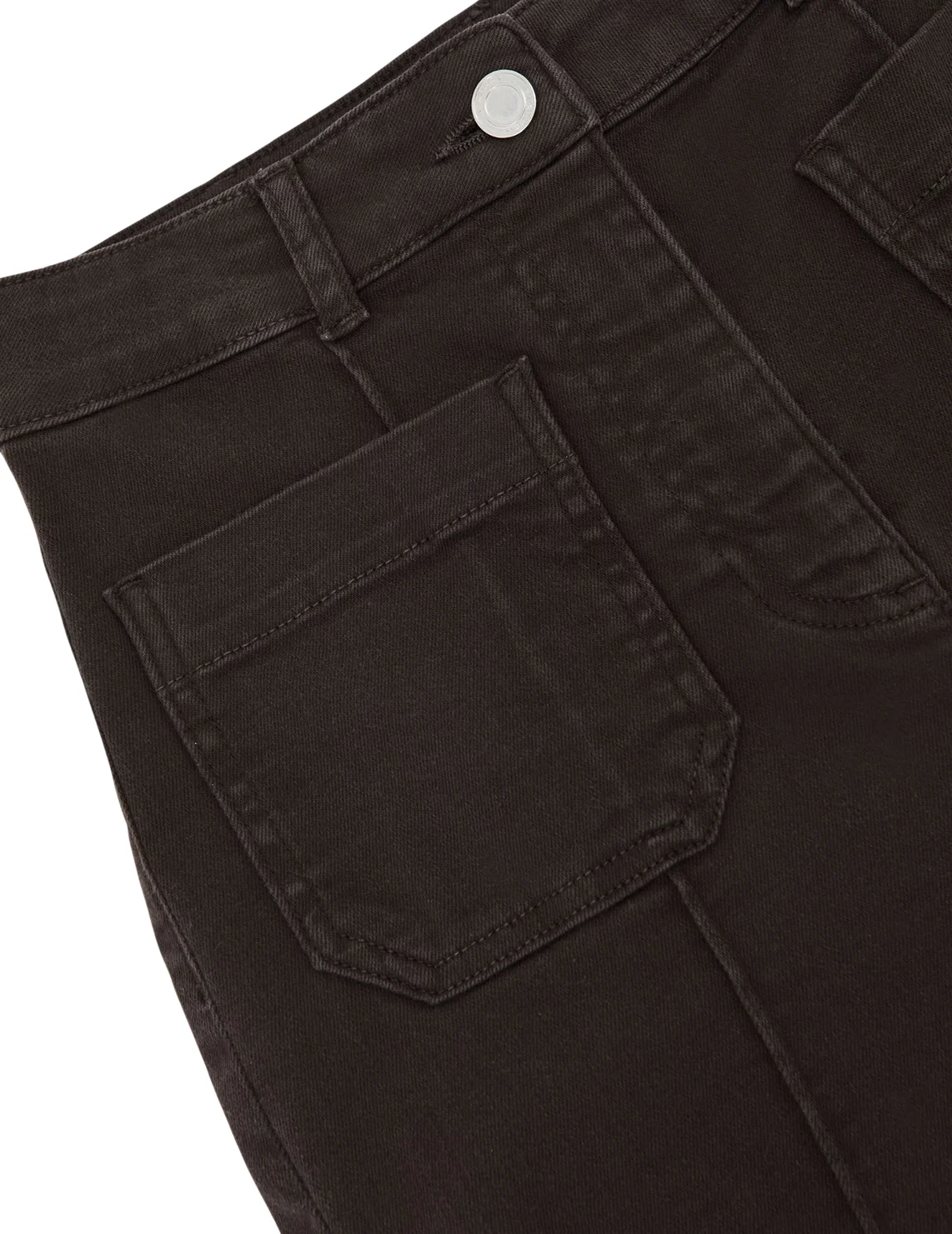 Джинси виготовлені з бавовни, поліестеру, ліоцелу й еластану. Модель виконана в розкльошеному крої. Має шльовки для ременя, приховану застібку-блискавку з ґудзиком, прострочені стрілки, а також пару передніх і пару задніх накладних кишень.
