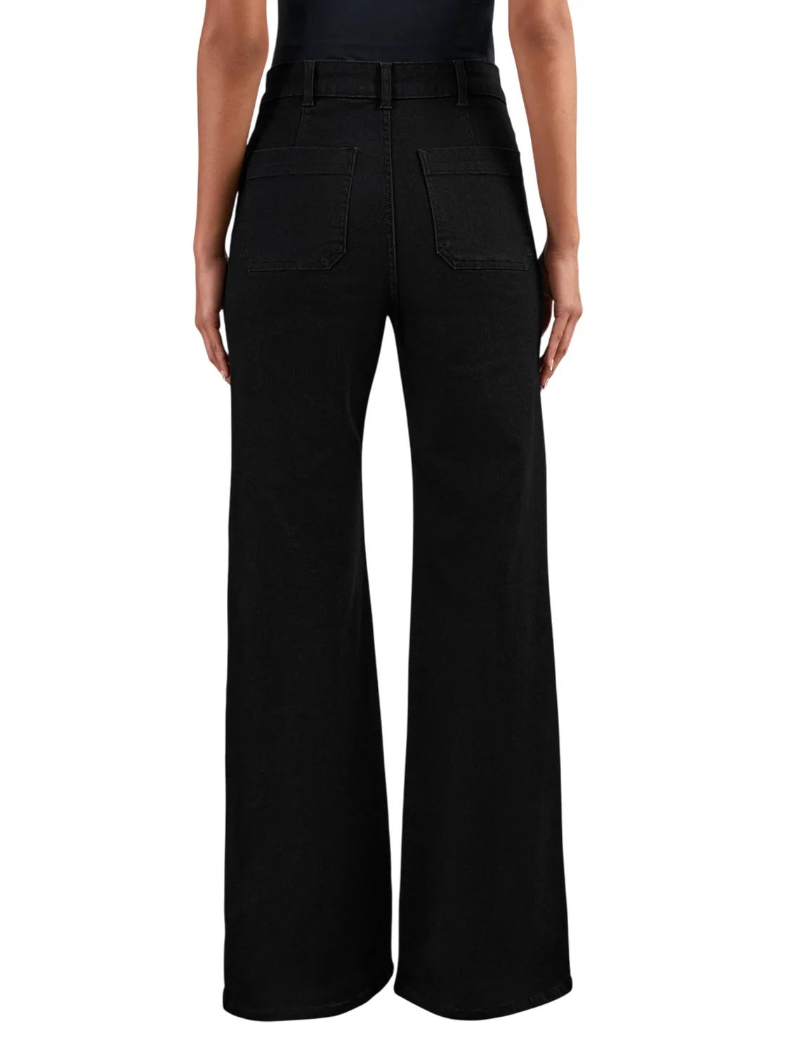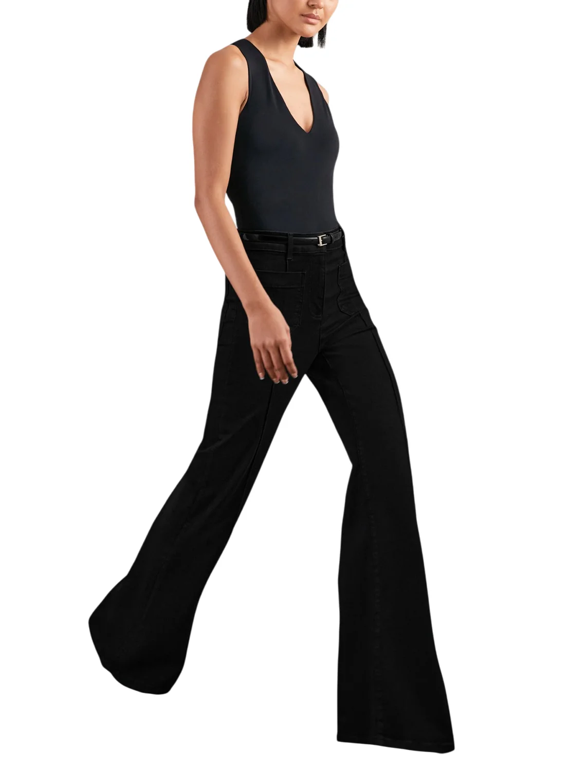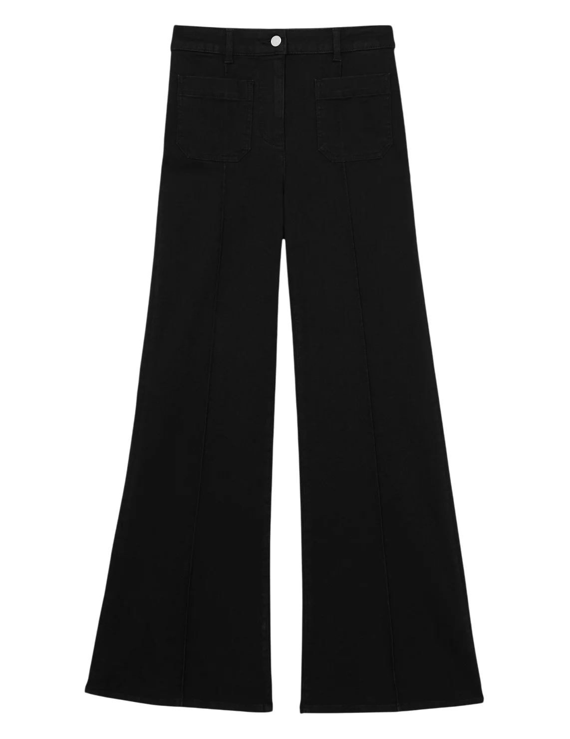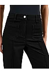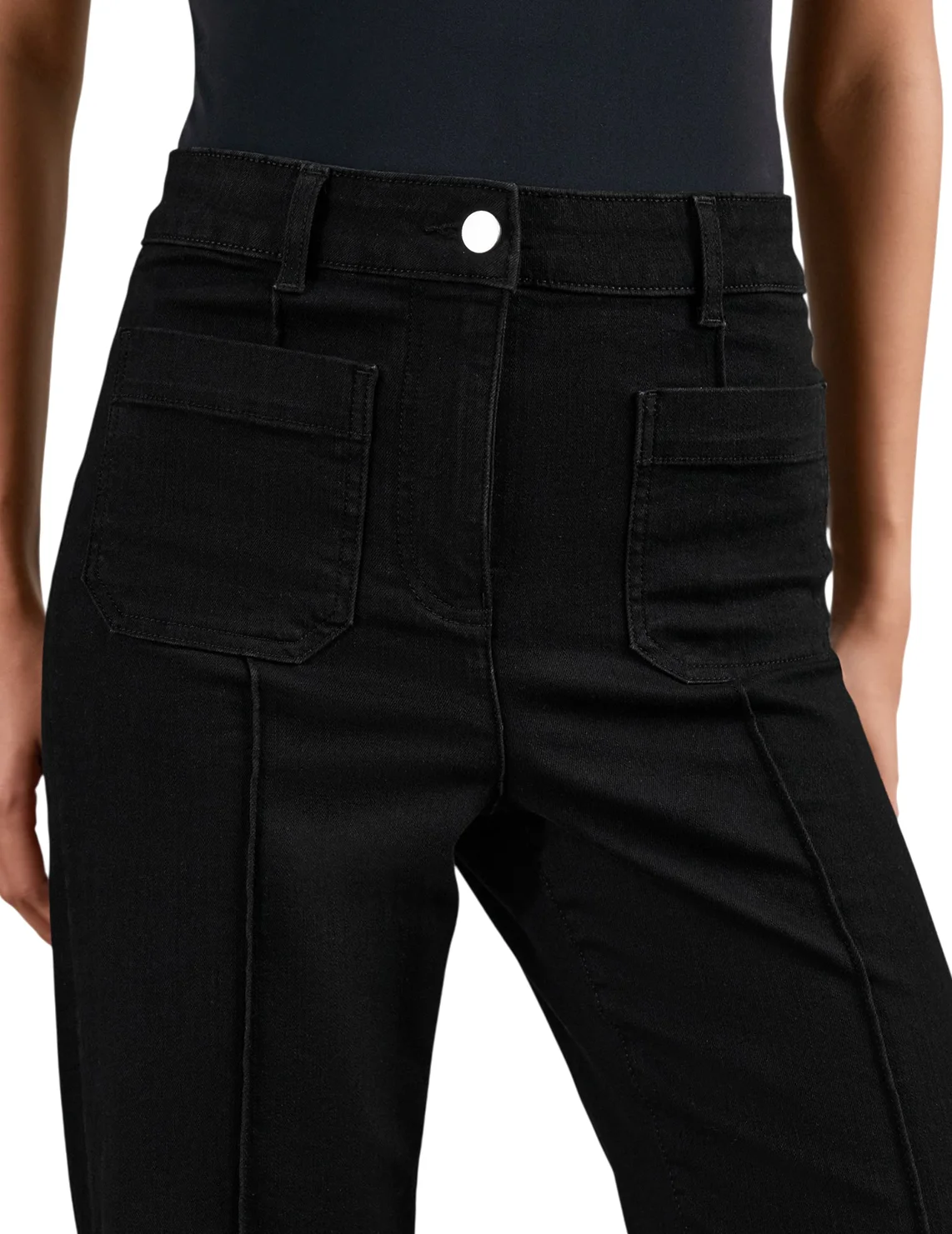 Джинси виготовлені з бавовни, поліестеру, ліоцелу й еластану. Модель виконана в розкльошеному крої. Має шльовки для ременя, приховану застібку-блискавку з ґудзиком, прострочені стрілки, а також пару передніх і пару задніх накладних кишень.