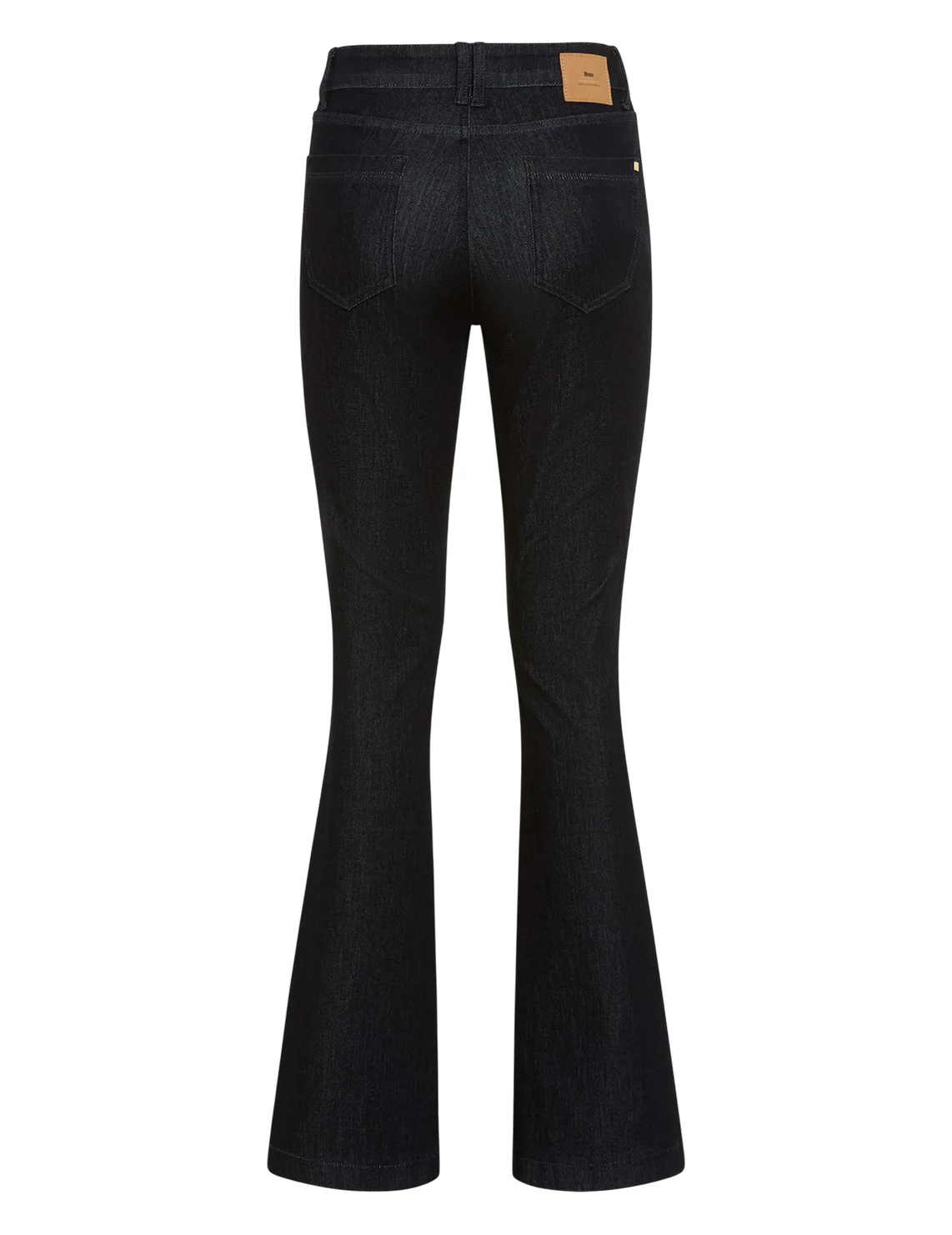 Джинси виготовлені з бавовни, поліестеру, віскози та еластану. Модель виконана в розкльошеному крої. Має петлі для ременя, застібку-блискавку з ґудзиком, пару передніх прорізних і пару задніх накладних кишень.