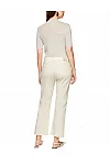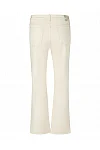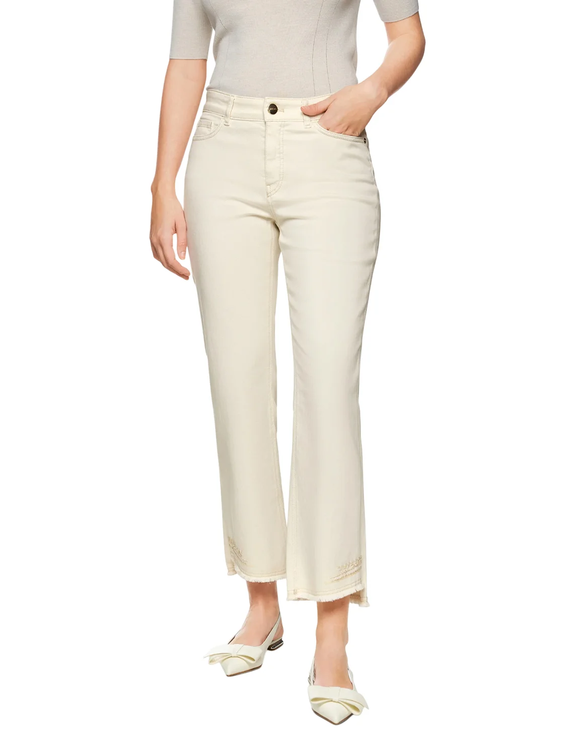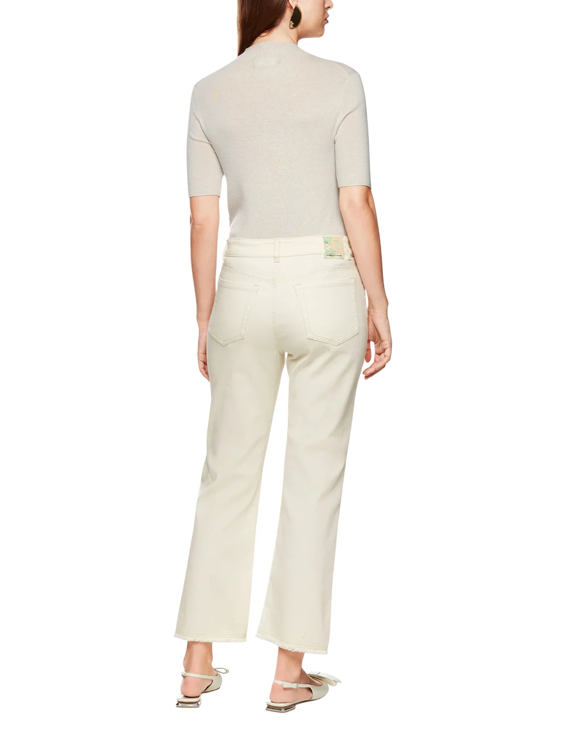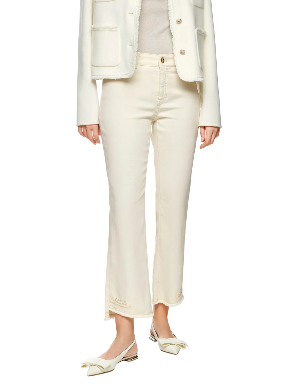 Джинси виготовлені з бавовни, еластомультіестеру й еластану. Модель виконана в розкльошеному крої. Має петлі для ременя, потайну застібку-блискавку з ґудзиком, дві бічні та дві задні накладні кишені. Декоровані дрібною бахромою на подолі штанин і паєтками.