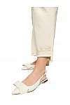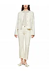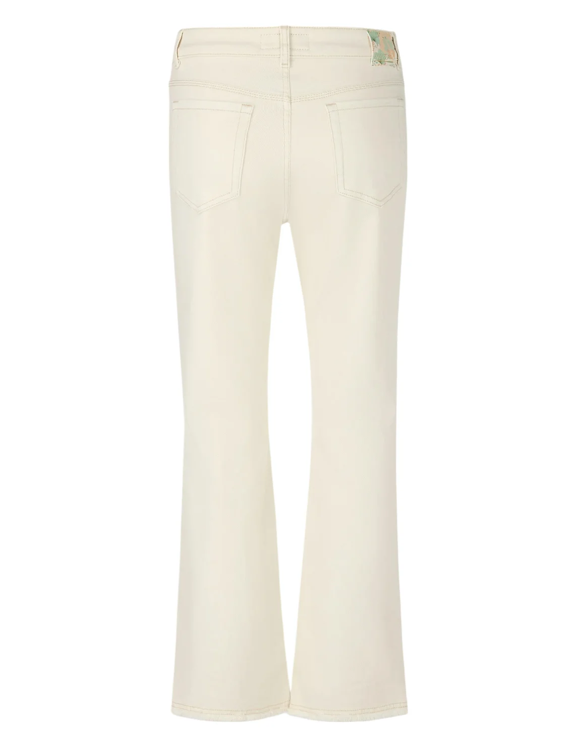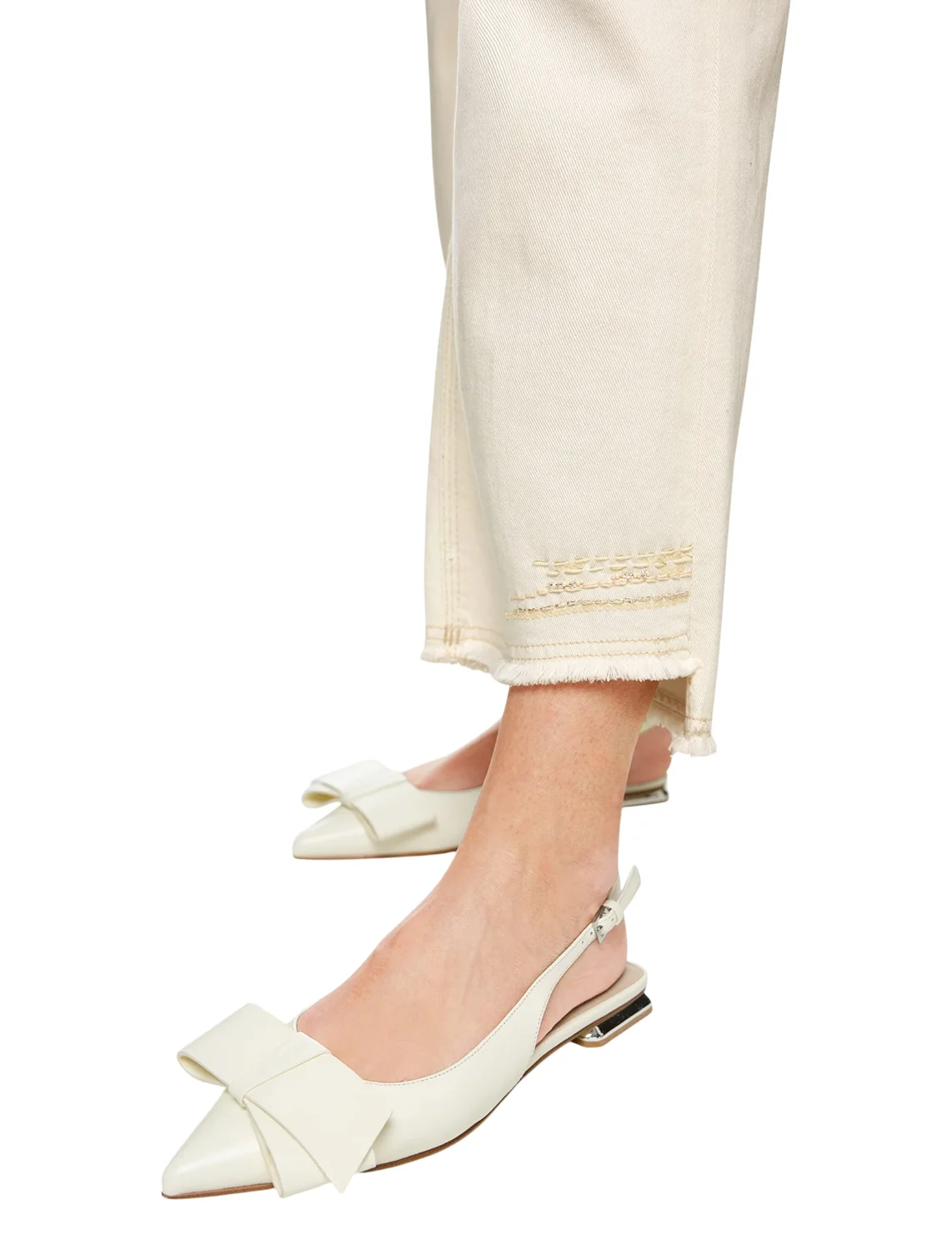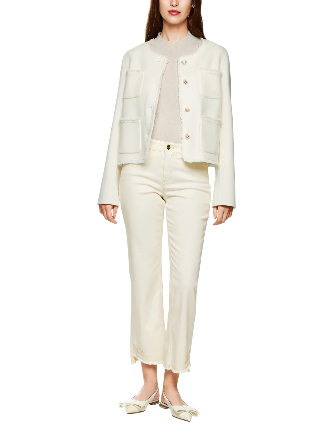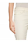 Джинси виготовлені з бавовни, еластомультіестеру й еластану. Модель виконана в розкльошеному крої. Має петлі для ременя, потайну застібку-блискавку з ґудзиком, дві бічні та дві задні накладні кишені. Декоровані дрібною бахромою на подолі штанин і паєтками.