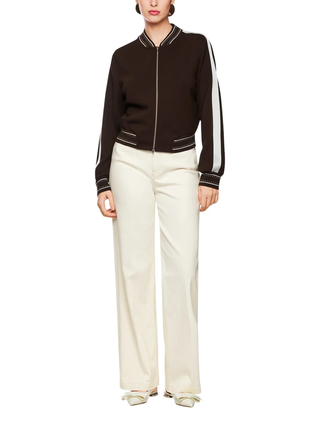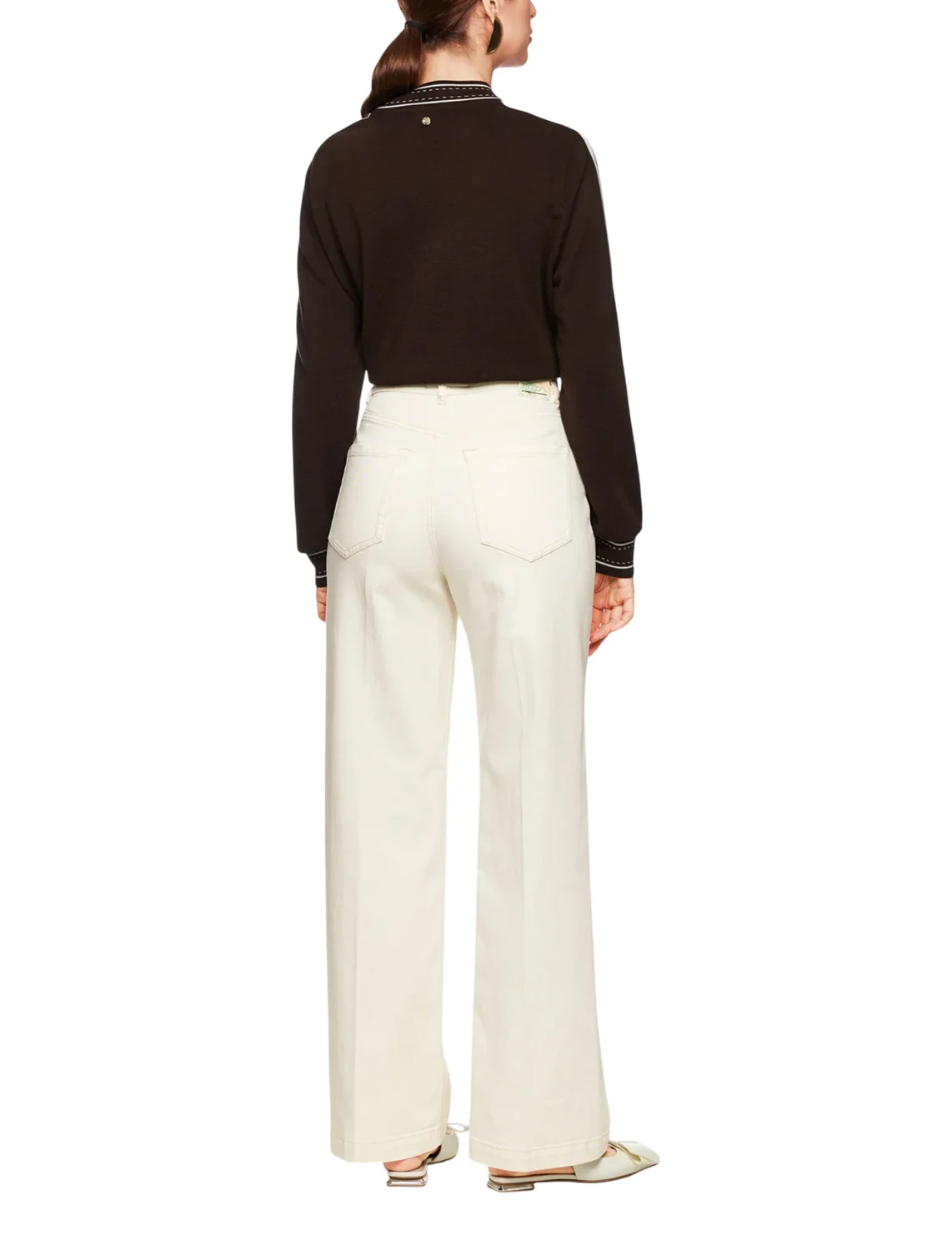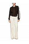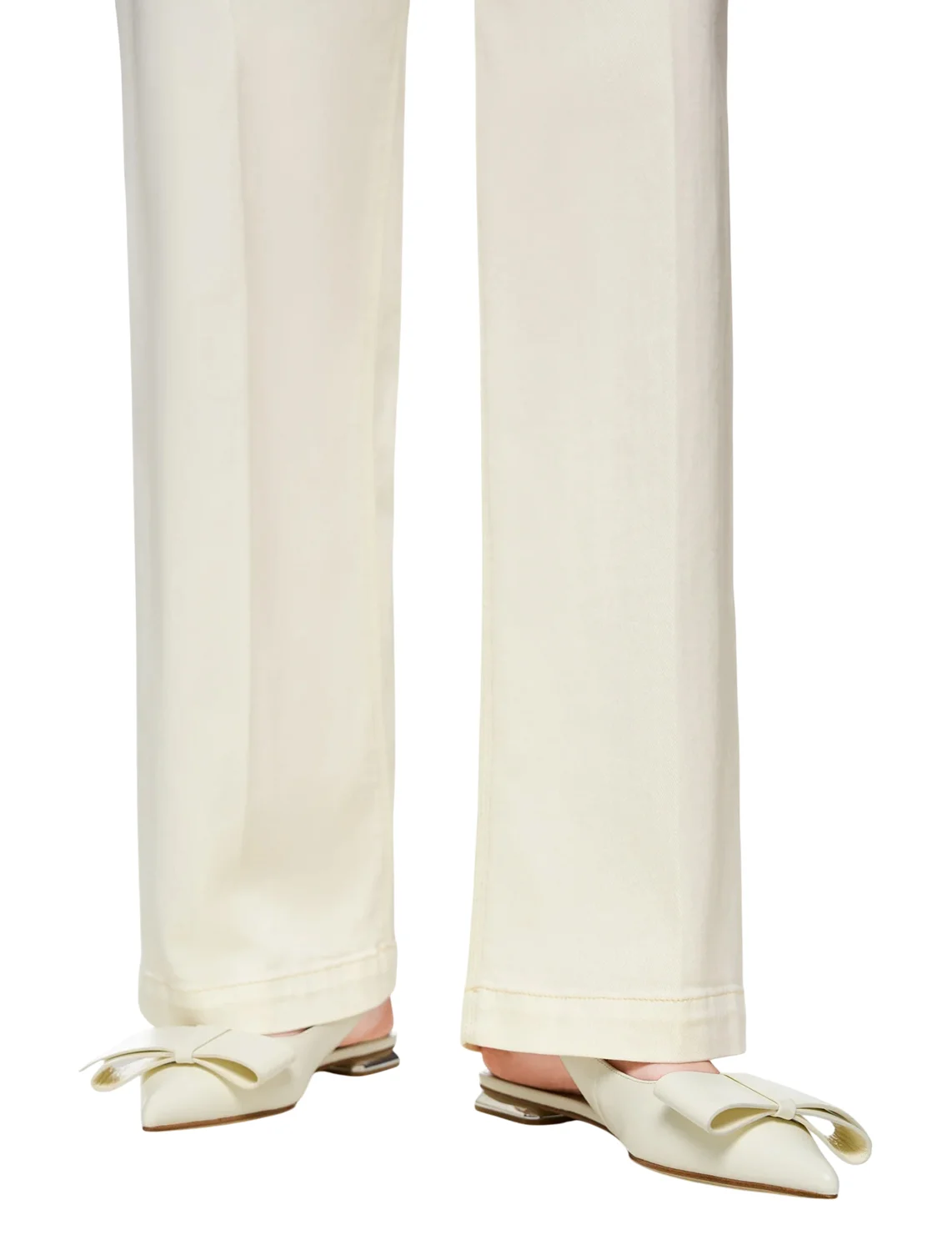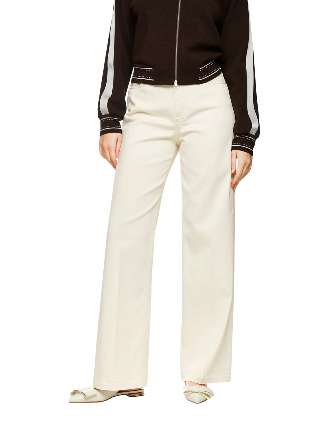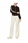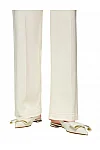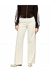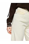 Джинси виготовлені з бавовни, еластомультіестеру й еластану. Модель виконана у вільному крої. Має петлі для ременя, потаємну застібку-блискавку з ґудзиком, пресовані стрілки, дві бічні прорізні та дві задні накладні кишені. Декоровані паєтками.