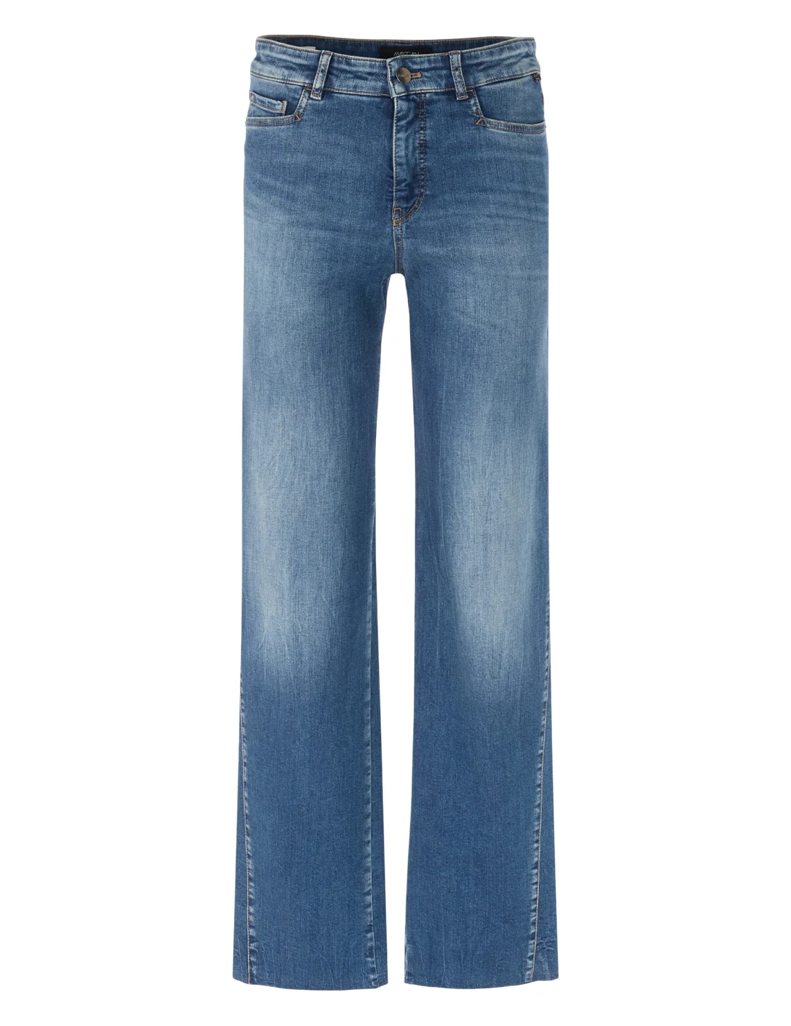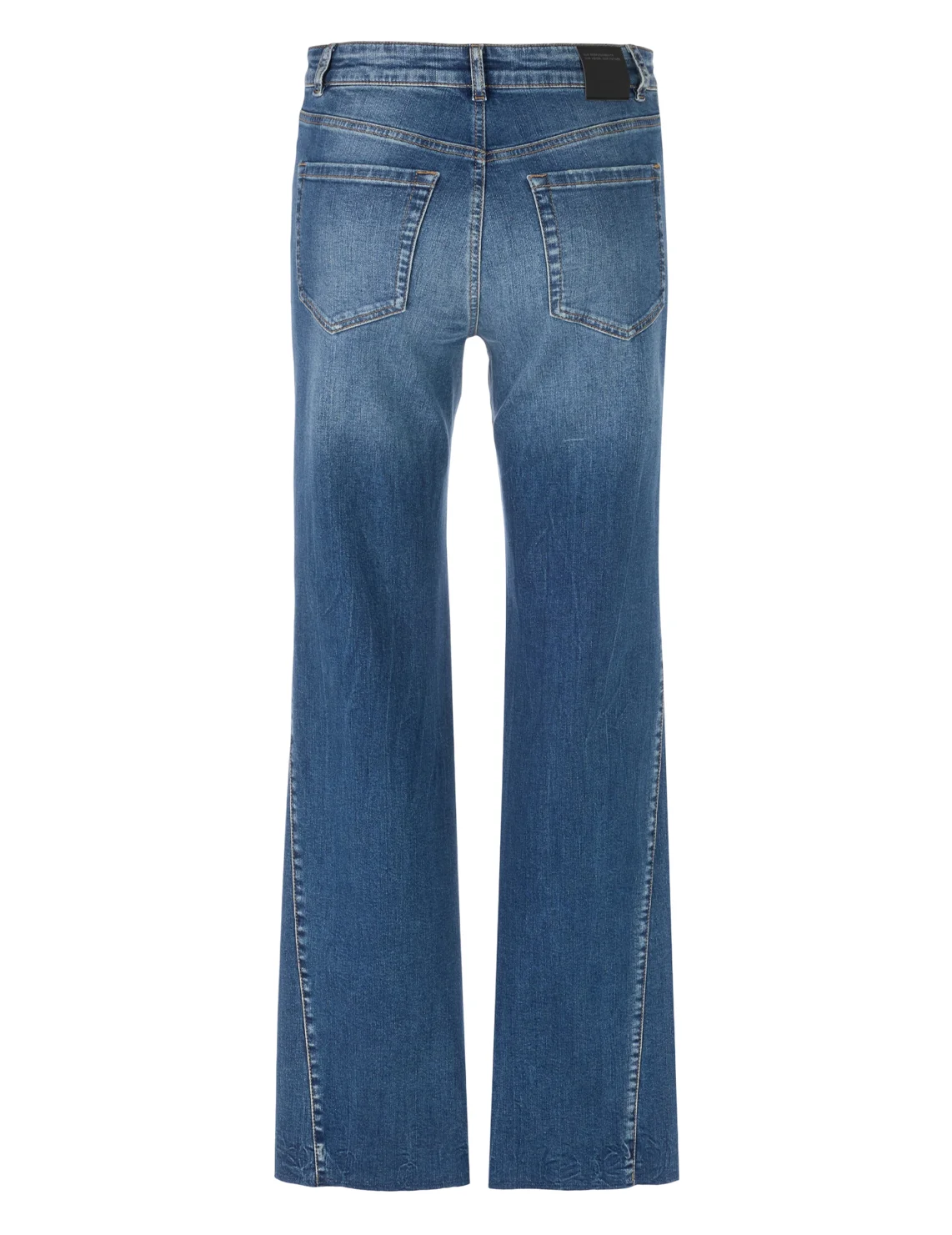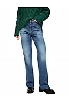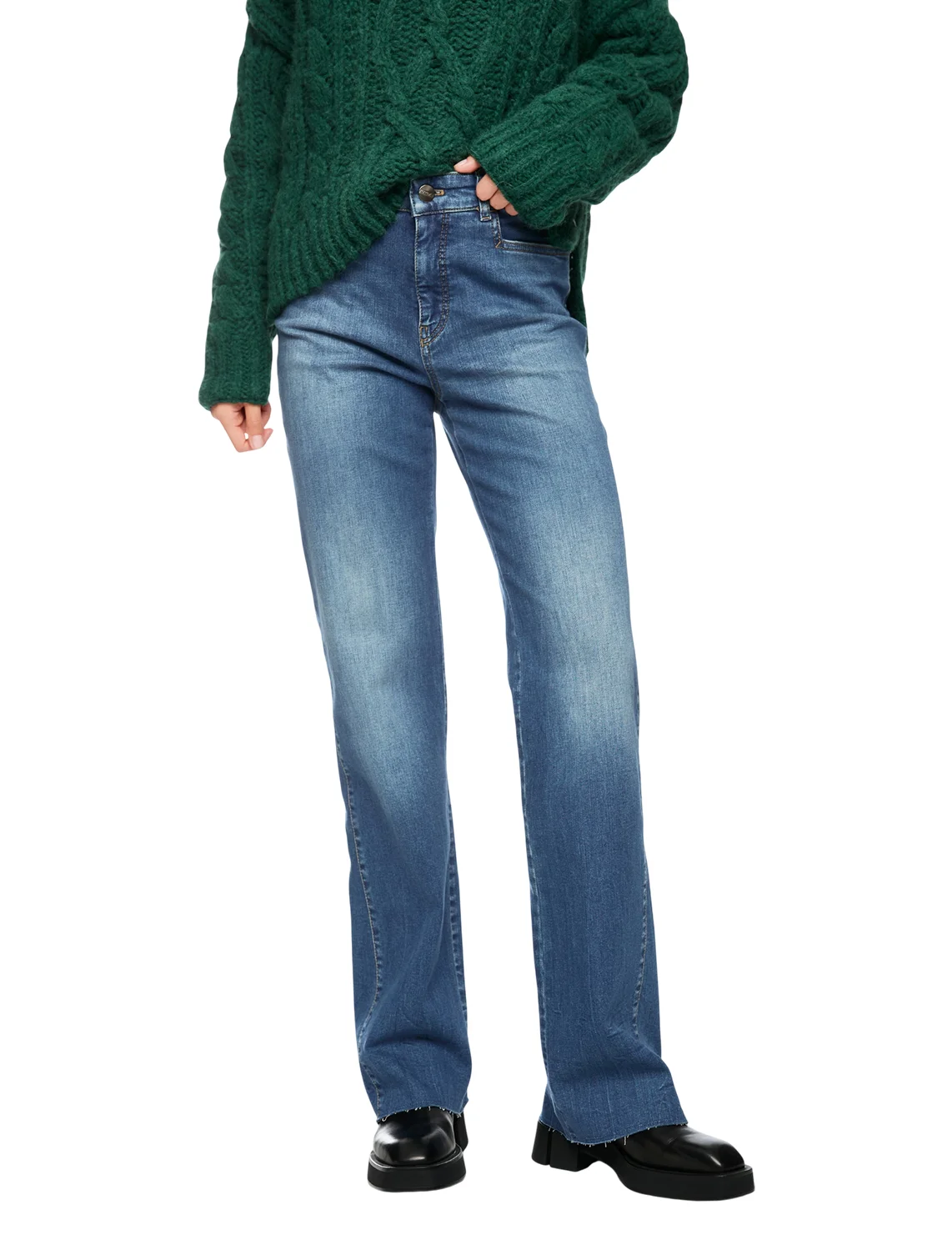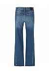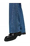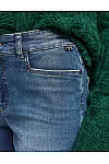 Джинси виготовлені з бавовни та еластану. Модель виконана в прямому крої. Має петлі для ременя, приховану застібку-блискавку з ґудзиком, а також пару передніх прорізних і пару задніх накладних кишень. Декоровані бахромою.