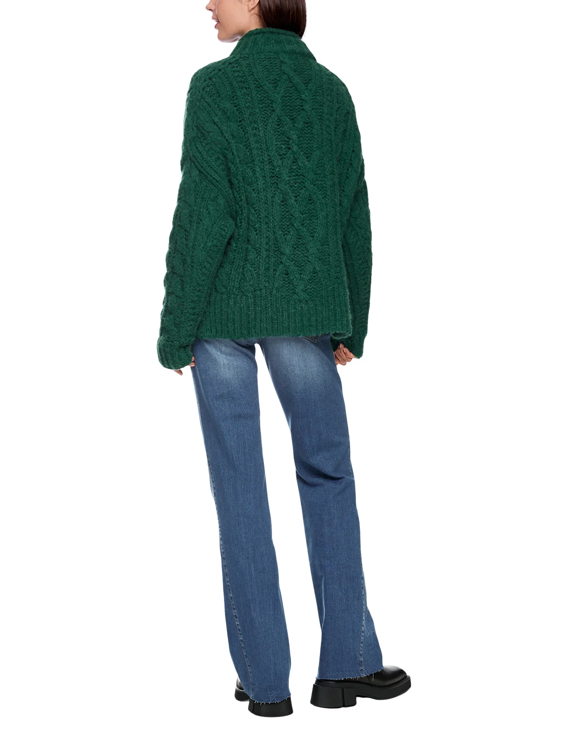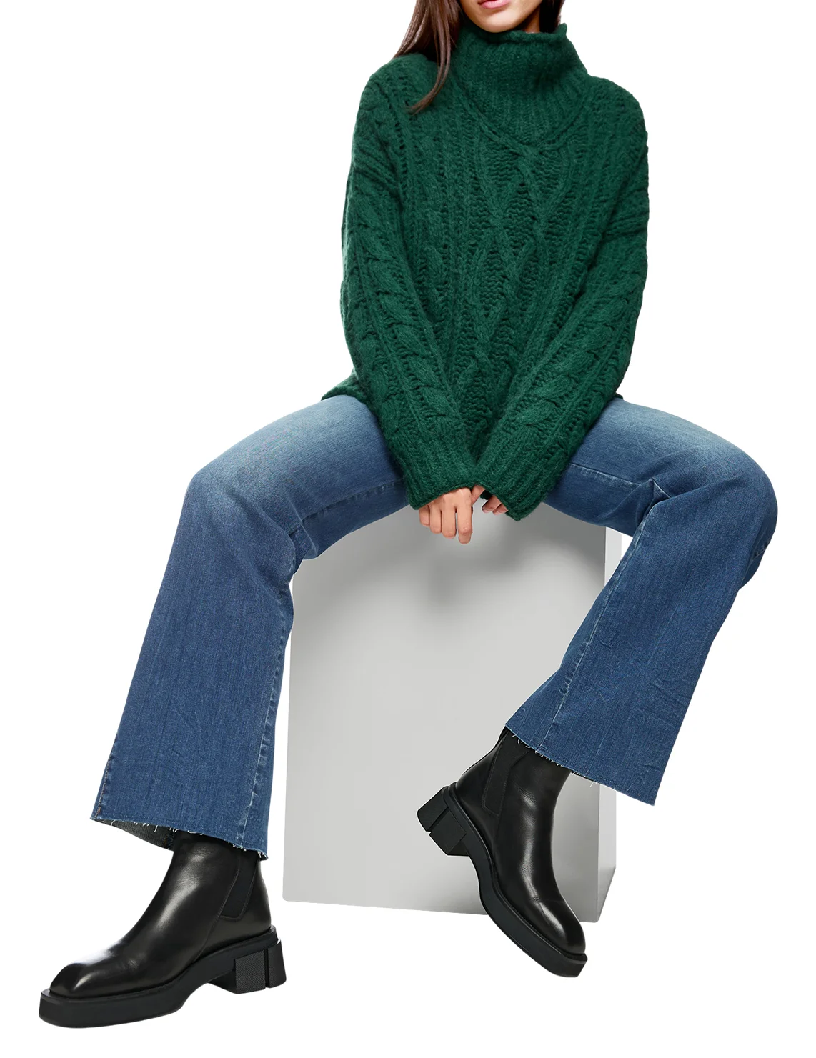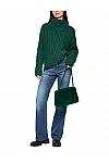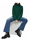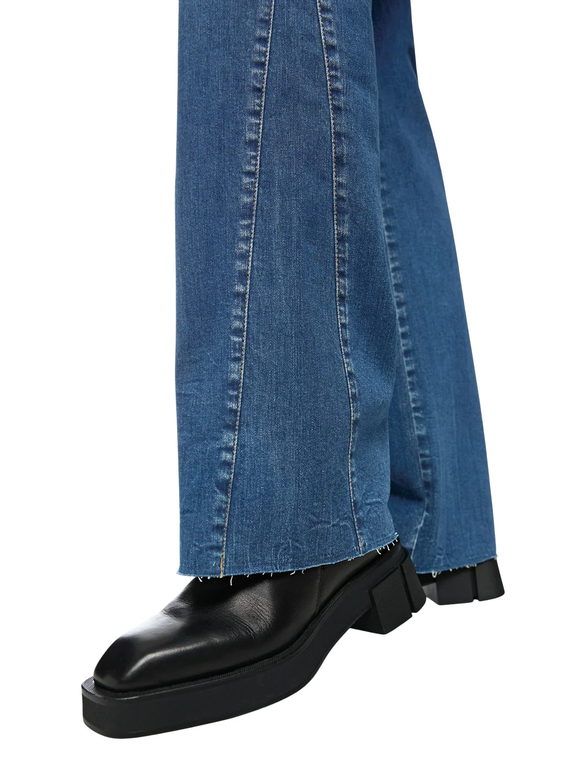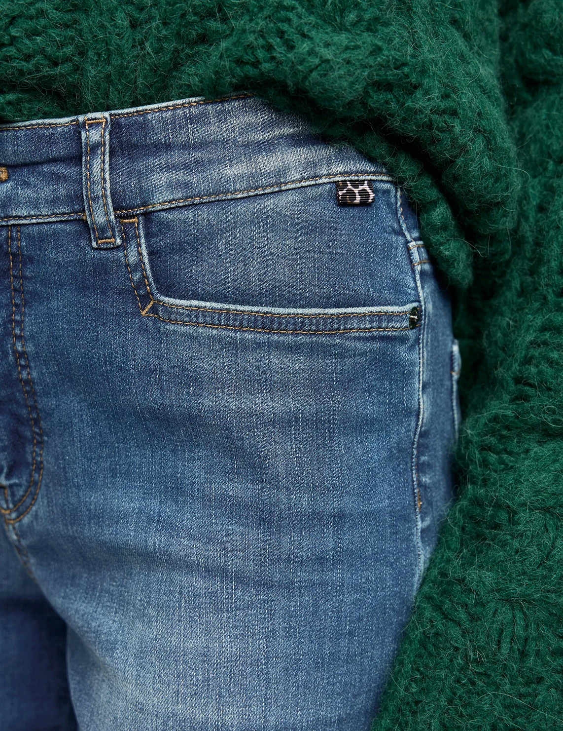 Джинси виготовлені з бавовни та еластану. Модель виконана в прямому крої. Має петлі для ременя, приховану застібку-блискавку з ґудзиком, а також пару передніх прорізних і пару задніх накладних кишень. Декоровані бахромою.