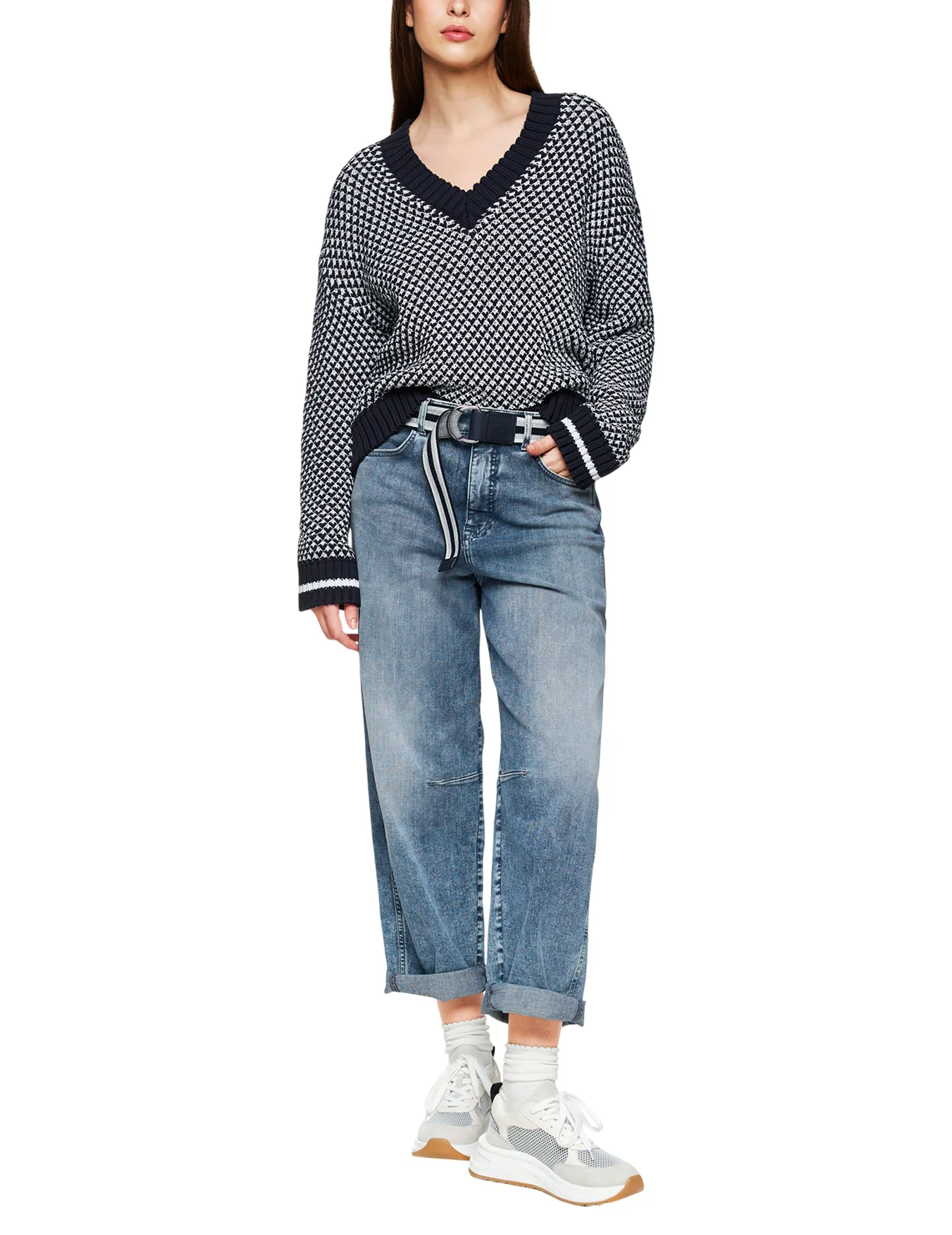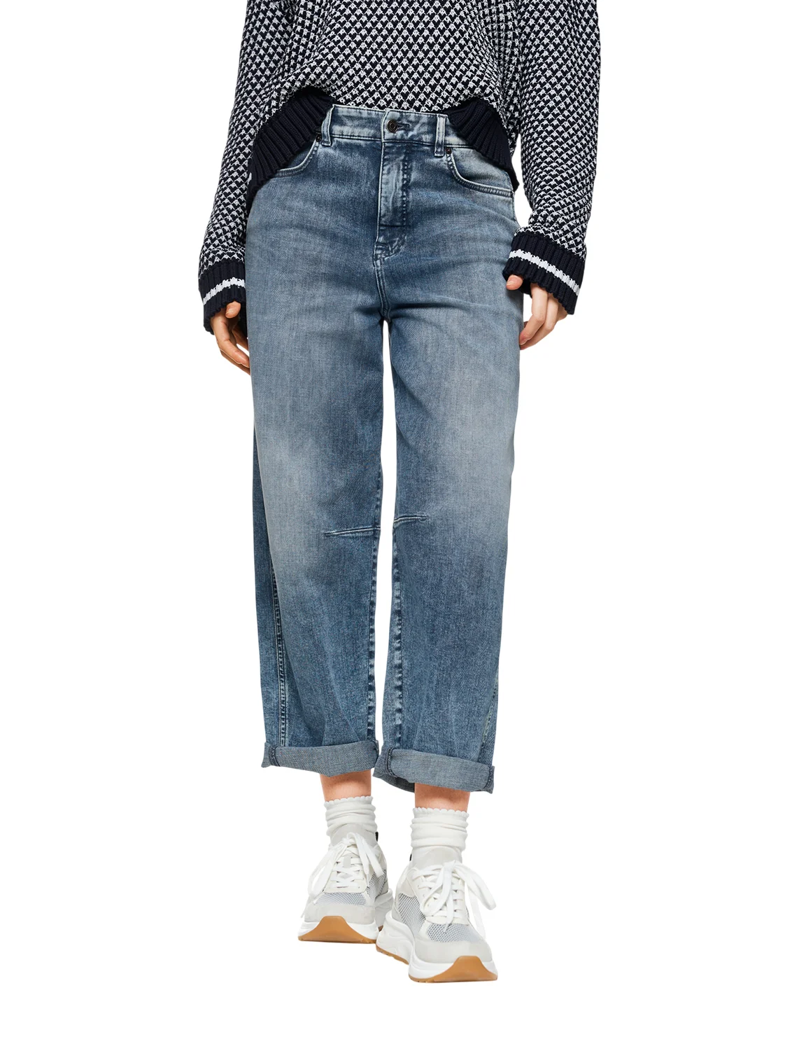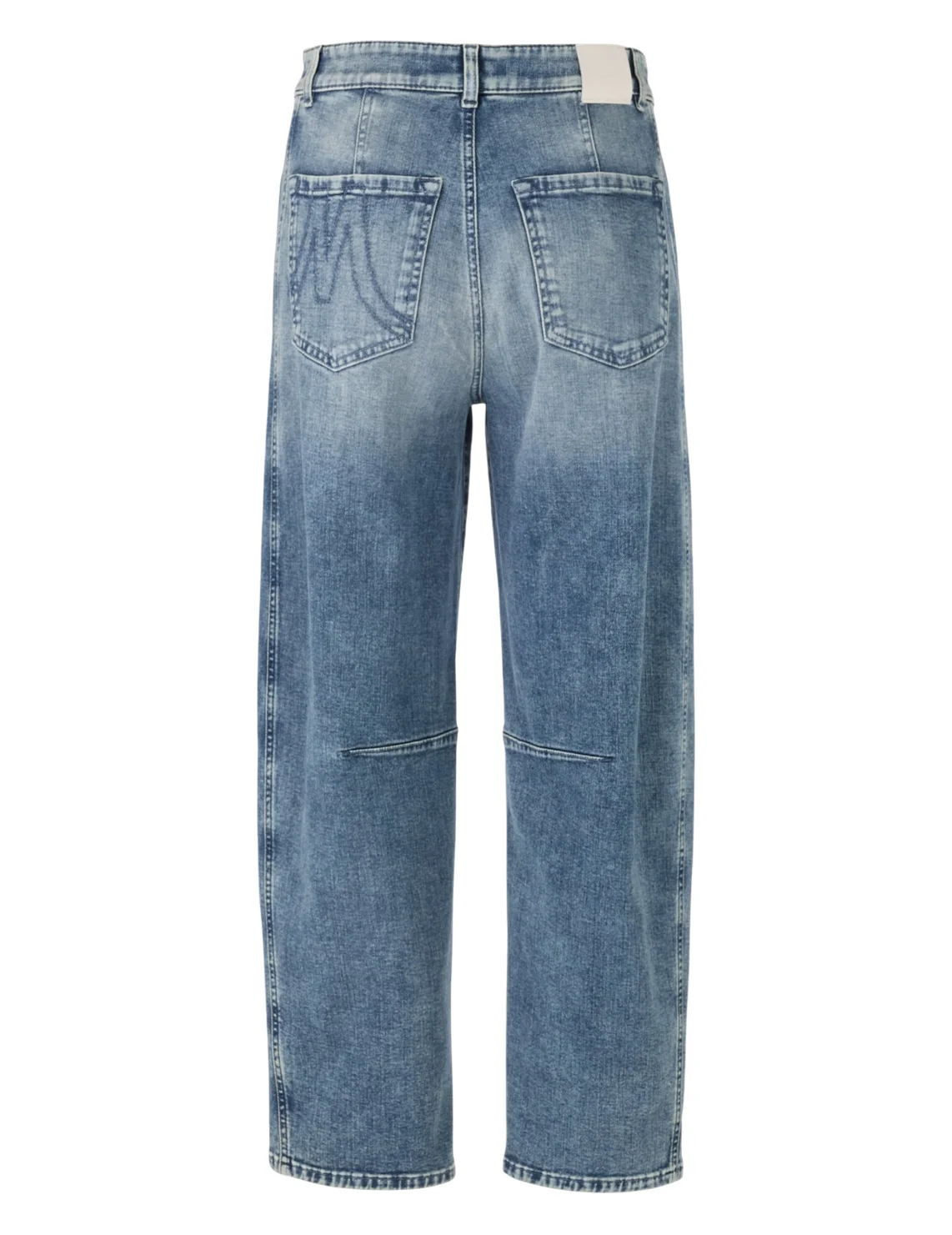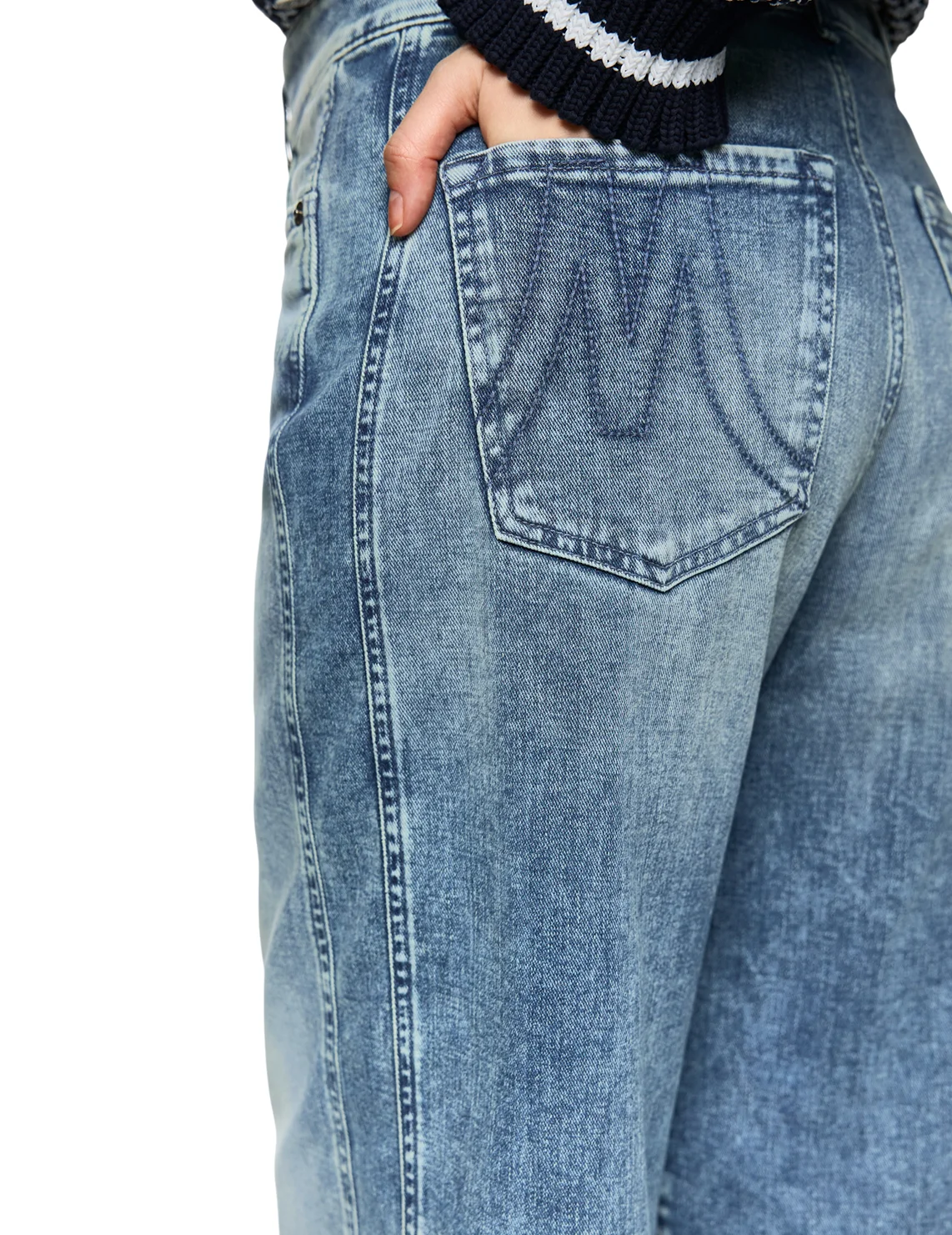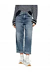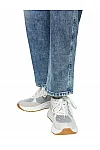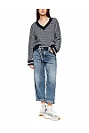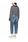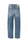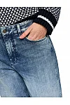 Джинси виготовлені з бавовни, еластомультіестеру й еластану. Модель виконана у прямому крої. Має петлі для ременя, приховану застібку-блискавку з ґудзиком, а також пару передніх і пару задніх накладних кишень. Декоровані бічними швами біля колін.
