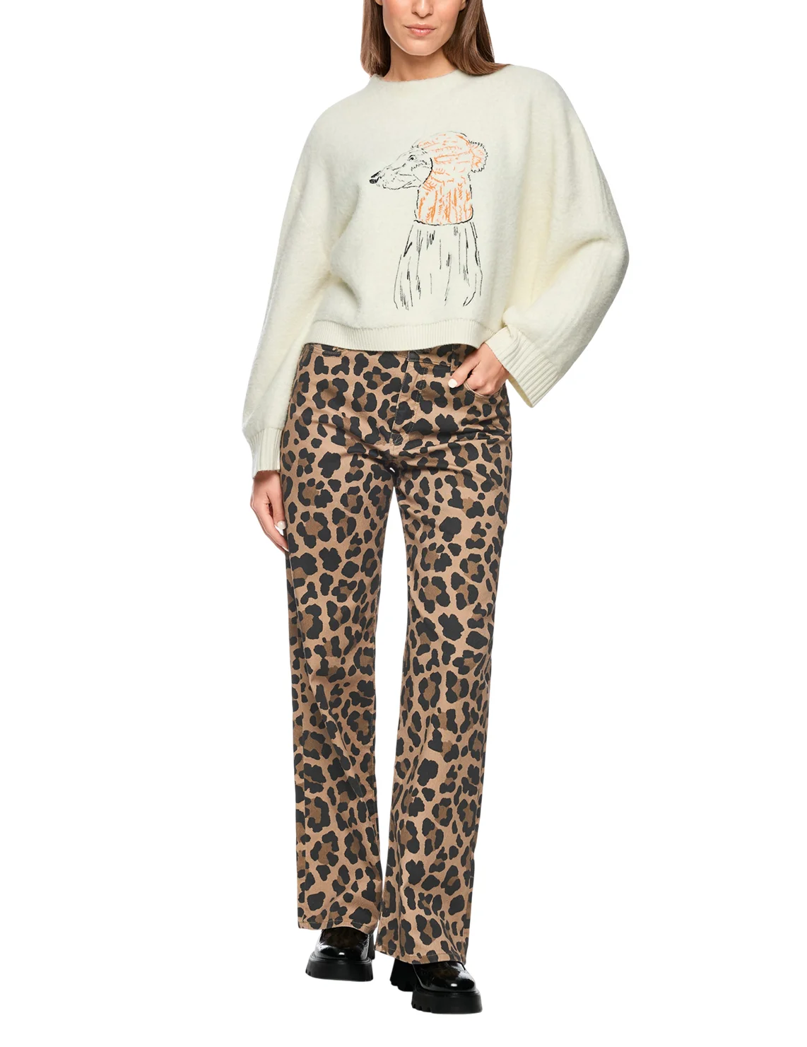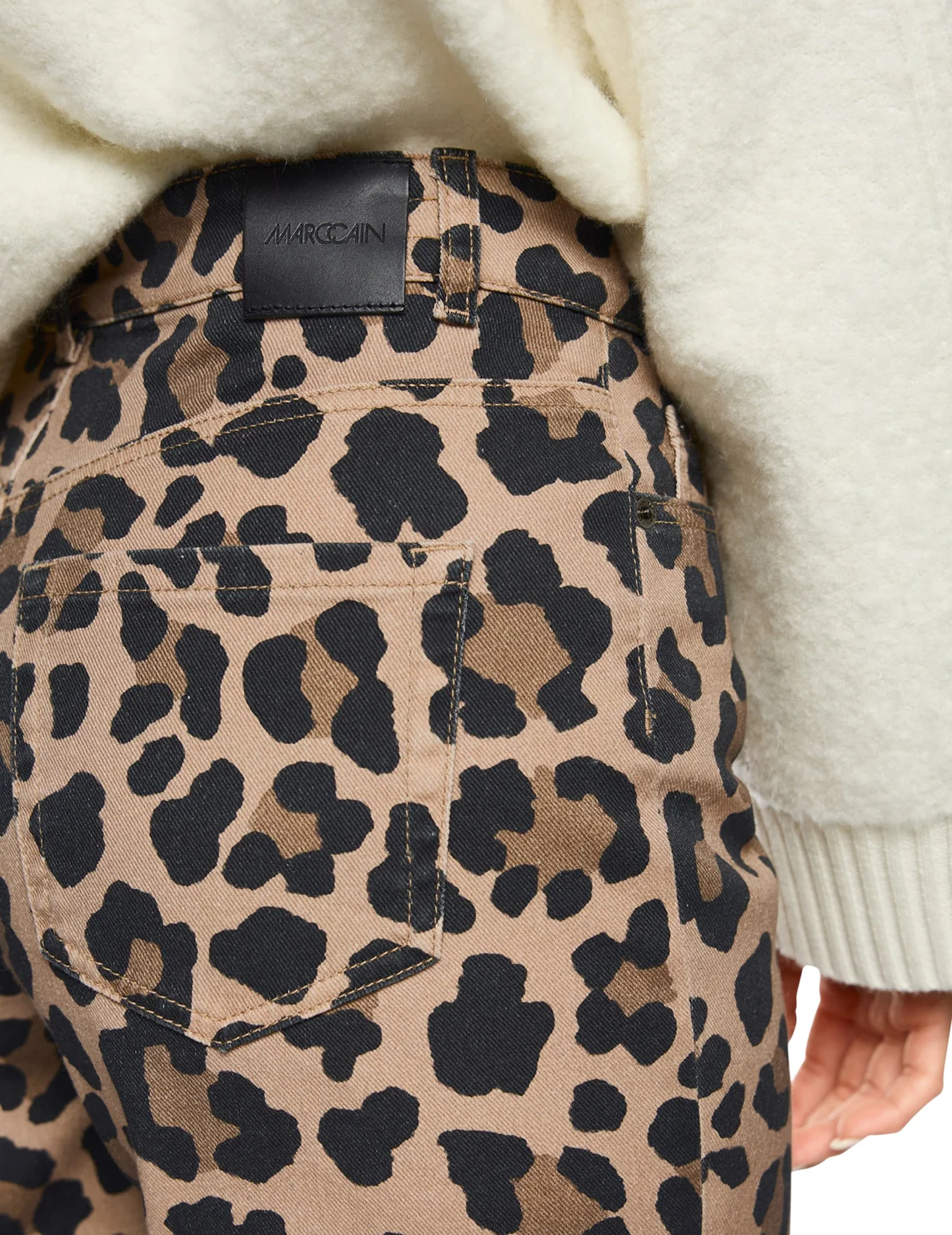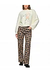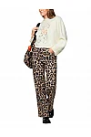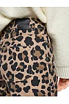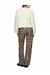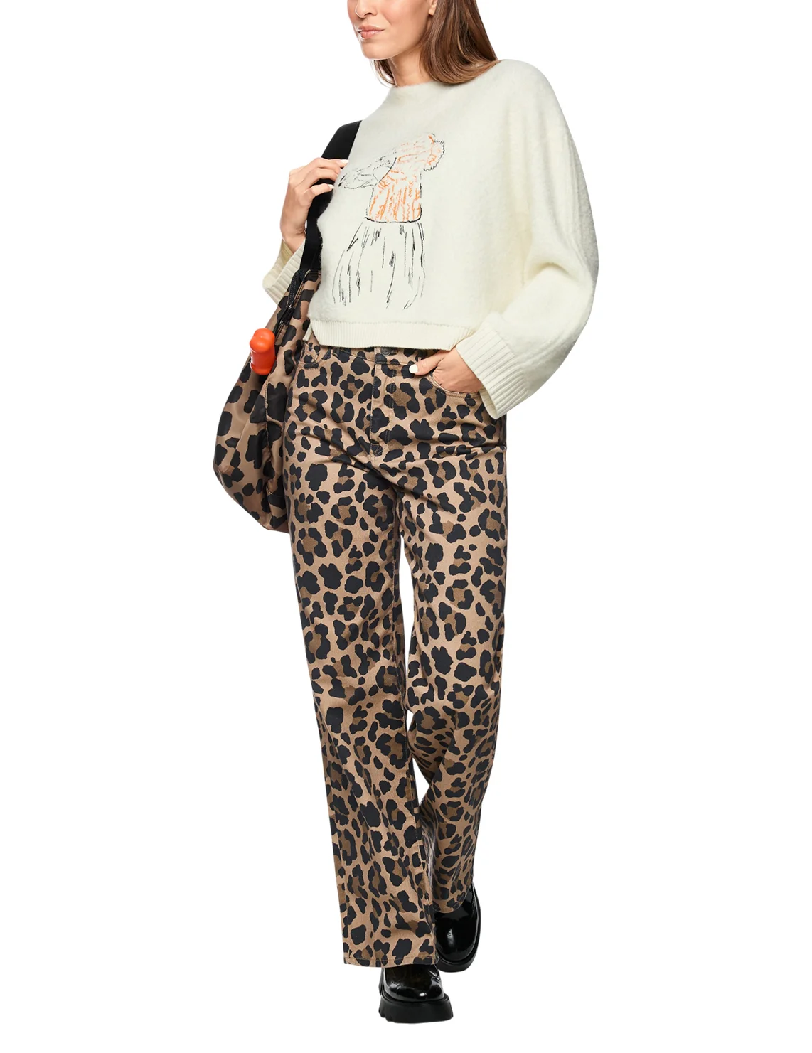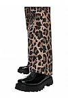Джинси виготовлені з бавовни та еластану. Модель виконана у вільному крої. Має петлі для ременя, потаємну застібку-блискавку з ґудзиком, дві бічні прорізні та дві задні накладні кишені. Декоровані анімалістичним принтом.