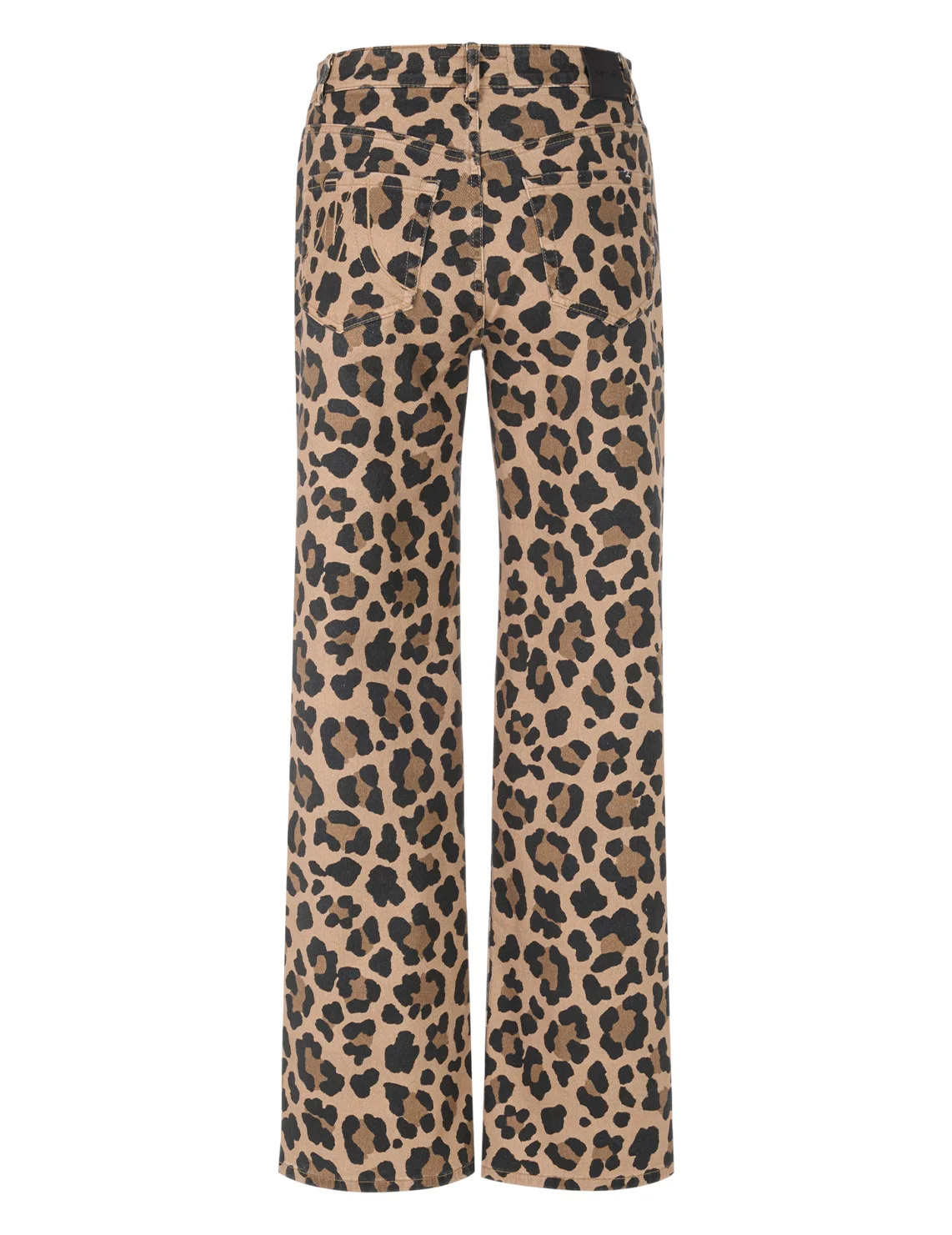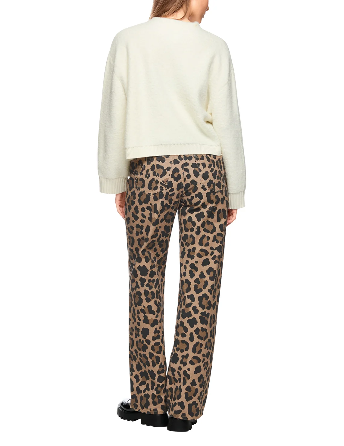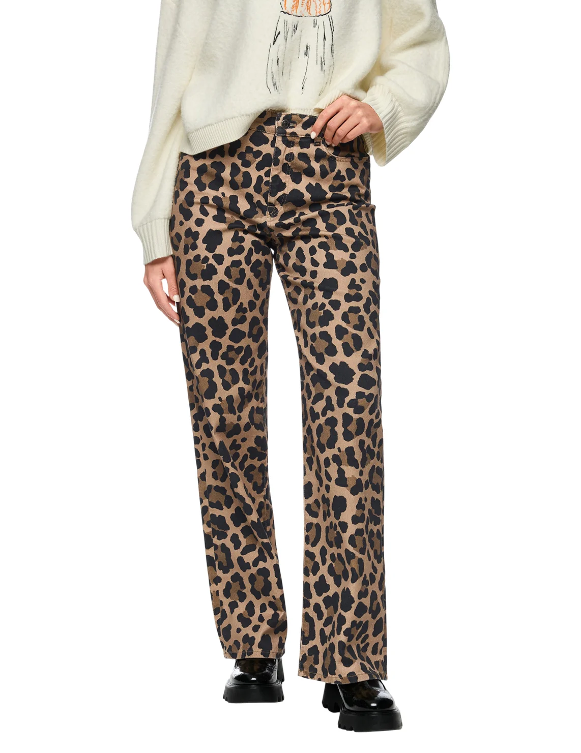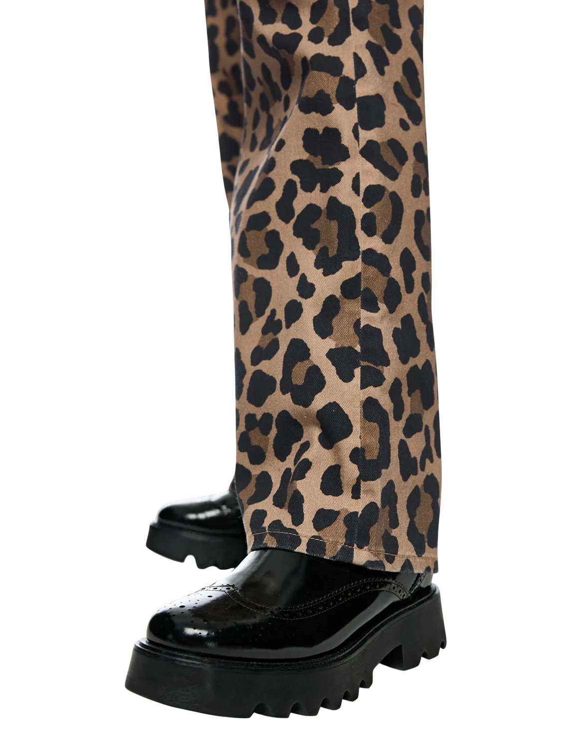 Джинси виготовлені з бавовни та еластану. Модель виконана у вільному крої. Має петлі для ременя, потаємну застібку-блискавку з ґудзиком, дві бічні прорізні та дві задні накладні кишені. Декоровані анімалістичним принтом.
