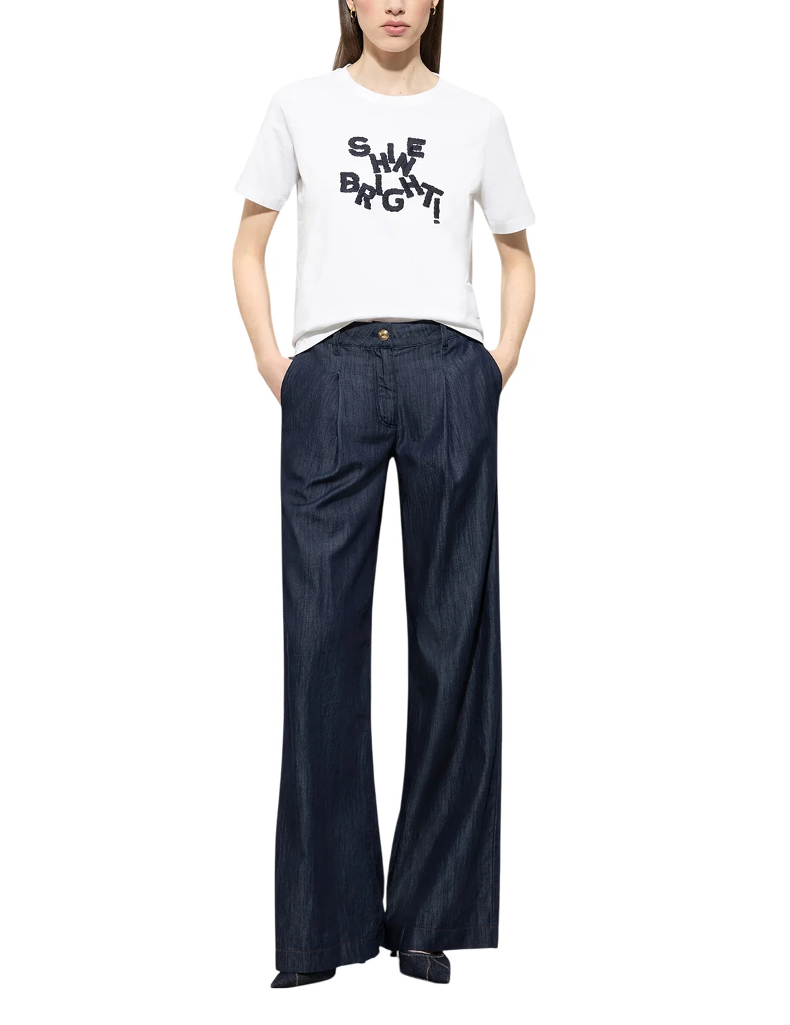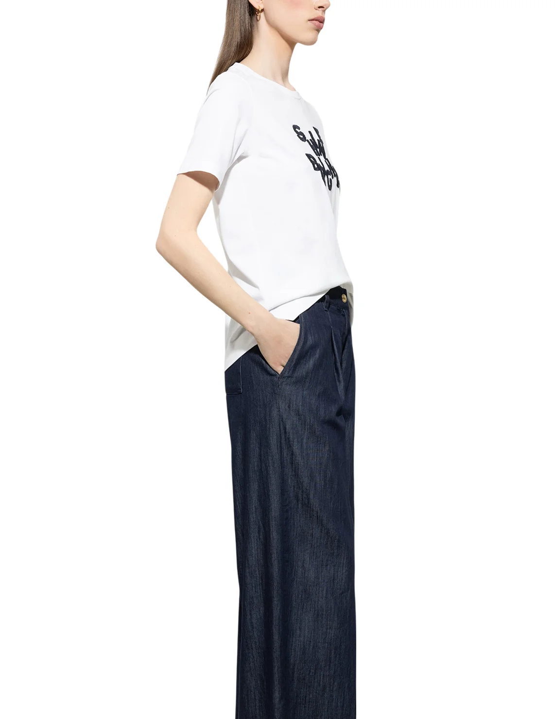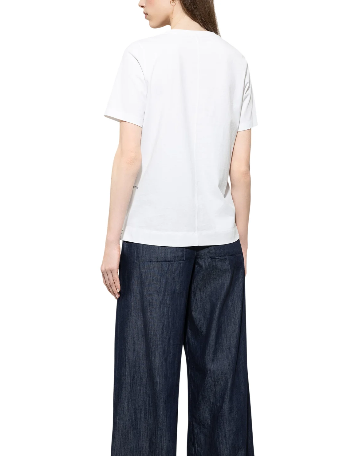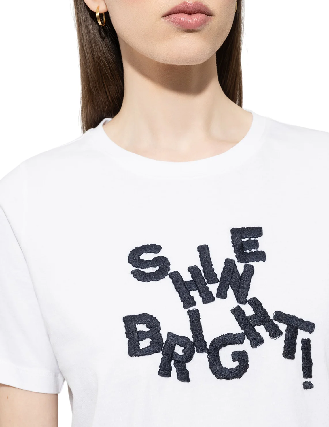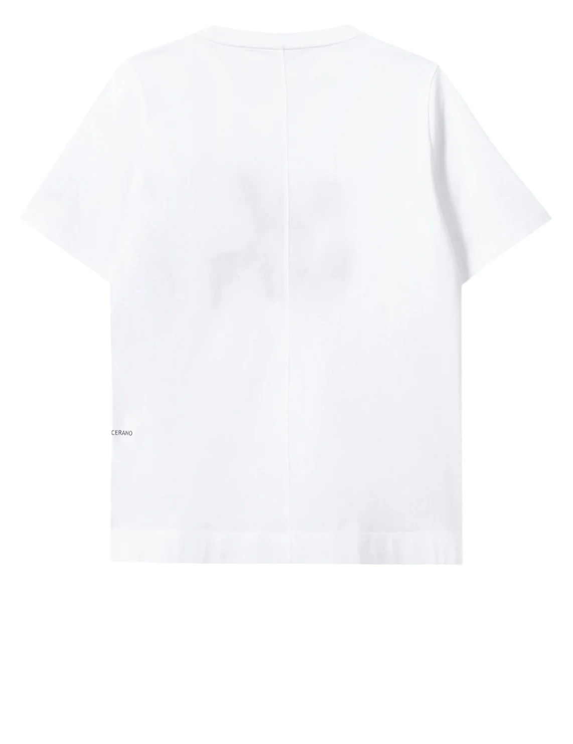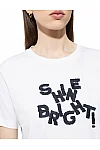 Футболка виготовлена зі 100% бавовни високої якості. Модель виконана у вільному крої. Має круглий виріз горловини та короткі рукави. Декорована принтом із логотипом бренду та оригінальною вишивкою.