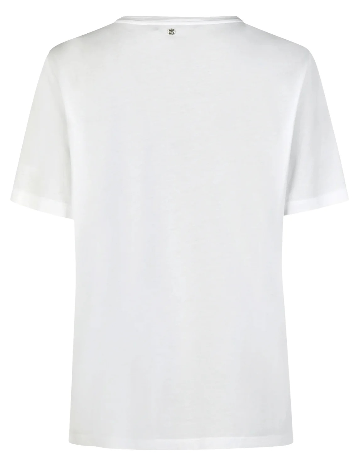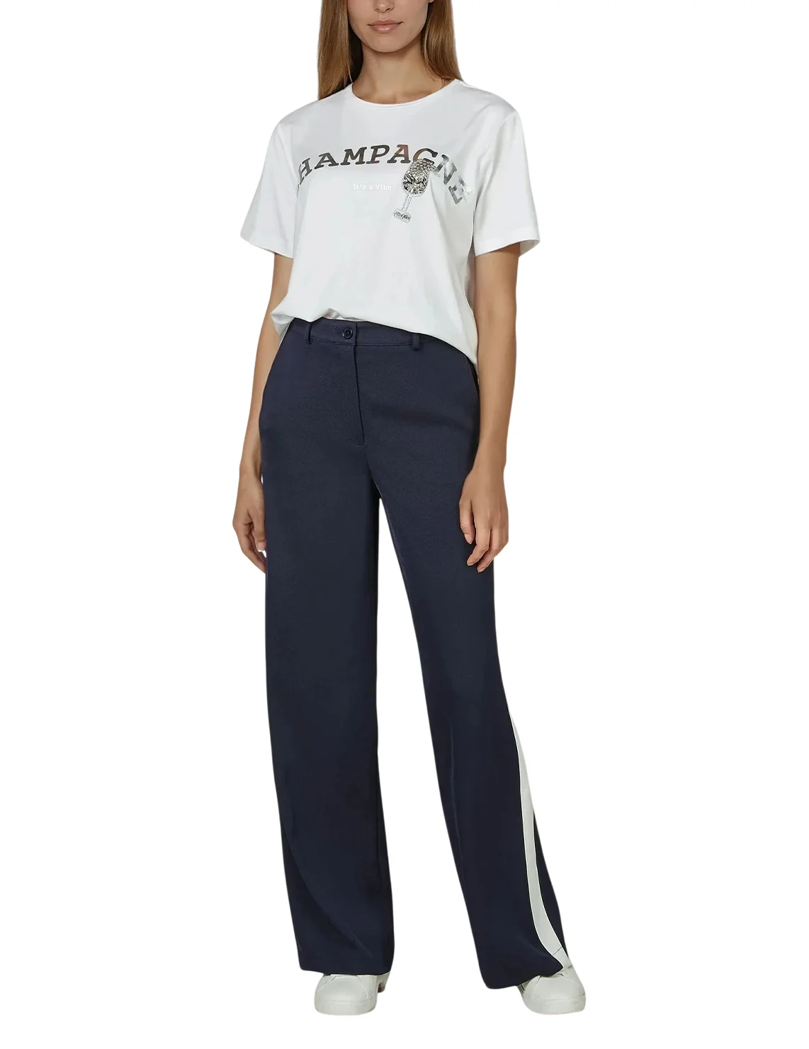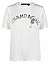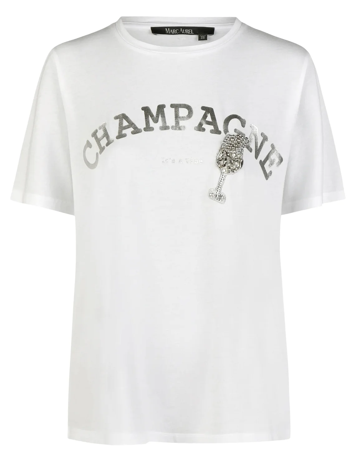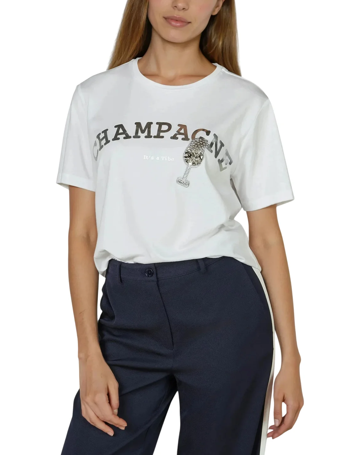Футболка виготовлена з модалу та бавовни. Модель виконана в прямому крої. Має круглий виріз горловини та короткі рукави. Декорована оригінальним принтом та аплікацією з намистин, каміння та страз.