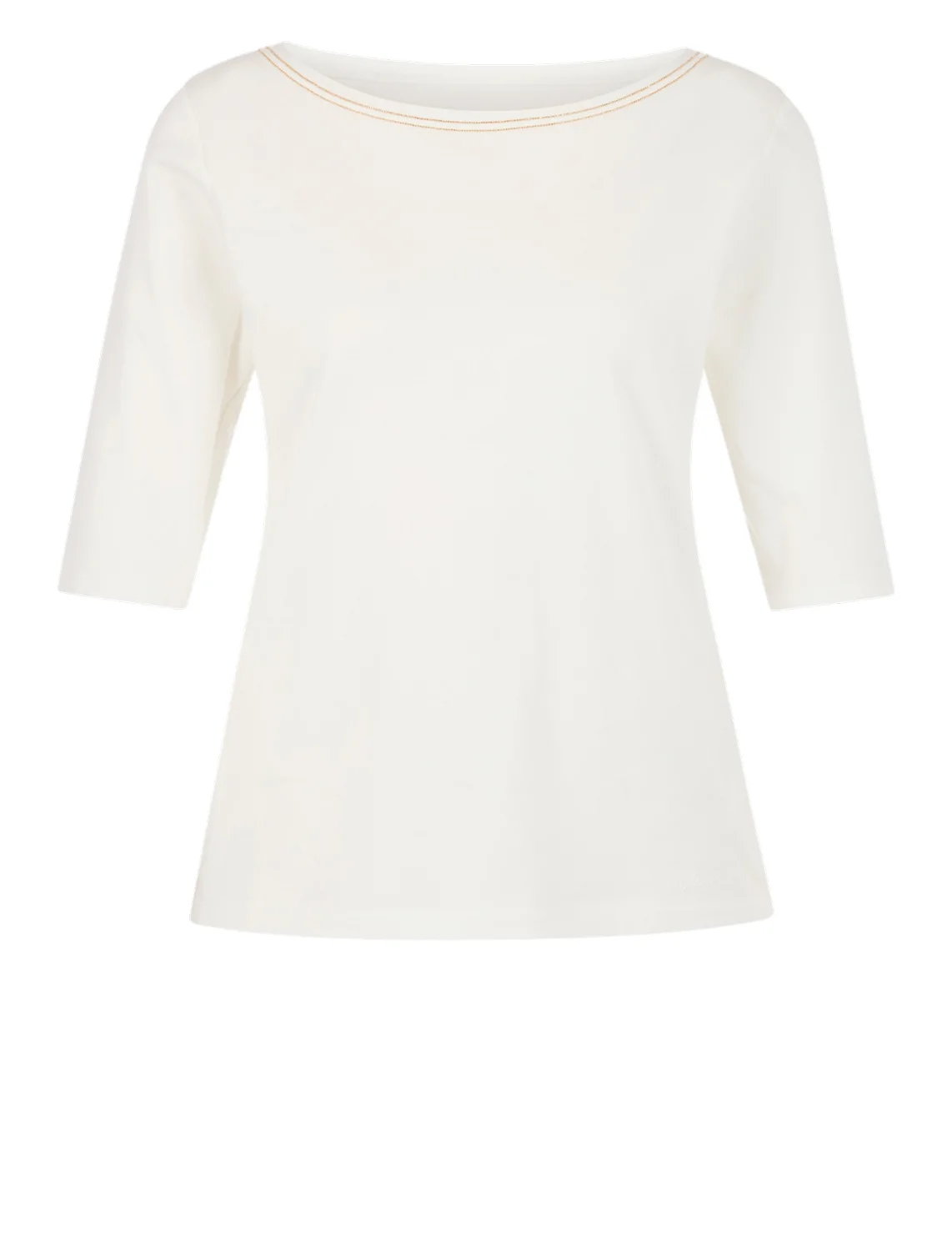 Футболка виготовлена з бавовни та еластану. Модель виконана в прямому крої. Має круглий виріз горловини, принт із логотипом бренду та рукави довжиною 3/4. Виріз горловини прикрашений декоративною стрічкою.