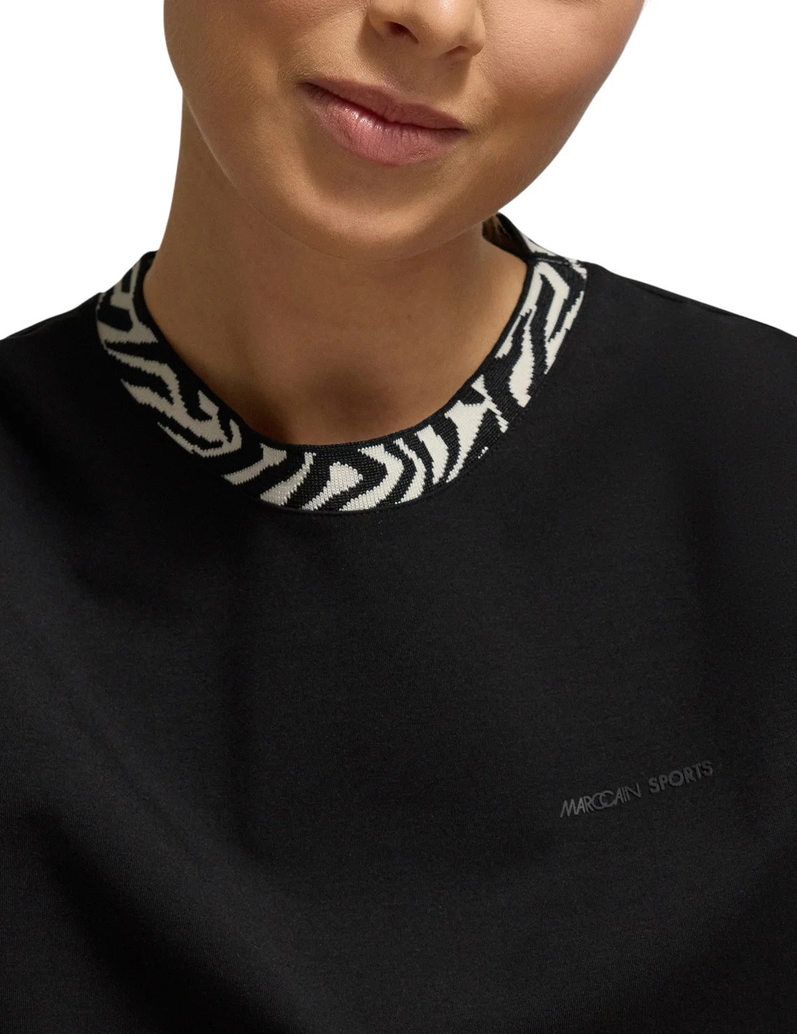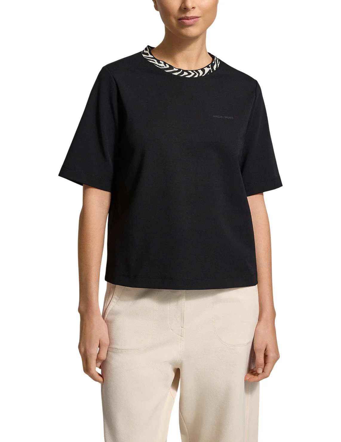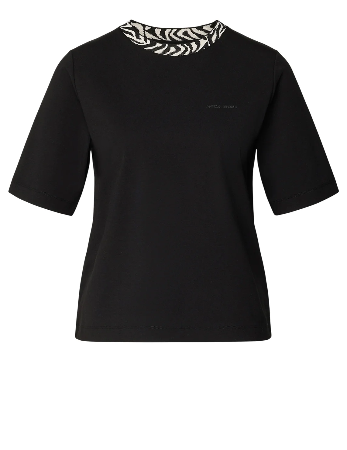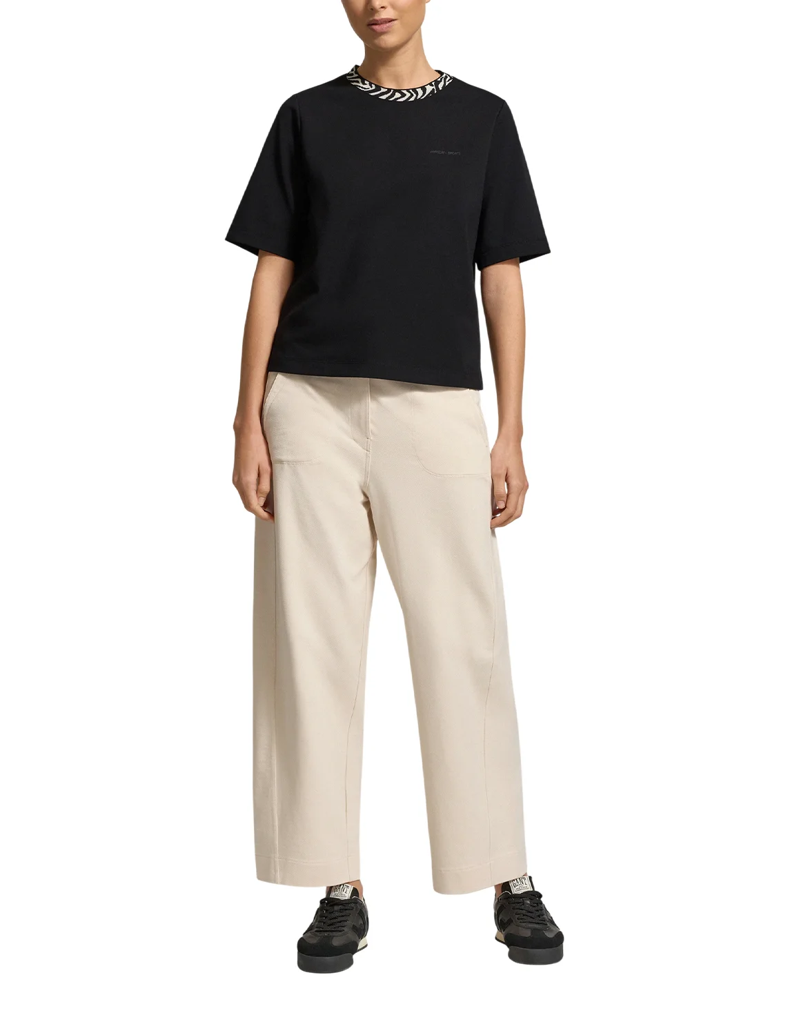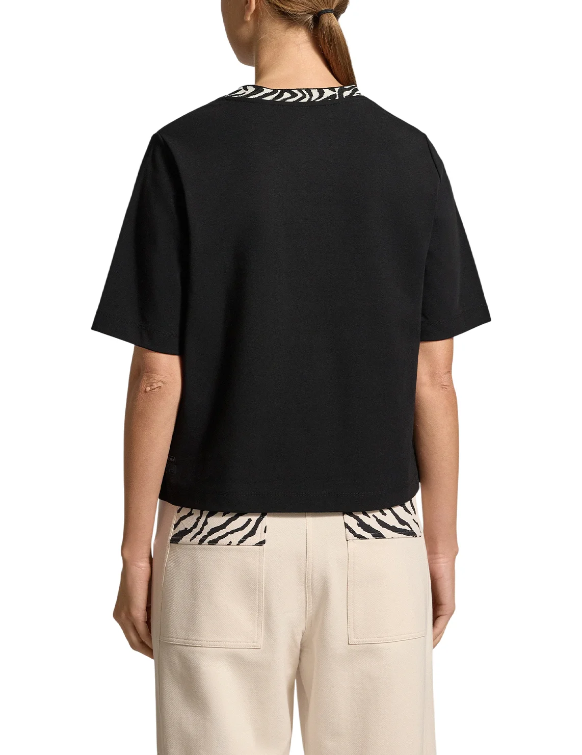 Футболка виготовлена з бавовни, модалу й еластану. Модель виконана в прямому крої. Має круглий виріз горловини та короткі рукави. Декорована анімалістичним принтом та логотипом бренду.