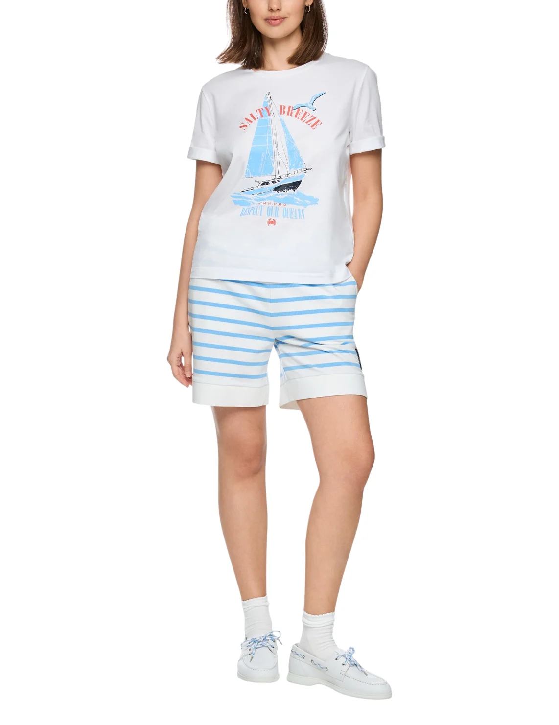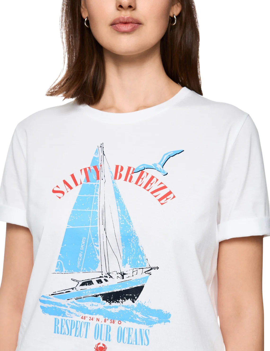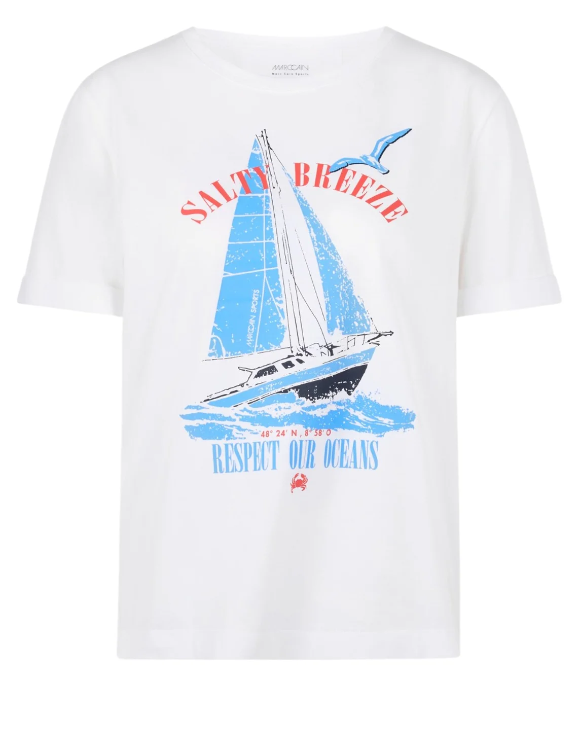Футболка виготовлена зі 100% бавовни. Модель виконана у прямому крої. Має круглий виріз горловини і короткі рукави. Декорована оригінальним морським принтом.