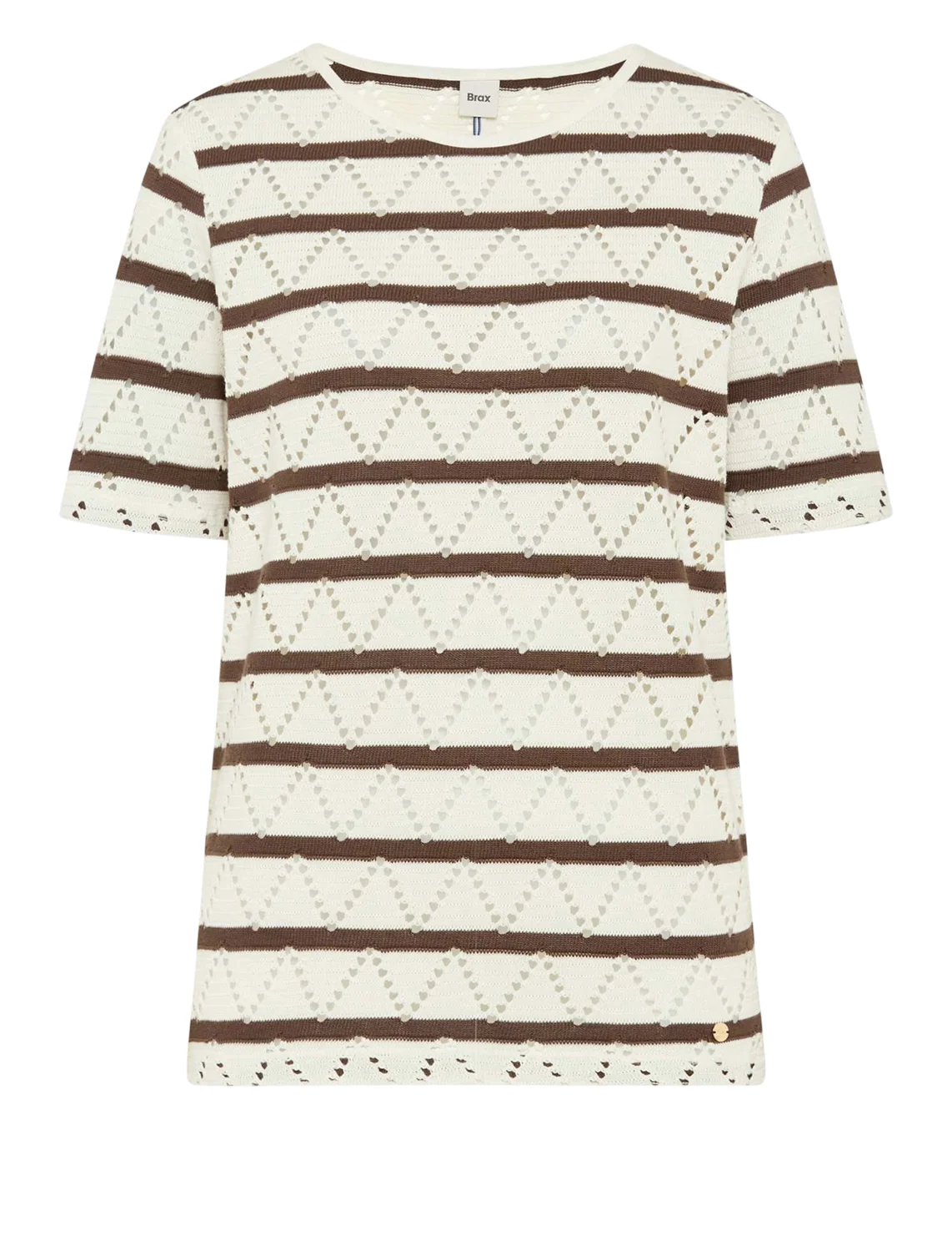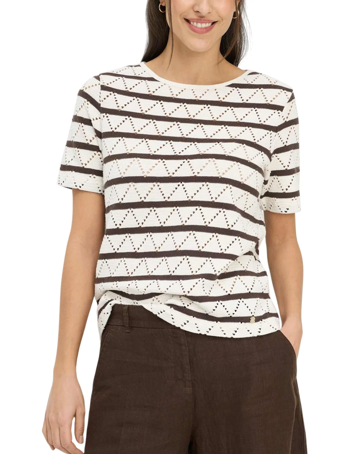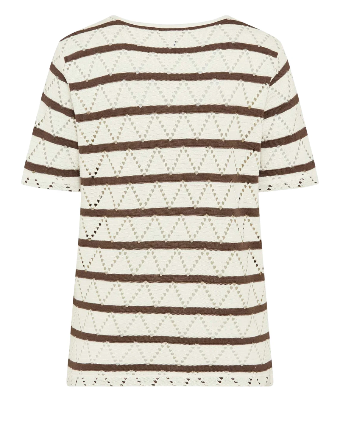 Футболка виготовлена із 100% бавовни. Модель виконана у широкому крої. Має круглий виріз горловини, короткі рукави. Декорована перфорацією та принтом у коричневу смужку.