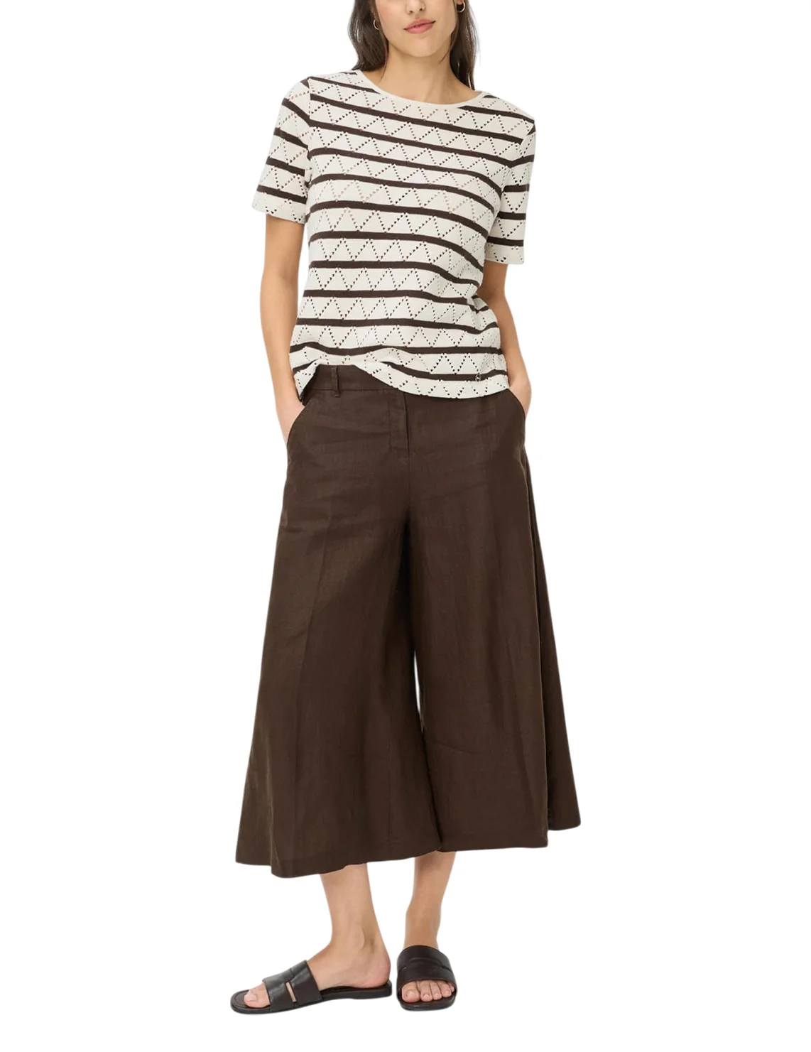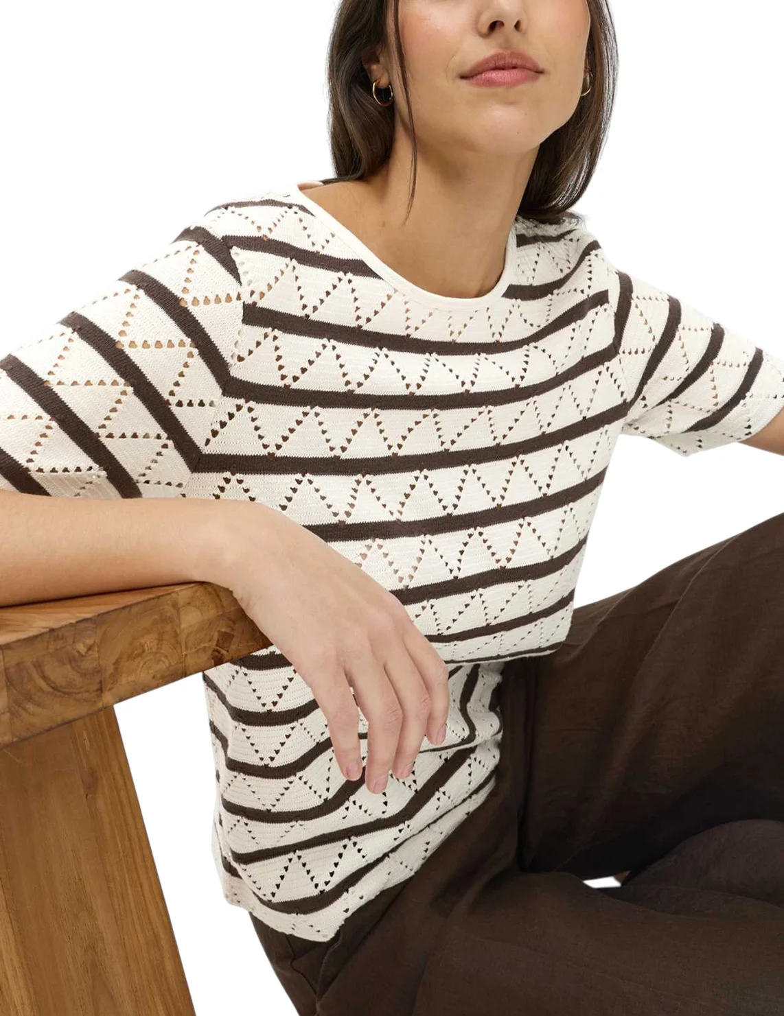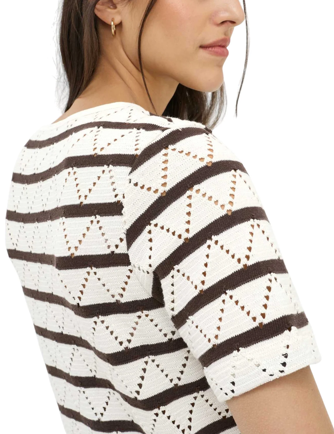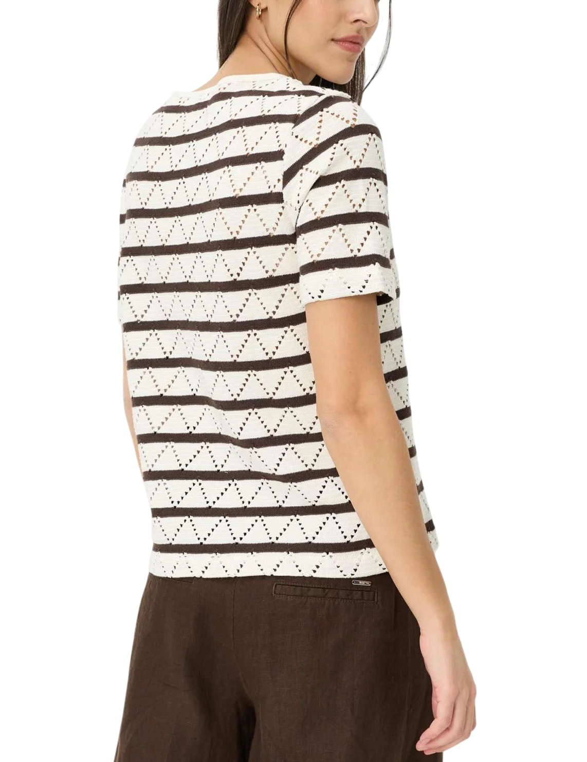 Футболка виготовлена із 100% бавовни. Модель виконана у широкому крої. Має круглий виріз горловини, короткі рукави. Декорована перфорацією та принтом у коричневу смужку.