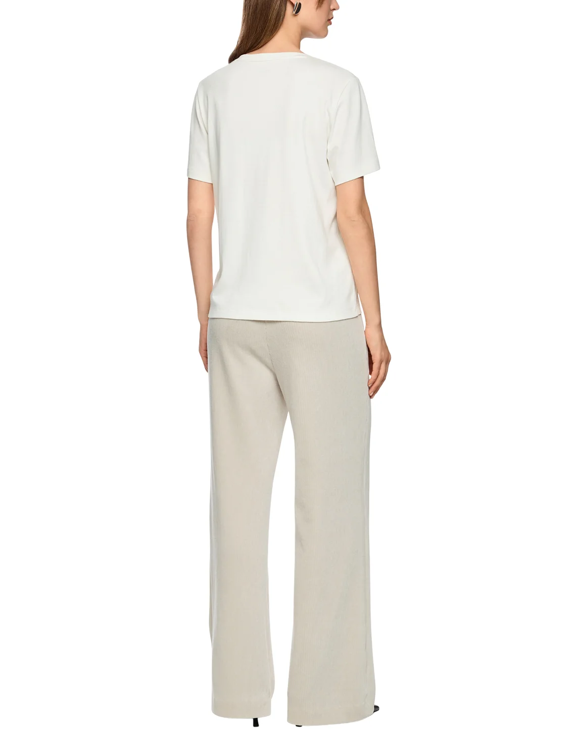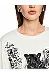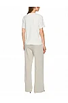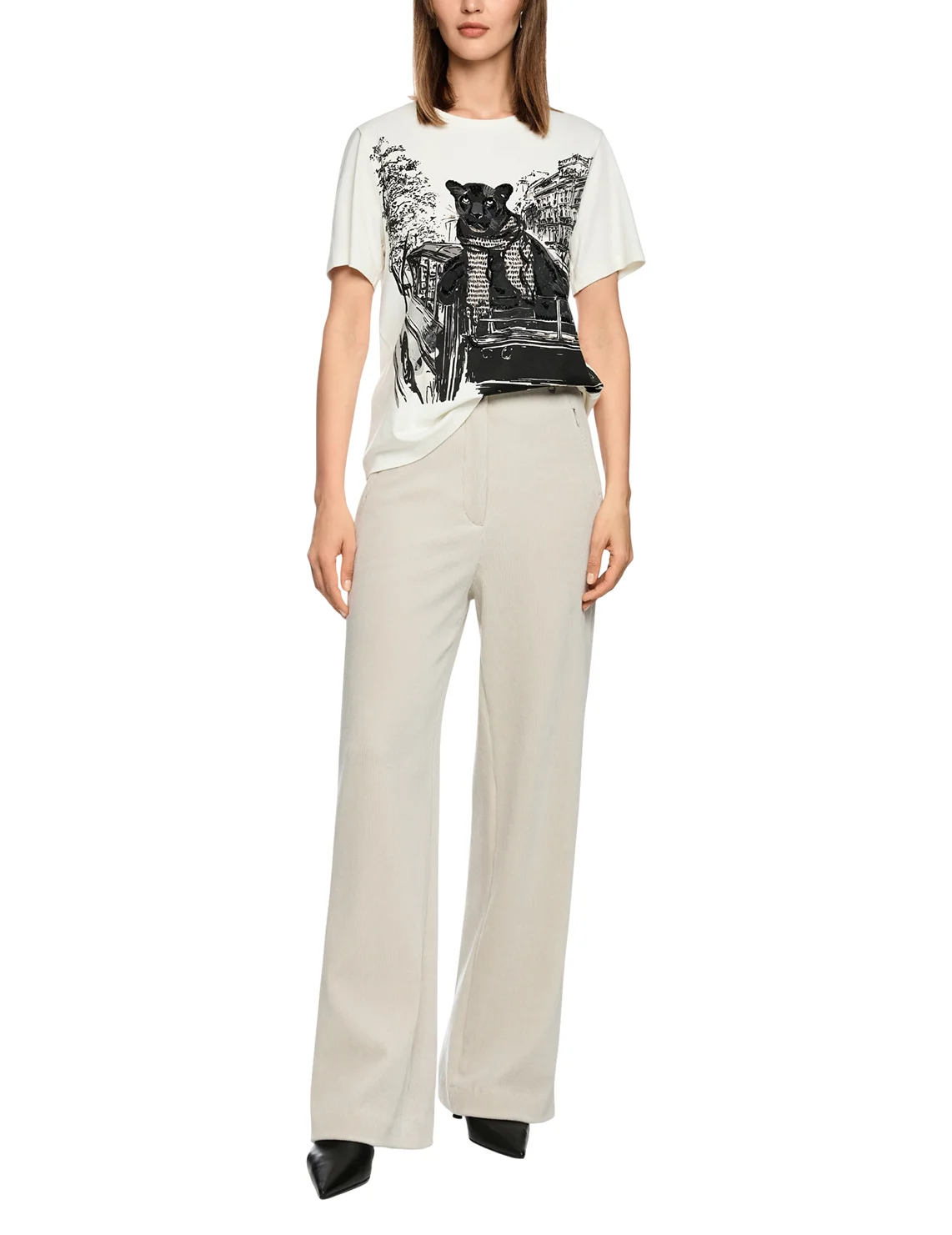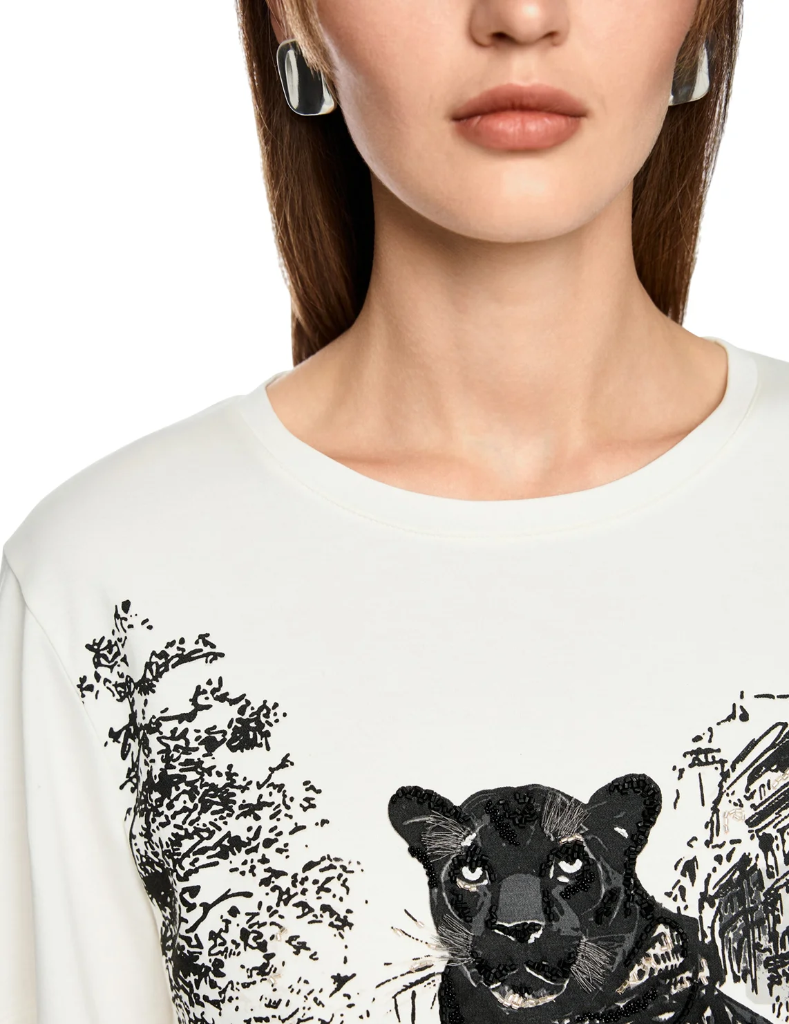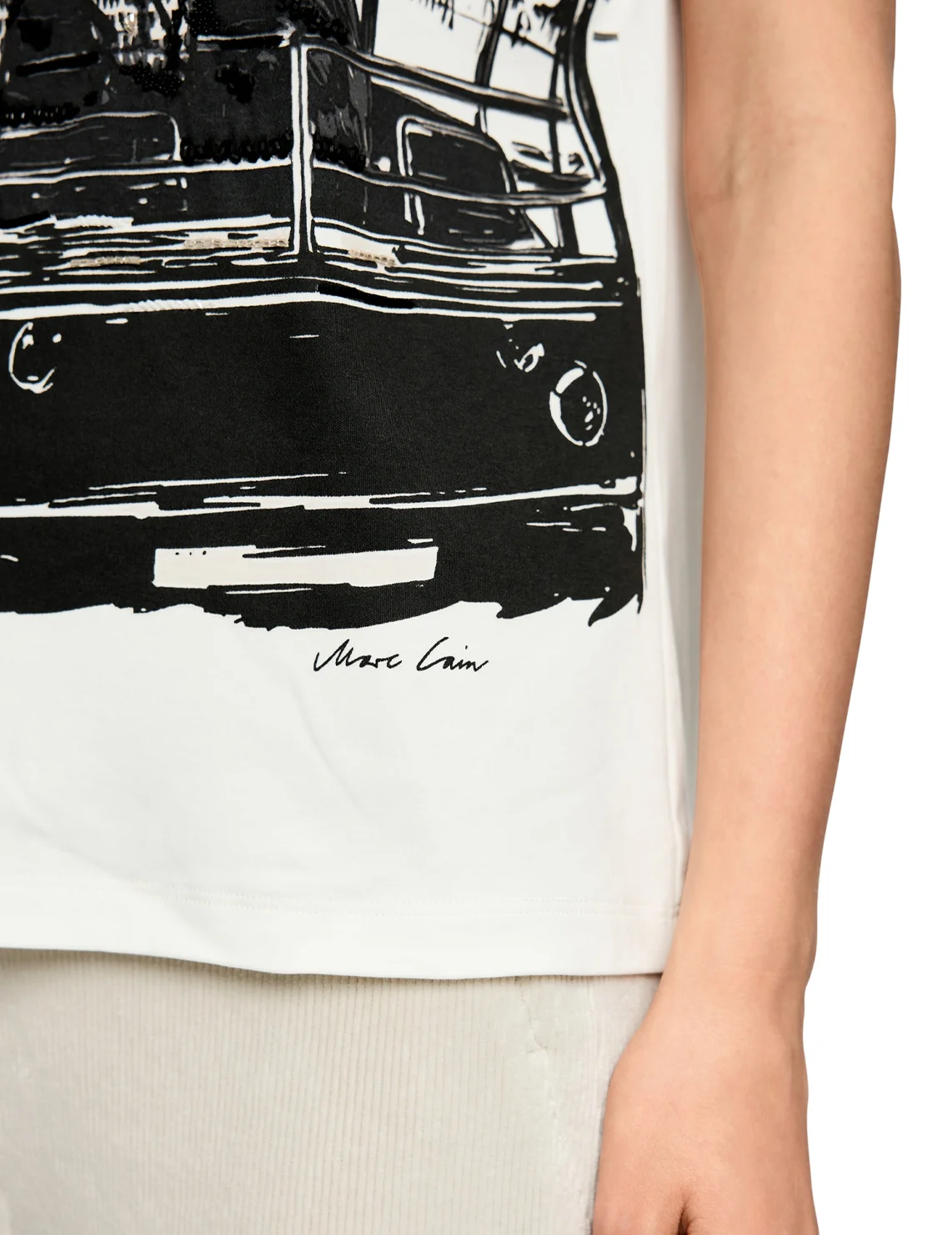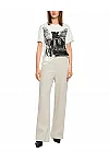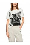 Футболка виготовлена зі 100% бавовни високої якості. Модель виконана у вільному крої. Має круглий виріз горловини та короткі рукави. Декорована оригінальним принтом і намистинами.